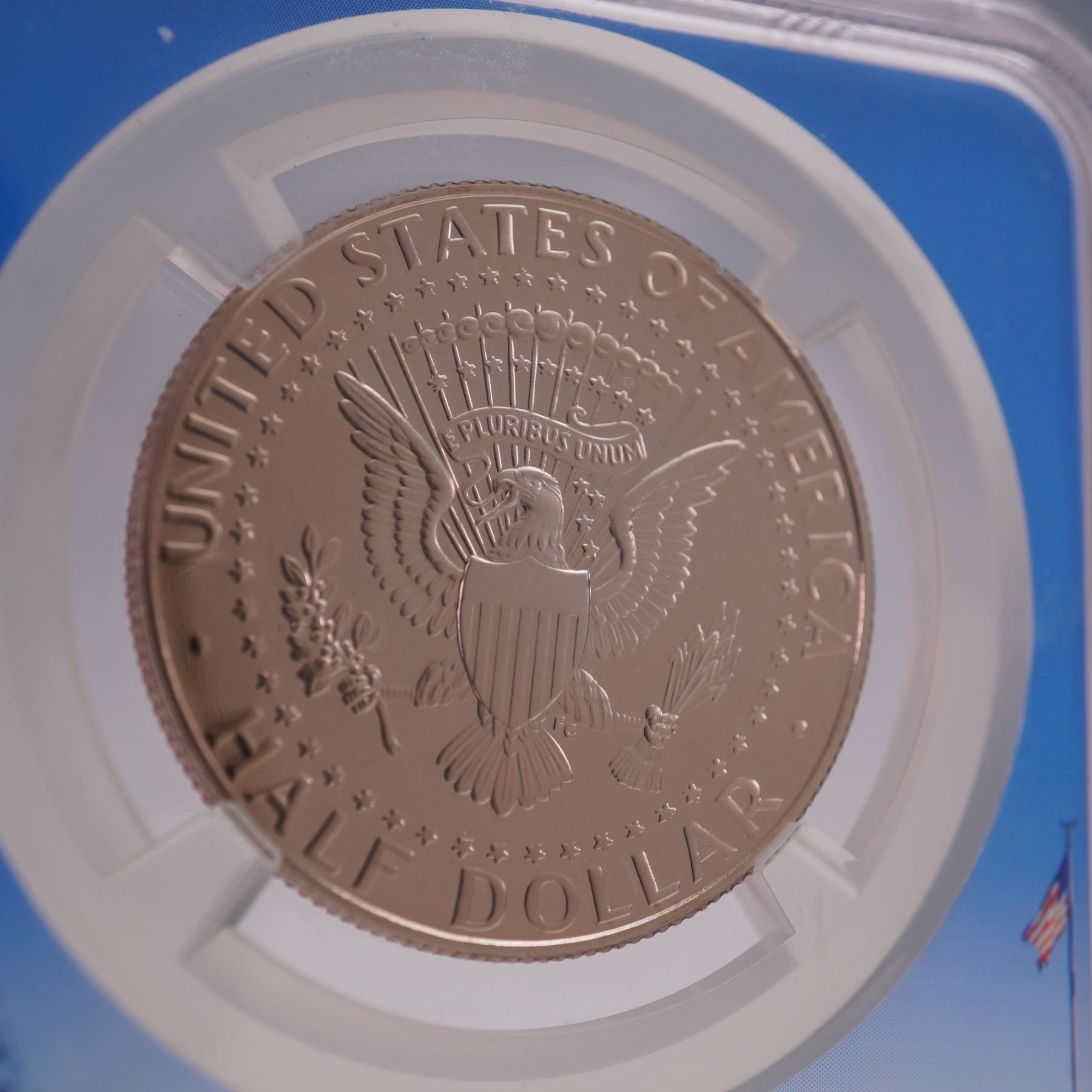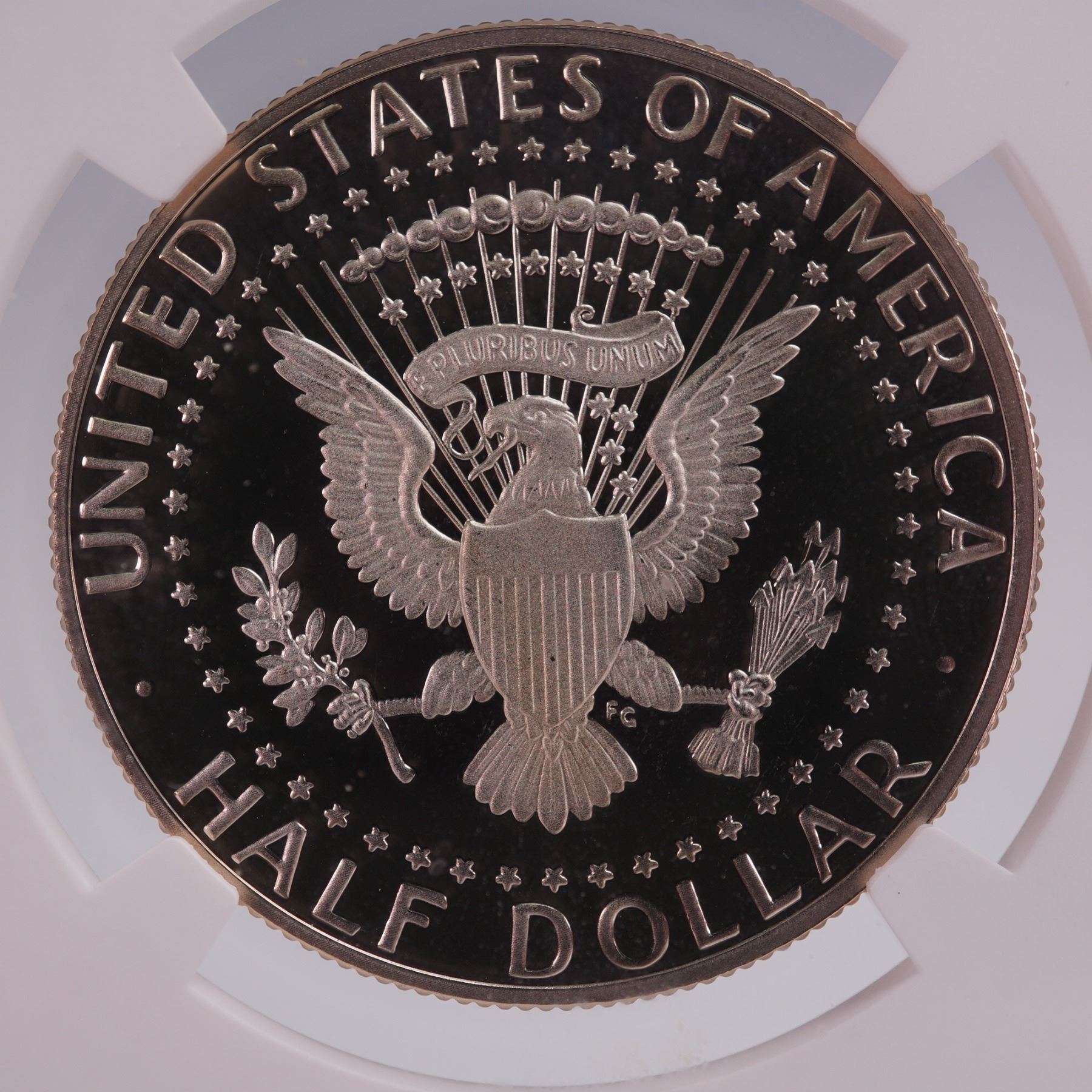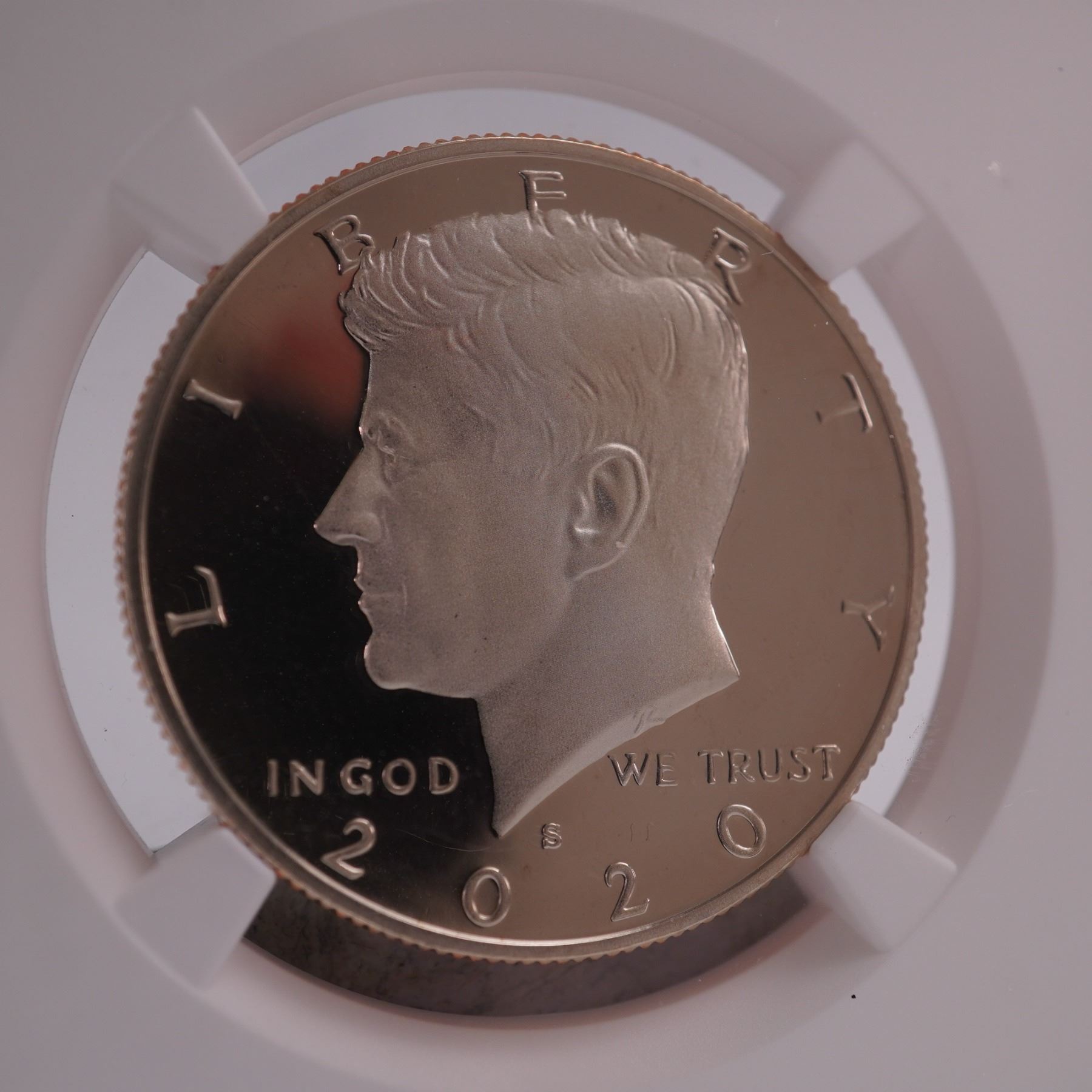 This two-coin lot features a pair of NGC-certified Silver Kennedy Half Dollars from 1999 and 2020, each struck to proof standards with exceptional detail and contrast. The first coin is a 1999-S Silver Kennedy Half Dollar graded PF 70 Ultra Cameo by NGC. Composed of Silver (.900), this flawless proof displays a deeply mirrored field and sharply frosted design elements. The obverse shows the bust of President John F. Kennedy with inscriptions LIBERTY, IN GOD WE TRUST, S, and the date 1999, engraved by Gilroy Roberts. The reverse features the American Presidential Coat of Arms with a heraldic eagle holding an olive branch and arrows, and a scroll inscribed with E PLURIBUS UNUM. Surrounding the eagle are the inscriptions UNITED STATES OF AMERICA and HALF DOLLAR. The reverse was engraved by Frank Gasparro. The second coin is a 2020-S Silver Kennedy Half Dollar graded PF 69 Ultra Cameo by NGC. Struck in Silver (.999), it was issued as part of the 10-Coin Silver Proof Set and labeled First Day of Issue. The obverse depicts a left-facing portrait of John F. Kennedy, with inscriptions LIBERTY, GR, IN GOD WE TRUST, S, and the date 2020. Like the earlier piece, it was designed and engraved by Gilroy Roberts. The reverse shows a modified presidential seal: a bald eagle with a shield on its chest, grasping an olive branch and a bundle of thirteen arrows, and a scroll with the Latin phrase E PLURIBUS UNUM in its beak. A ring of fifty stars surrounds the design. Lettering includes UNITED STATES OF AMERICA, E PLURIBUS UNUM, FG, and HALF DOLLAR. The reverse was designed and engraved by Frank Gasparro. Both coins are encapsulated in NGC holders with custom Kennedy-themed labels and display a high degree of visual appeal.