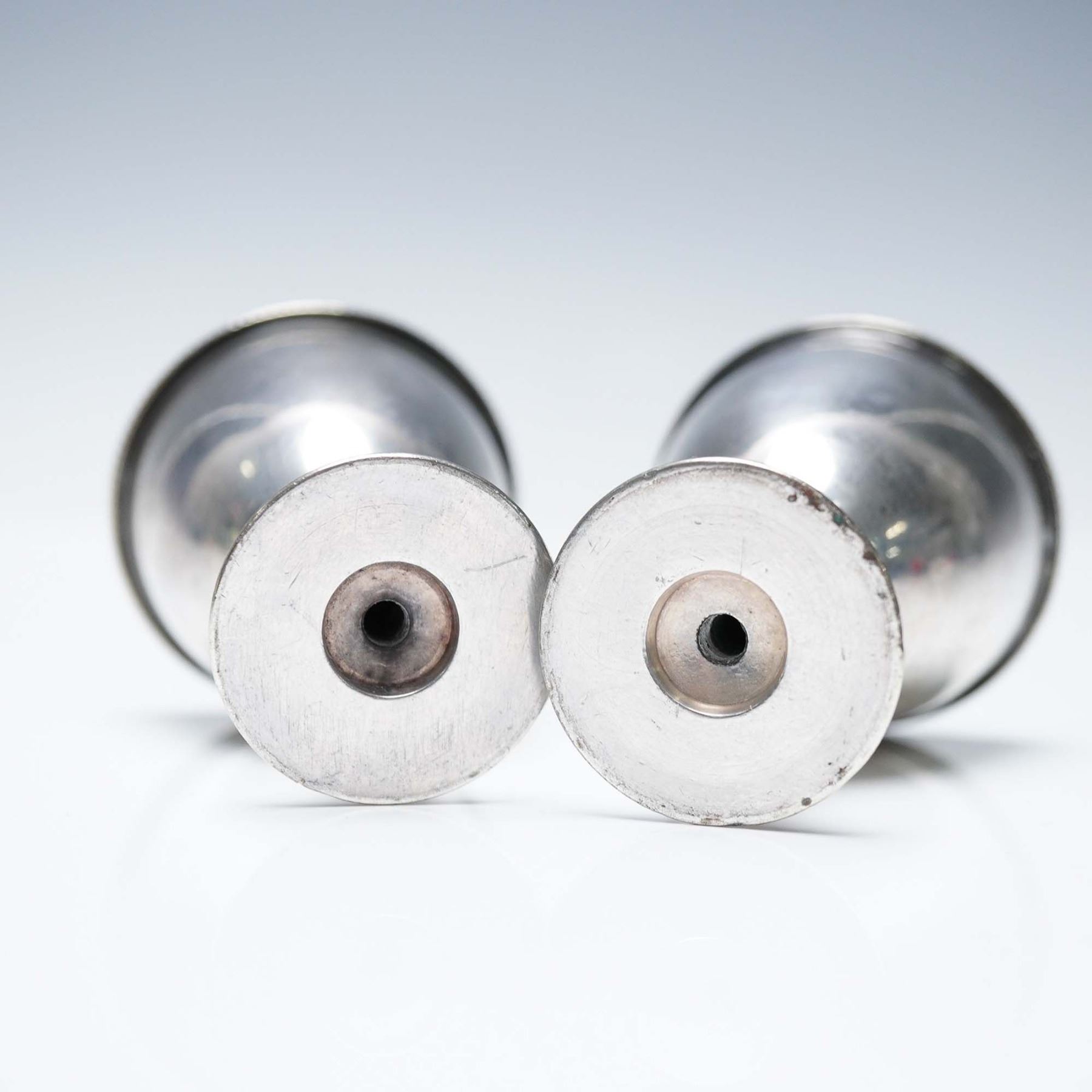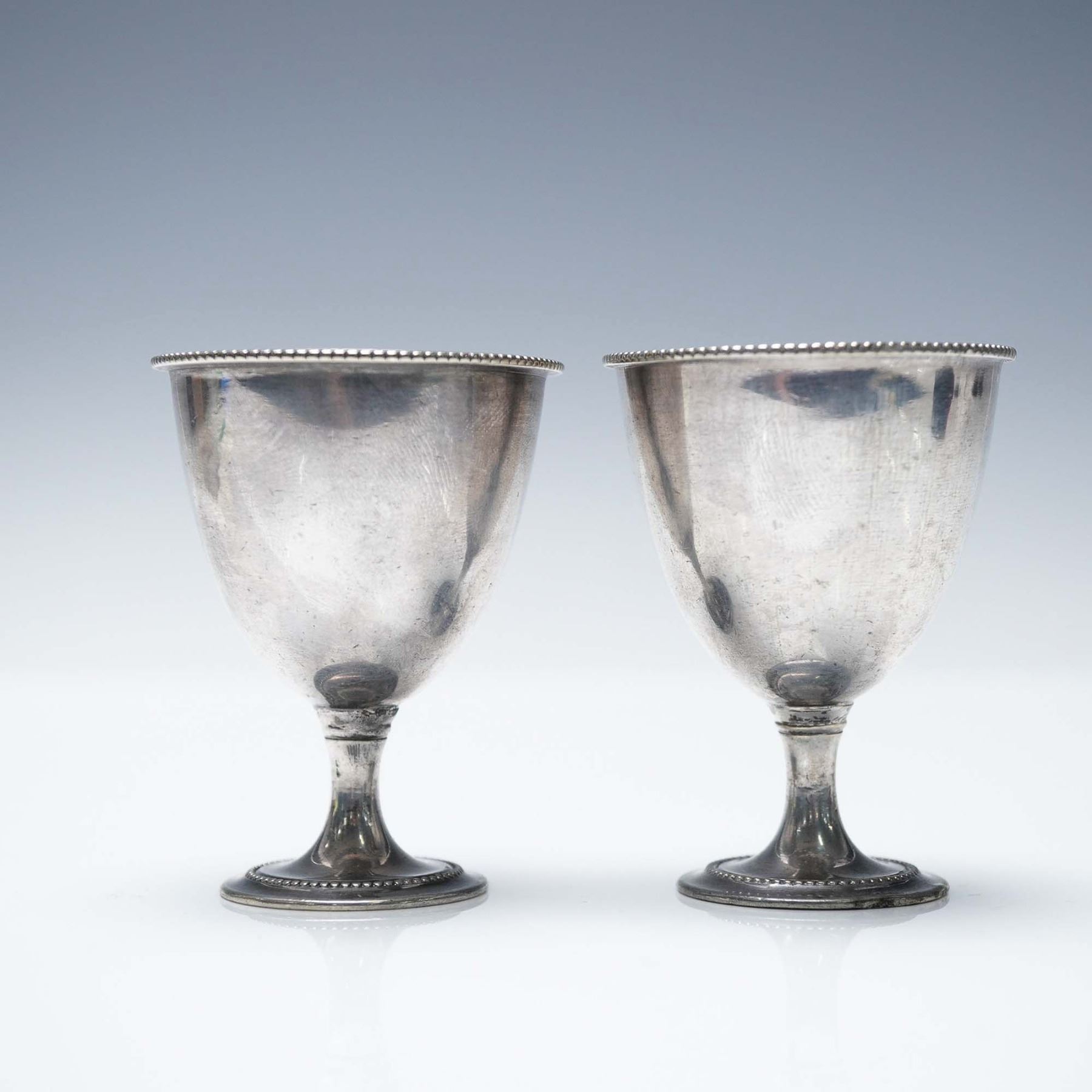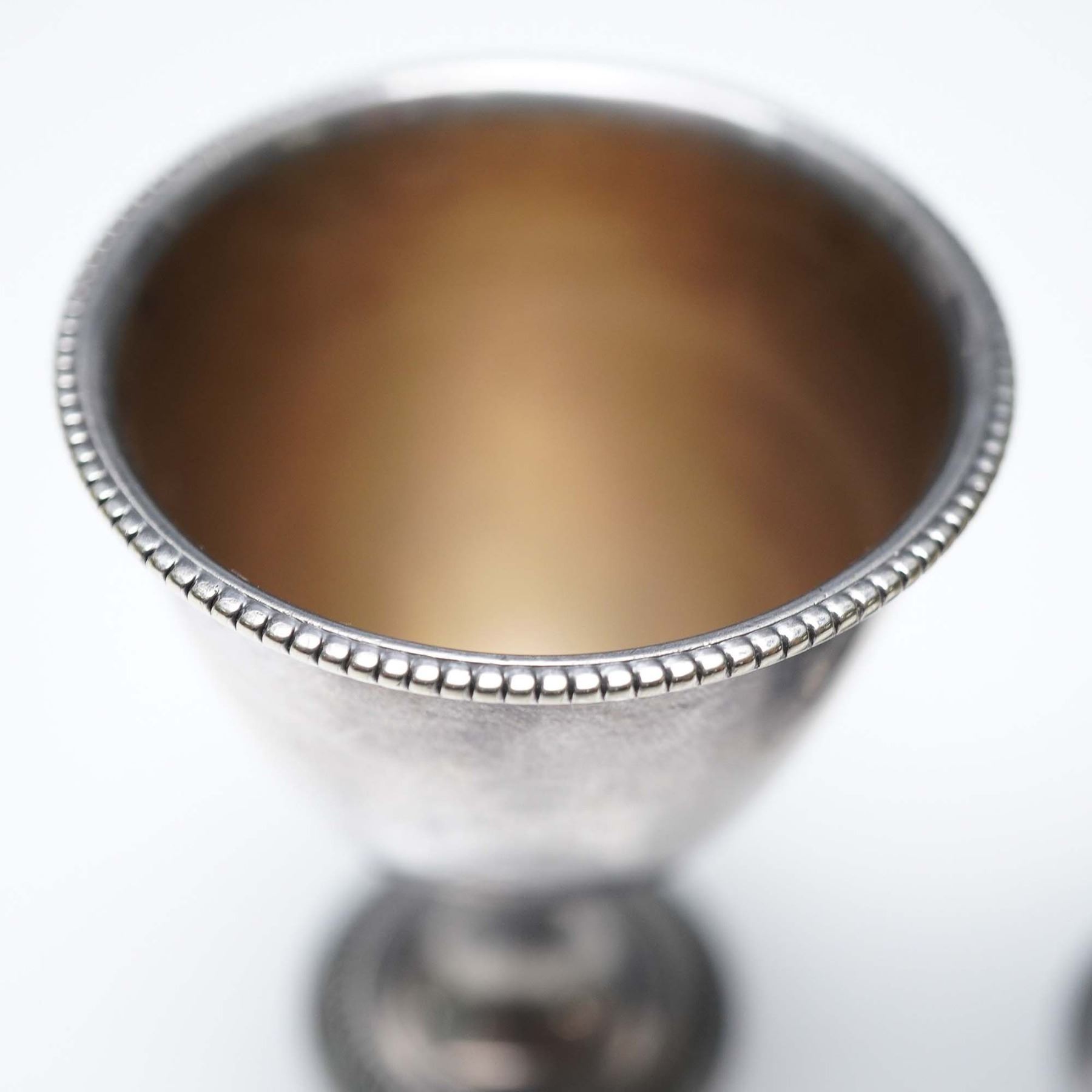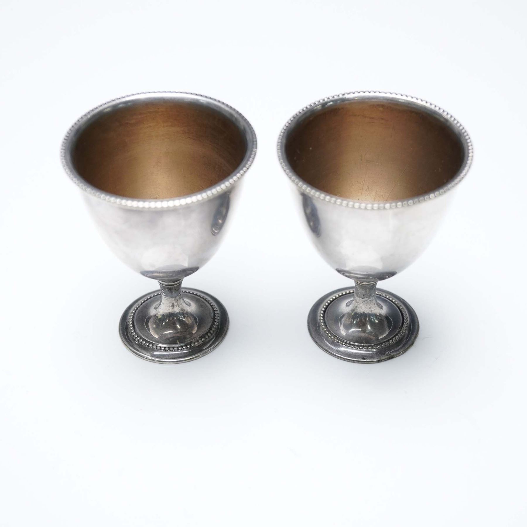 A pair of silver-plated egg cups featuring a classic beaded rim and pedestal base design. Each cup measures 2.5"H x 2" in diameter. The interiors have a subtle gold wash, adding a touch of elegance. A charming addition to any silver collection or breakfast table.