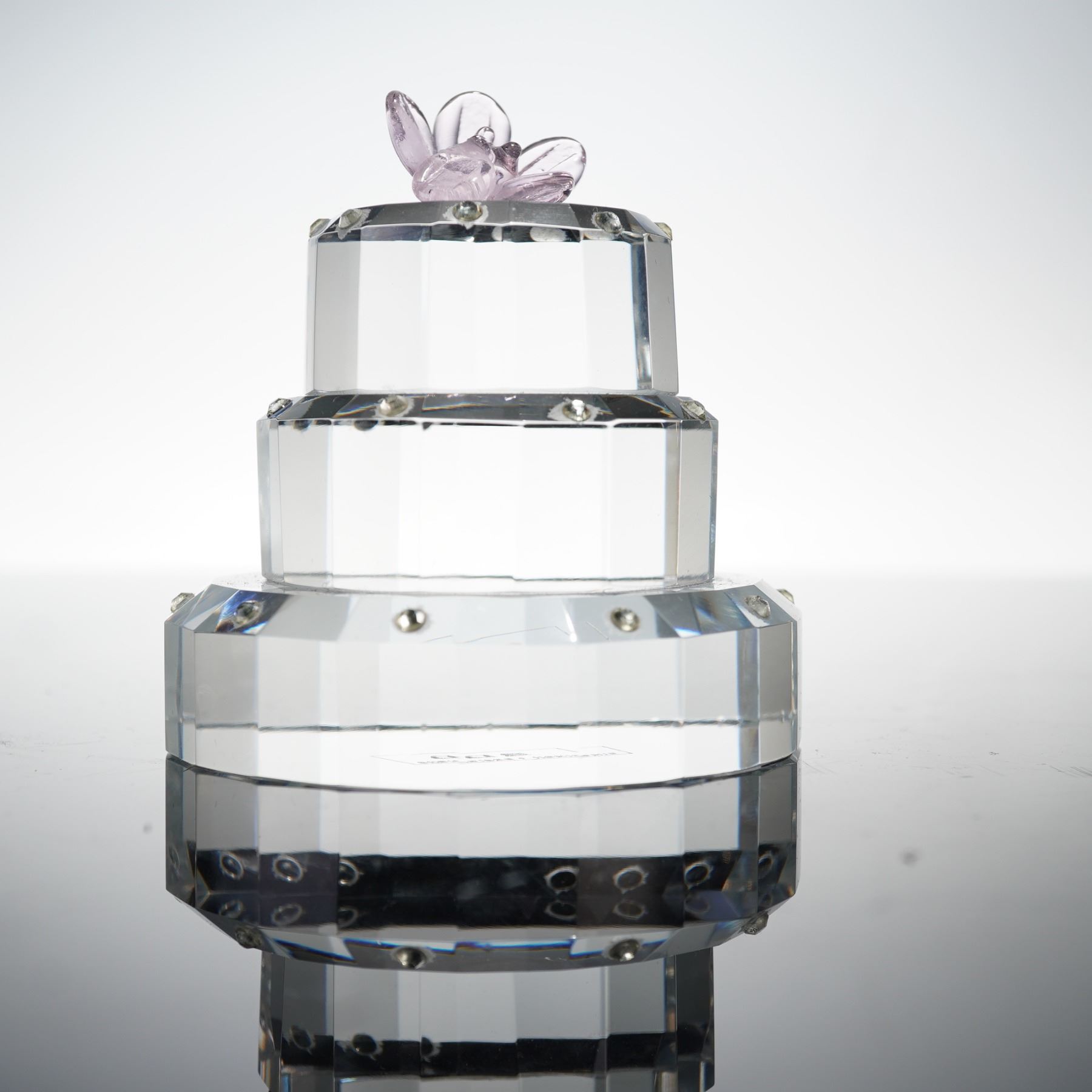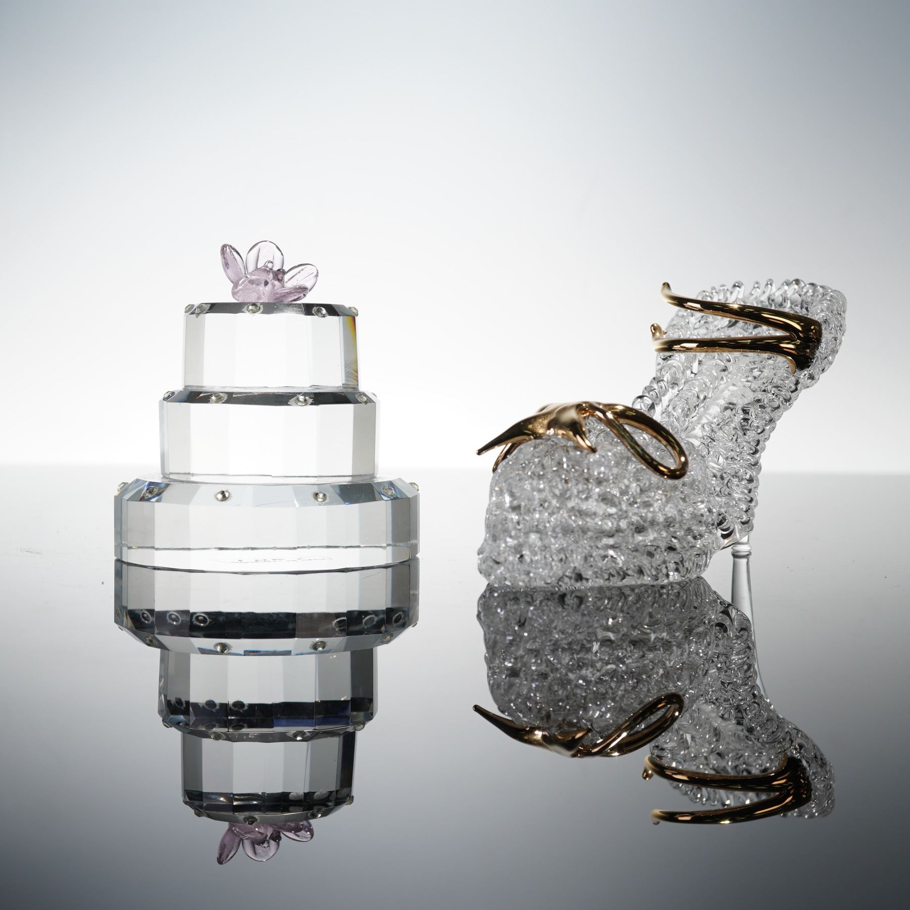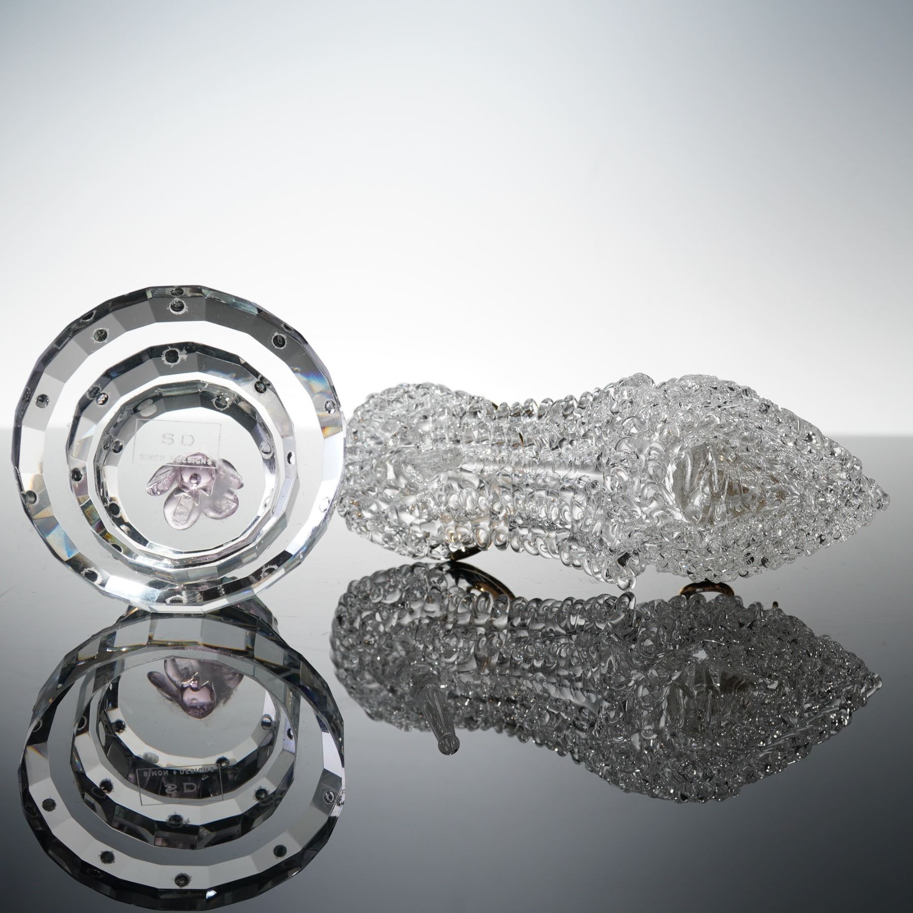 A charming duo of clear crystal figures by Simon Designs, including a three-tiered birthday cake with a faceted finish, detailed with a lilac glass flower topper, and a high-heeled stiletto ornament featuring textured glass and gilt metal accents. Both pieces are etched to the base with the Simon Designs mark.