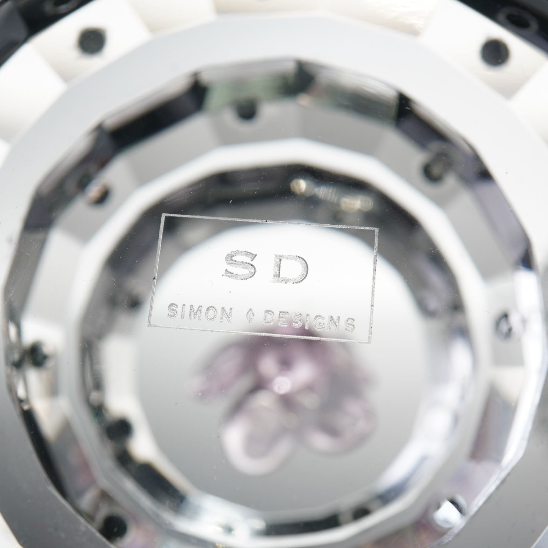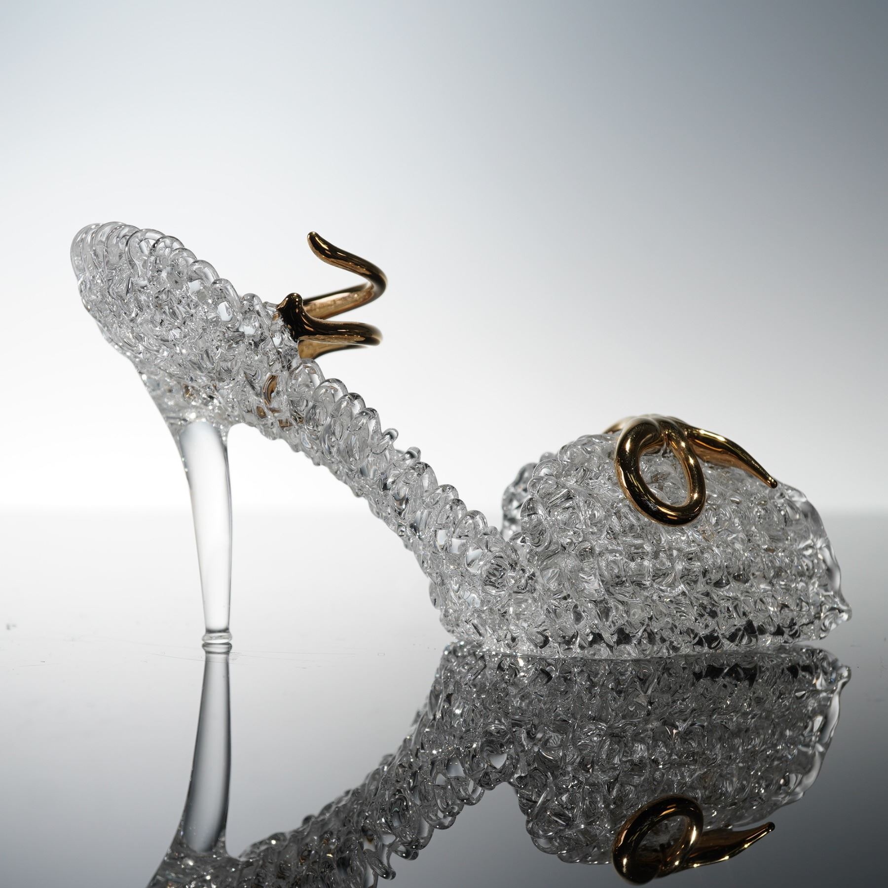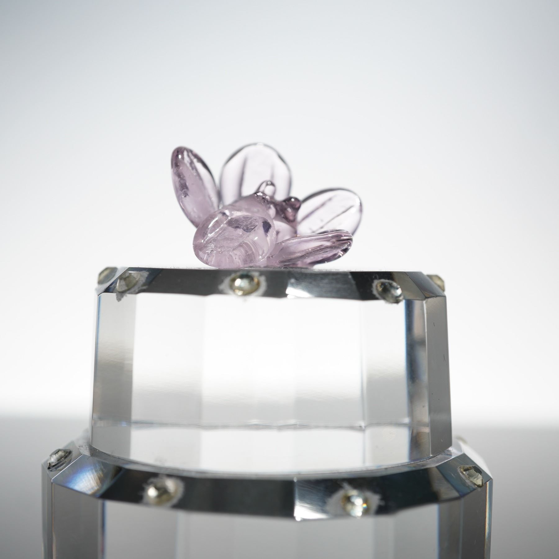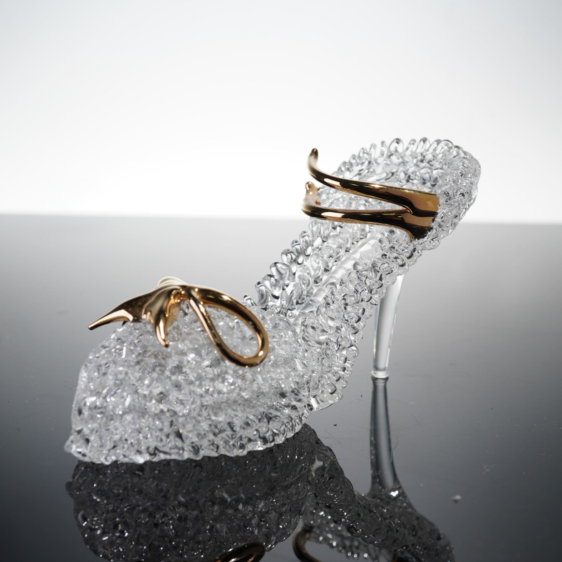A charming duo of clear crystal figures by Simon Designs, including a three-tiered birthday cake with a faceted finish, detailed with a lilac glass flower topper, and a high-heeled stiletto ornament featuring textured glass and gilt metal accents. Both pieces are etched to the base with the Simon Designs mark.