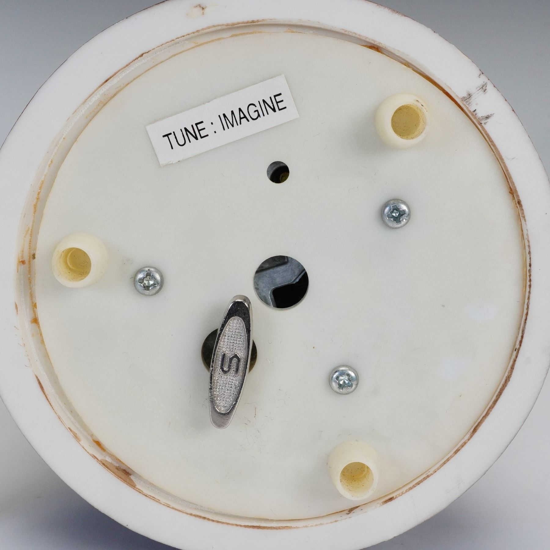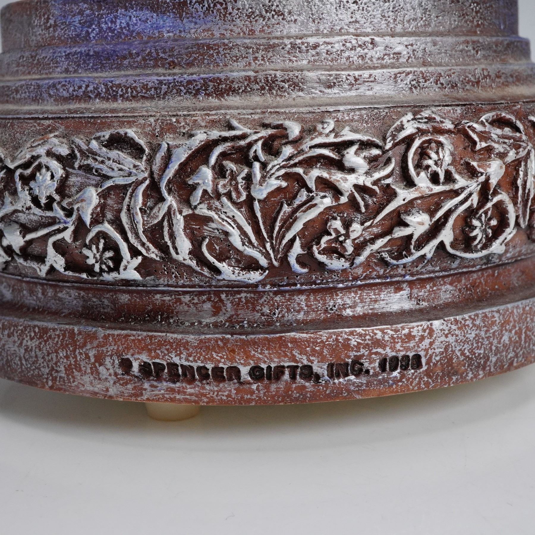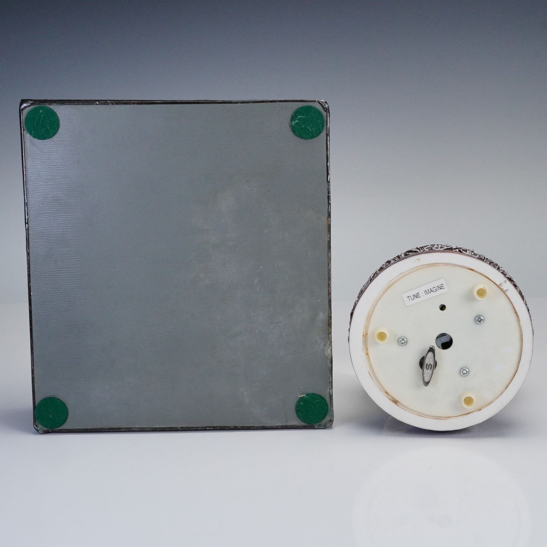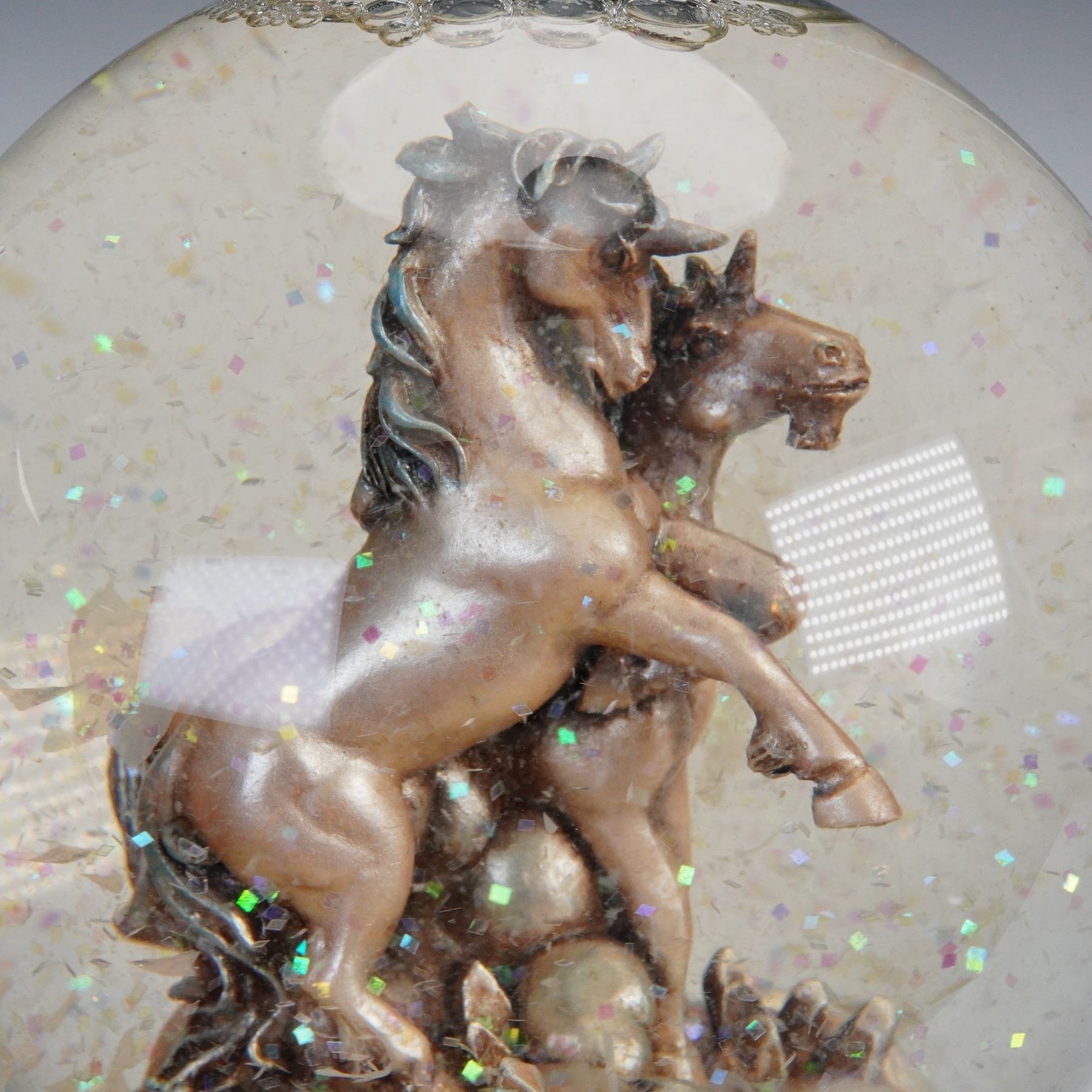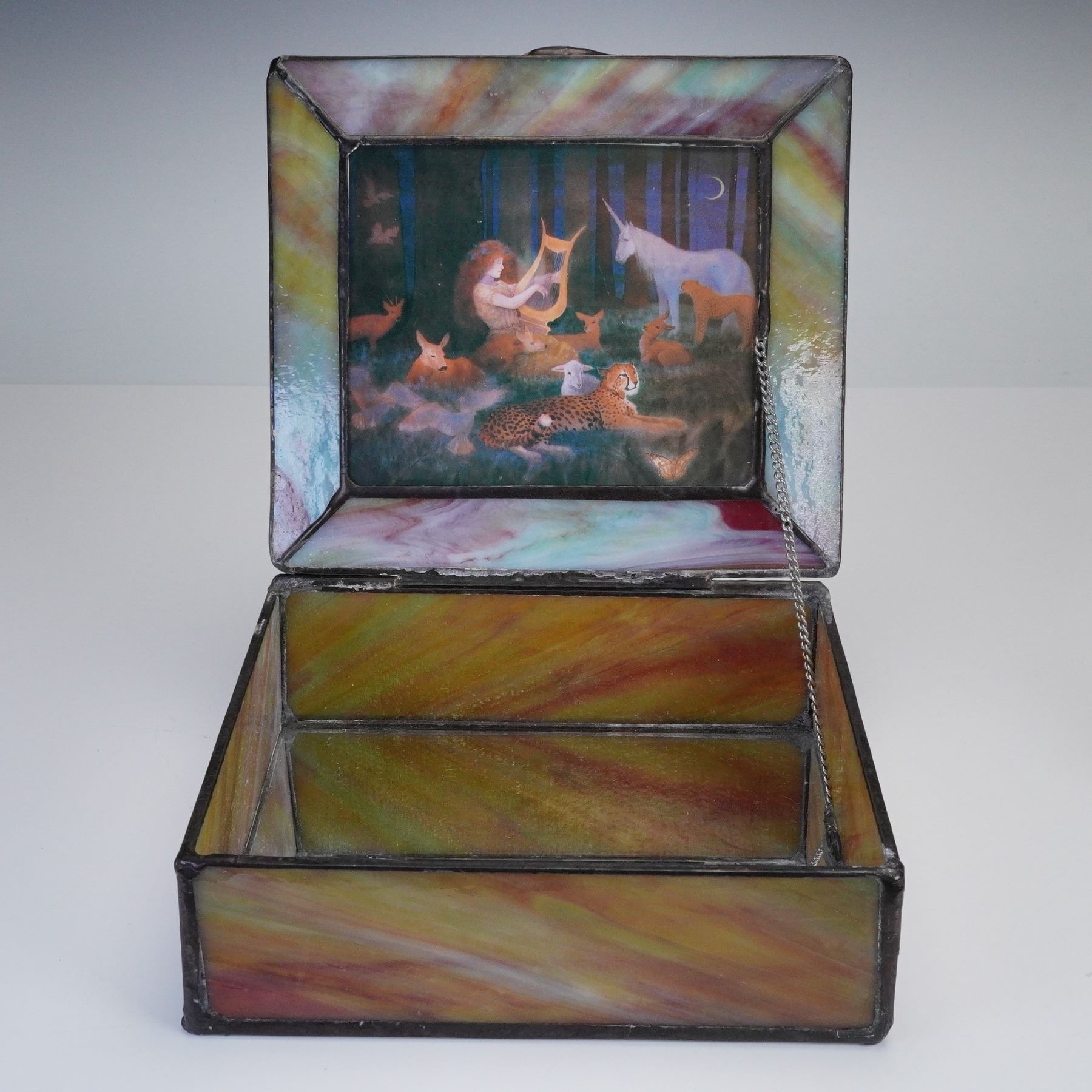 A charming pair of unicorn-themed collectibles. The first is a slag glass trinket box with beautifully marbled iridescent panels, the lid featuring an image of a maiden riding a unicorn and the interior lid decorated with a second fantasy woodland unicorn scene. The second piece is a 1998 Spencer Gifts unicorn snow globe music box, showcasing two rearing unicorns within a glitter-filled globe on a decorative base. The music box plays the classic tune Imagine, adding to its nostalgic and magical appeal.