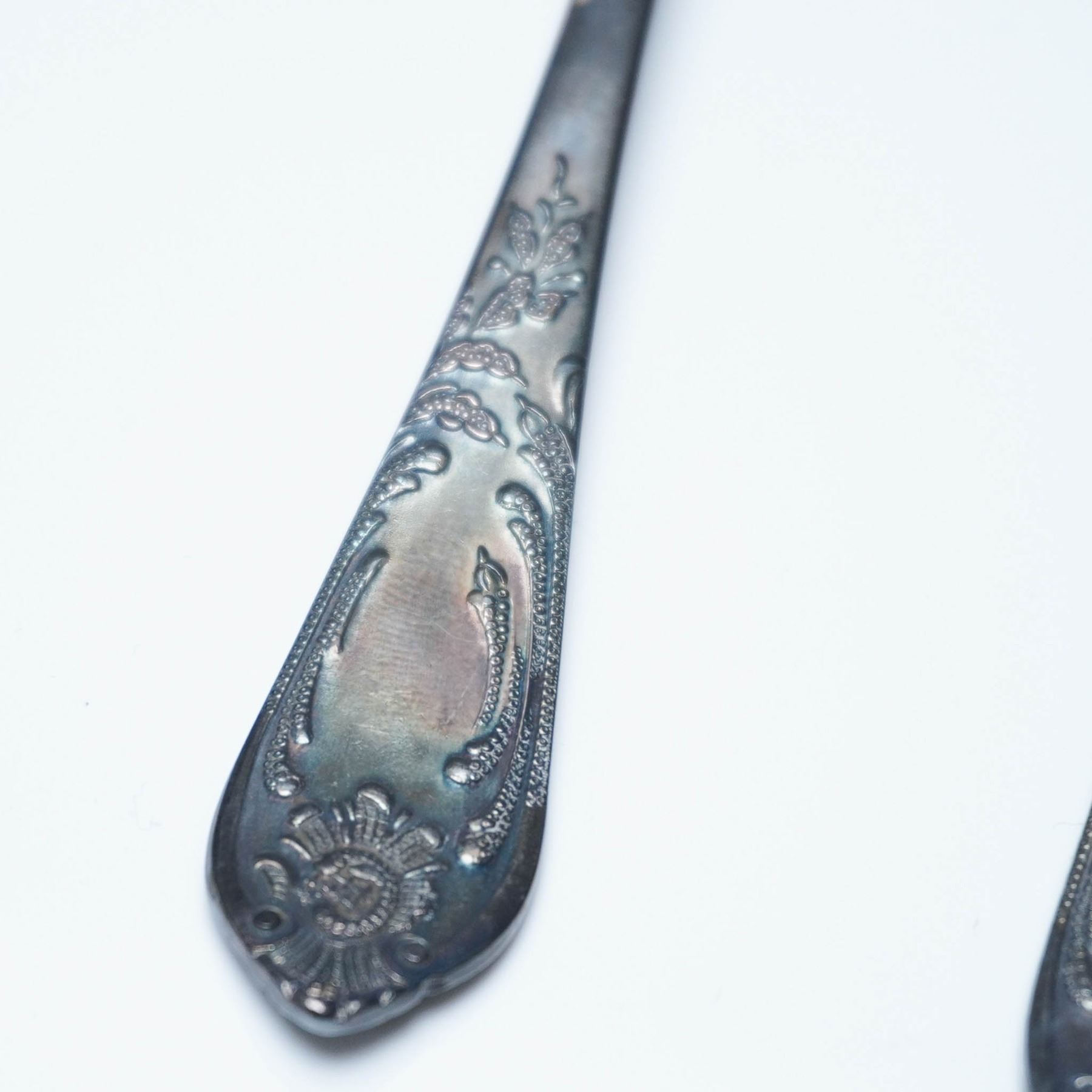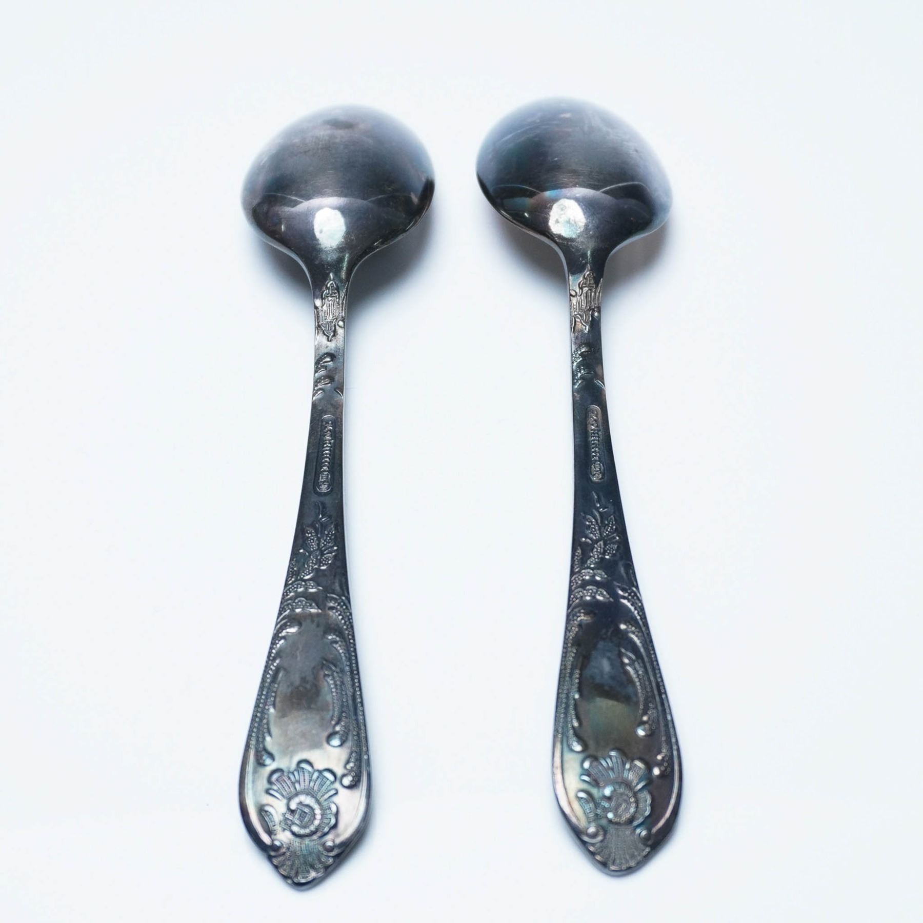 A vintage pair of Soviet silver-plated teaspoons, featuring intricate floral and foliate engravings along the handles, exemplifying the craftsmanship of mid-20th-century Eastern European silverware. The spoons are presented in their original green presentation box, lined with blue velvet and silk, bearing a distinctive hallmark along with Cyrillic text, indicative of Soviet-era production. This set is a remarkable collector’s piece, capturing the elegance and history of Soviet tableware. The spoons exhibit a natural patina, enhancing their vintage appeal. Spoon measures 5.75"L, box measures 6.5"L x 1.5"H.