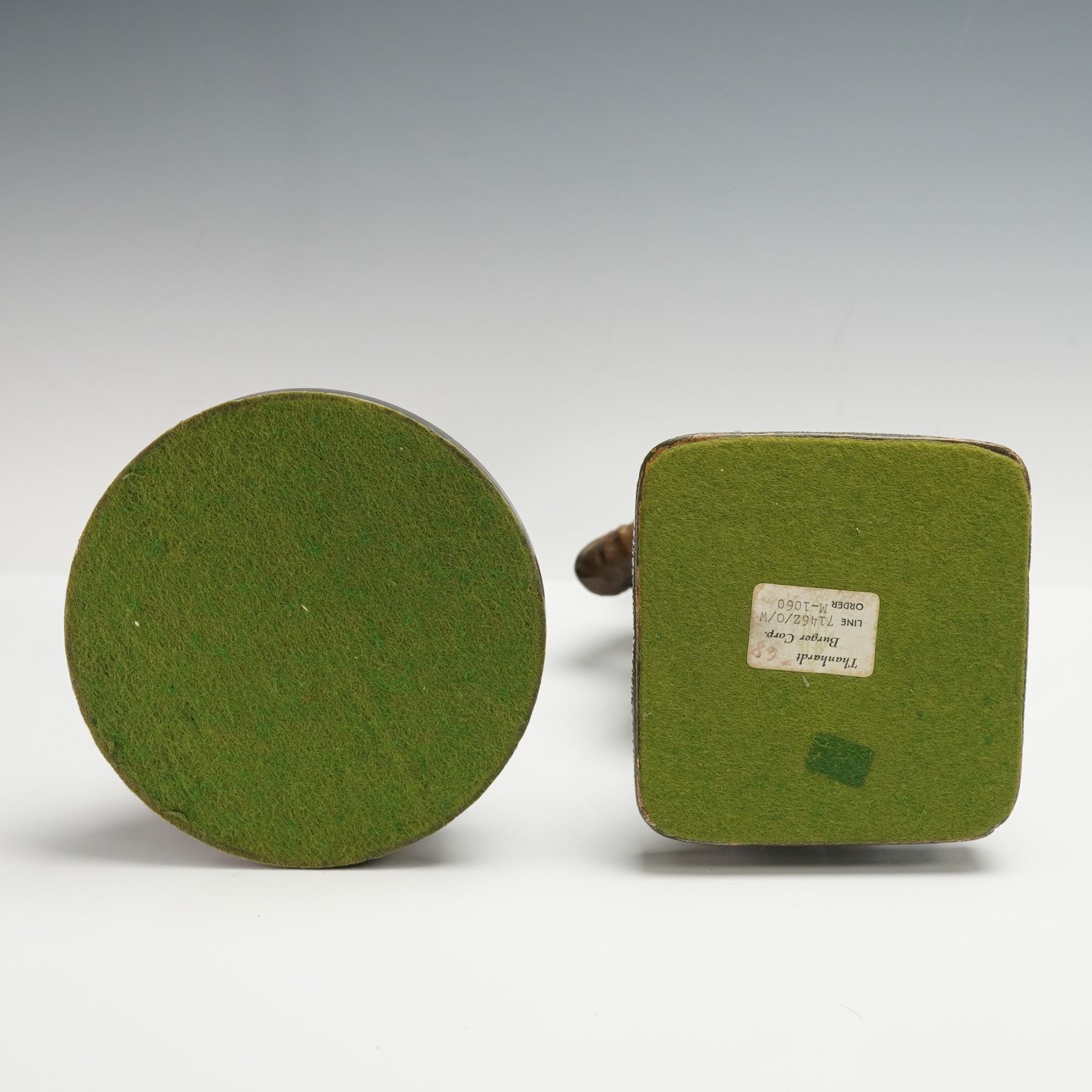 Two early 20th century spelter figures depicting newsboys holding newspapers, each with period dress and expressive poses, one standing on a circular plinth inscribed EXTRY! and the other on a square base with green felt underside and a retailer's label for Themand & Co.