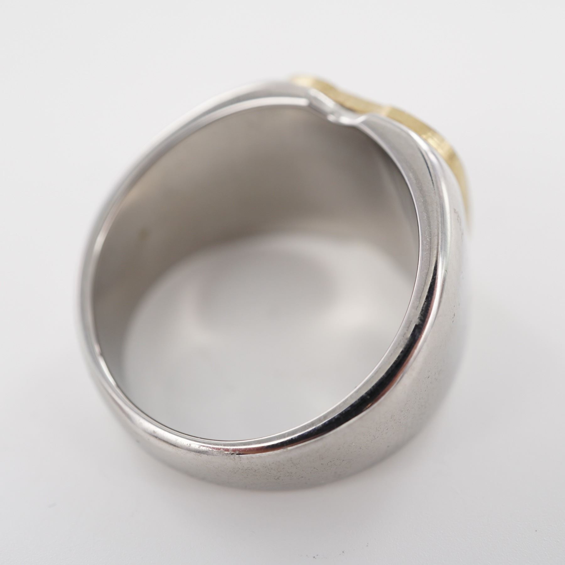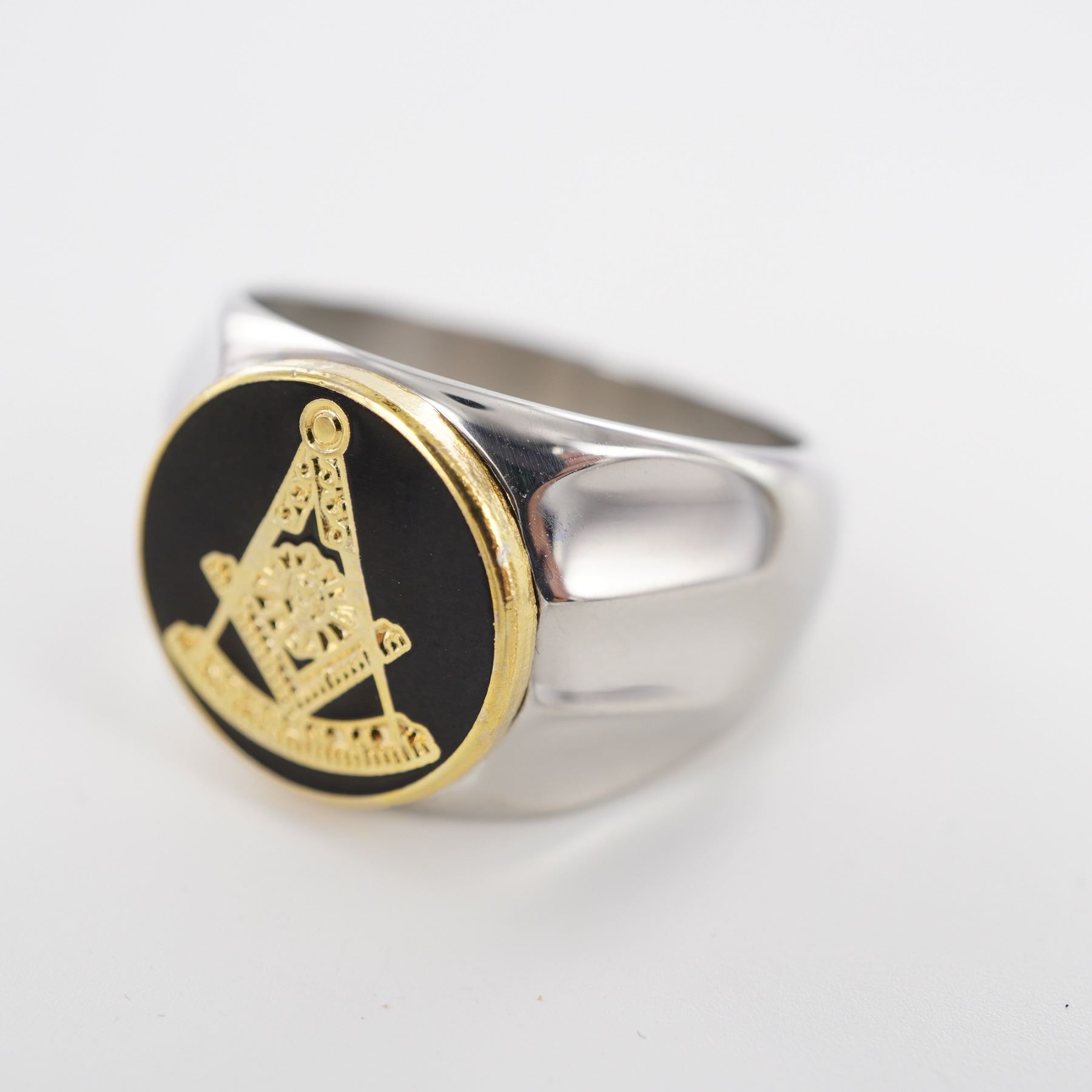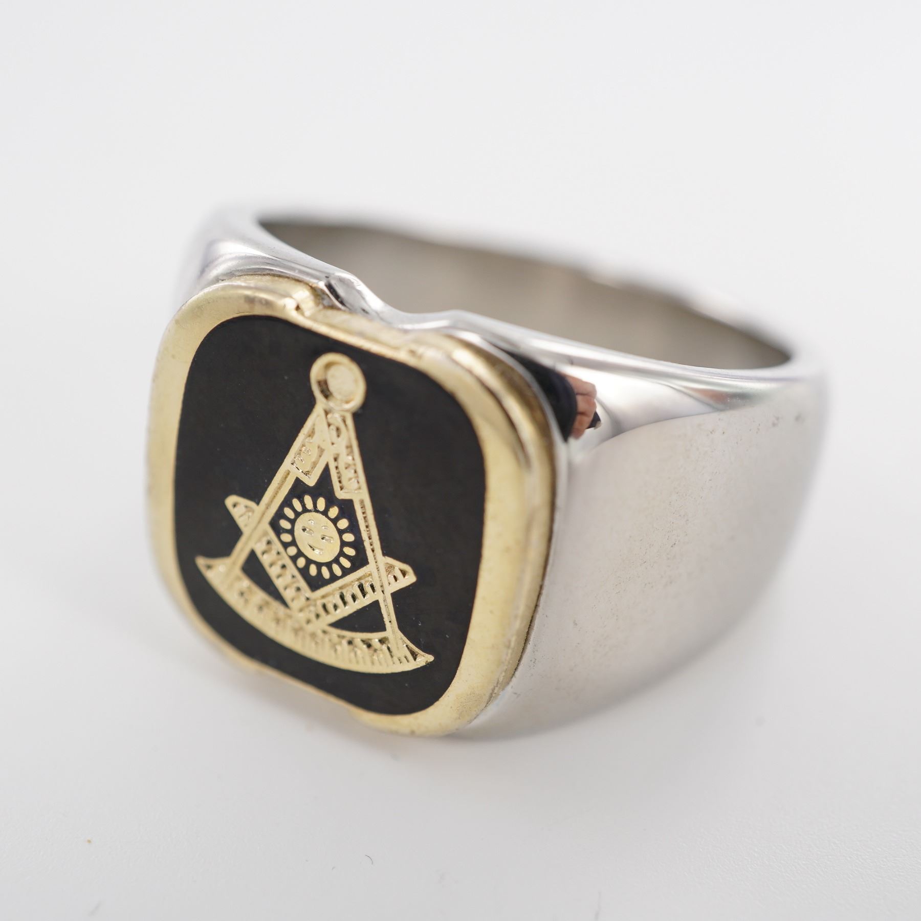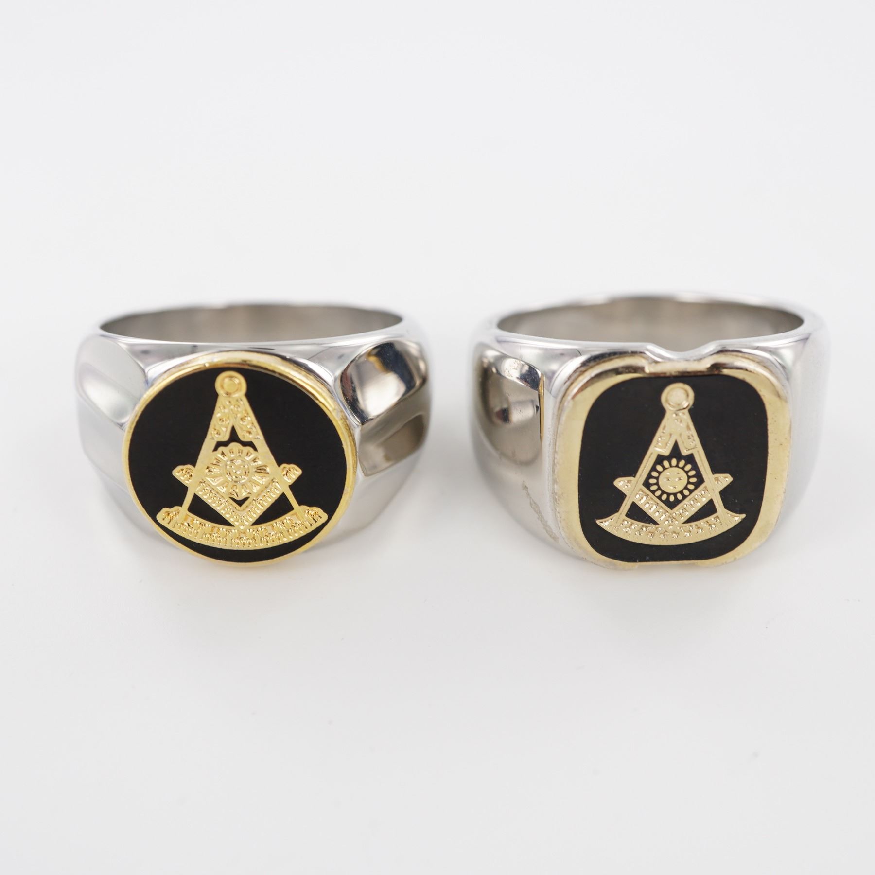Two stainless steel rings each featuring a gold-tone Past Master emblem with compasses and quadrant centered by a sun motif. Both with black fields and gold-tone borders, one round and one rectangular in form. Polished shanks with smooth interiors.