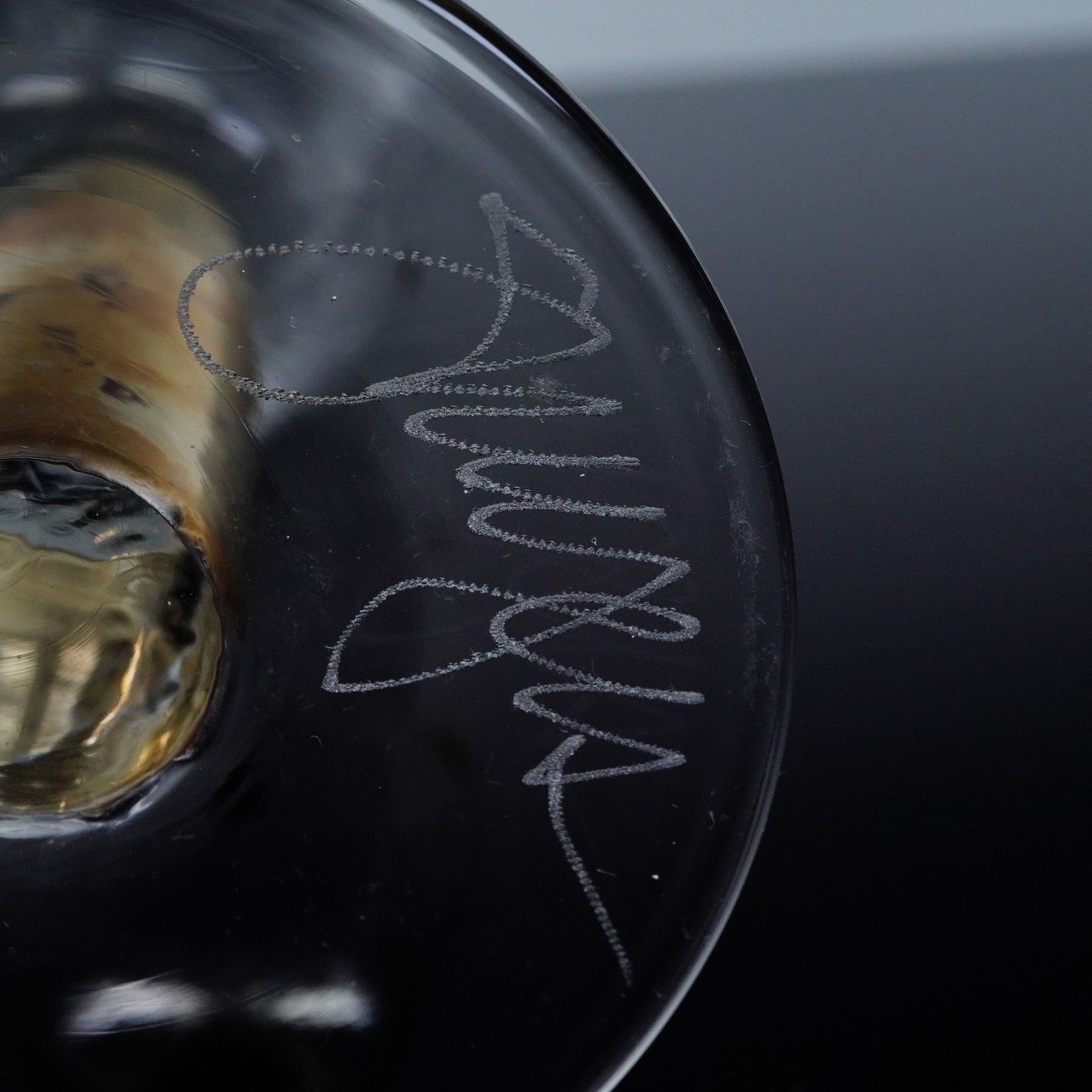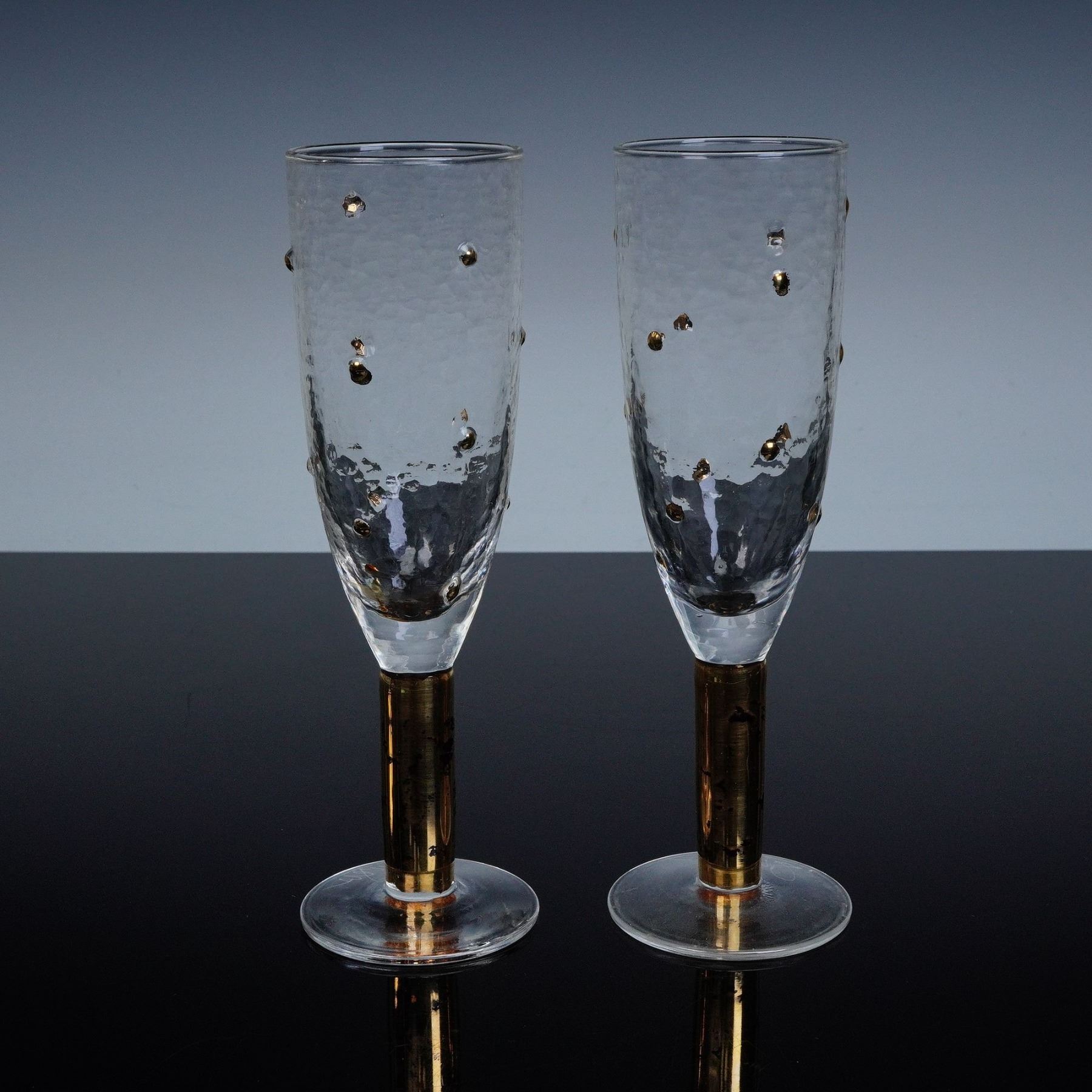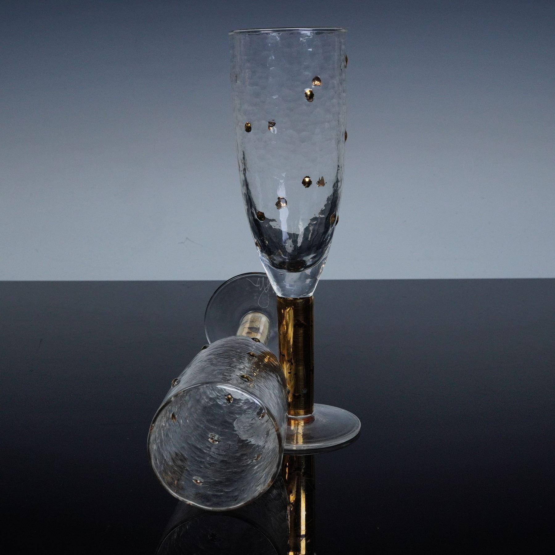 A striking pair of signed art glass champagne flutes by American glass artist Stephen Smyers, from his coveted Morocco Gold Dot series. Each handblown glass displays a subtly hammered texture with embedded gold accents that shimmer beautifully under light. The cylindrical stems are richly gilt, adding a note of modern opulence to their sculptural form. Smyers' signature is acid-etched to the underside of each base. These pieces exemplify Smyers' mastery of color, texture, and proportion, blending mid-century sensibilities with a contemporary aesthetic. Their balance of clarity and metallic detail makes them ideal as both functional glassware and display art.