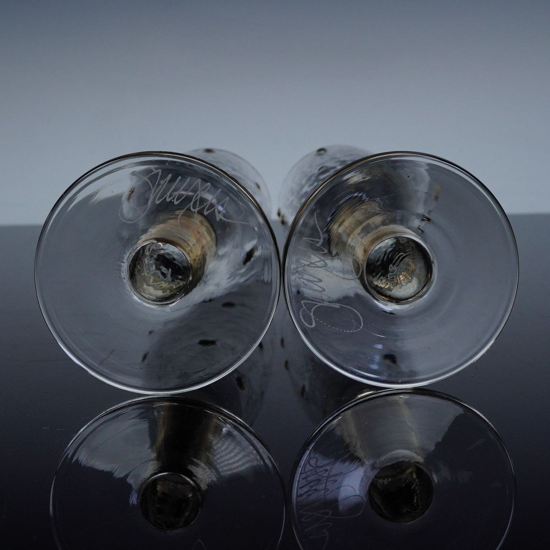 2pc Stephen Smyers Morocco Gold Dot Art Glass Champagne Flutes, Signed