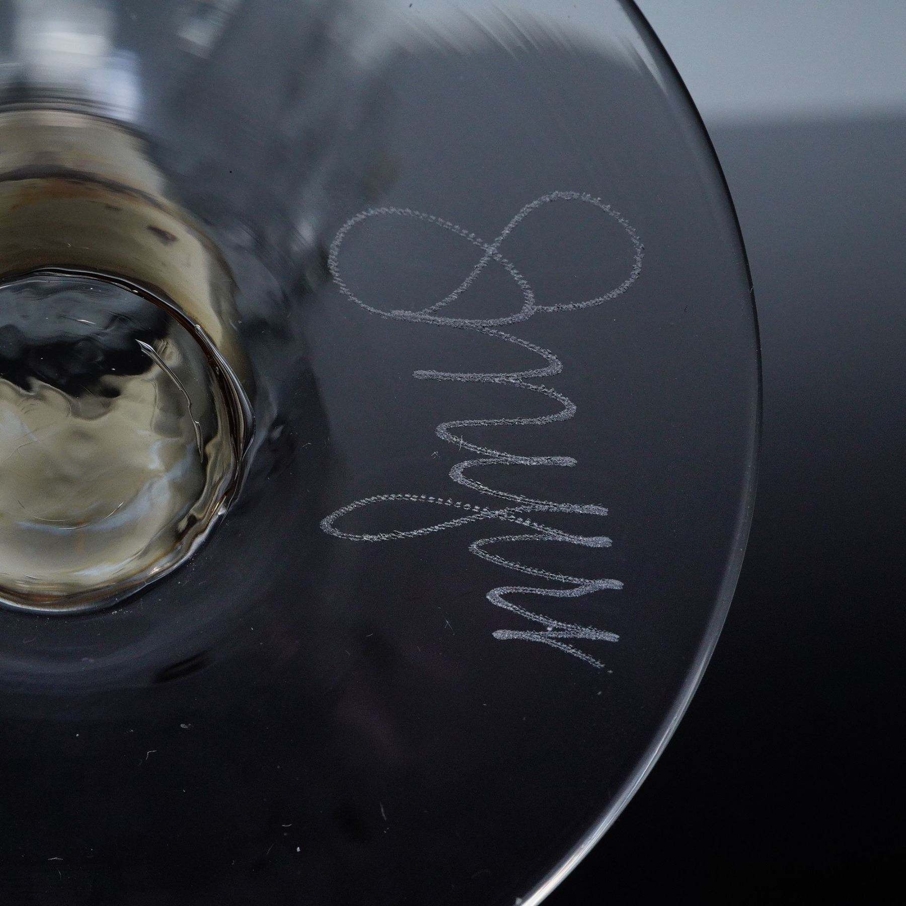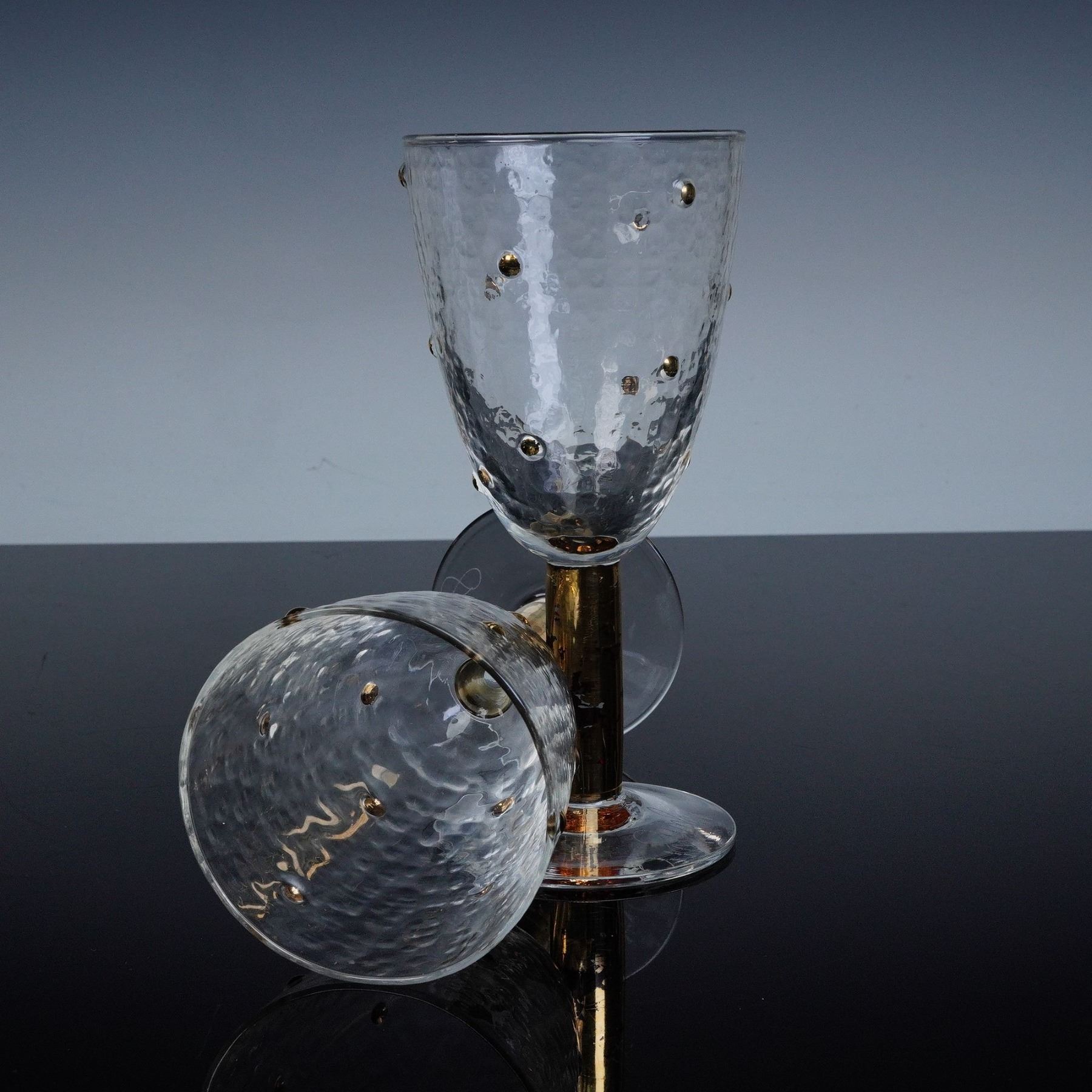 A fine pair of handblown art glass goblets by noted American glass artist Stephen Smyers, from his sought-after Morocco Gold Dot series. Each goblet features a hammered clear glass bowl embellished with applied raised gold dots, creating a lively play of texture and reflection. The stems are finished in brilliant gold, complementing the luminous surface decoration and adding an opulent touch to the modern form. Both pieces are signed Smyers along the underside of the foot. These goblets exemplify Smyers' distinctive approach to studio glass, combining impeccable craftsmanship with rich surface treatment and refined design. Elegant and tactile, they function beautifully as display pieces or as sophisticated tableware for collectors of contemporary American glass.