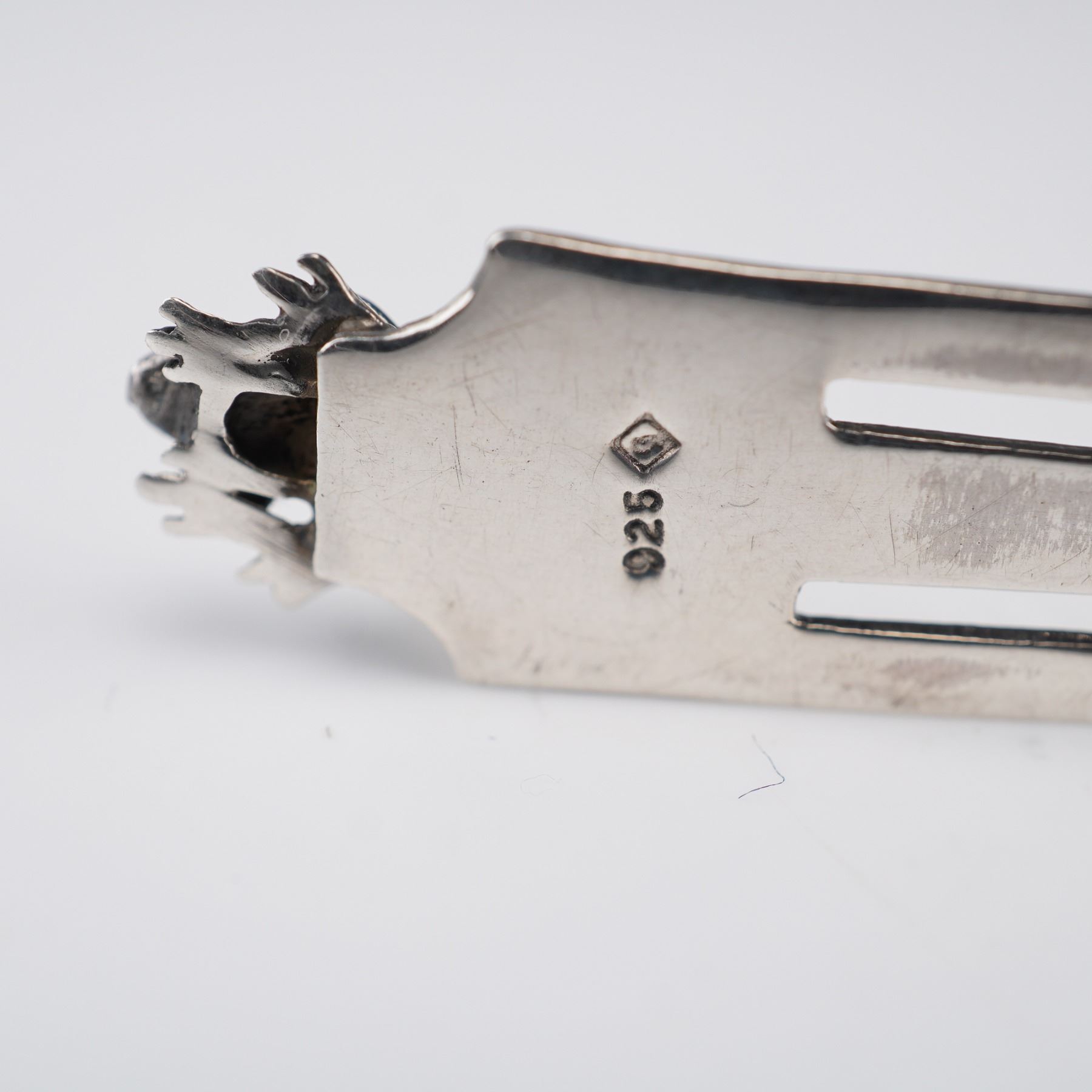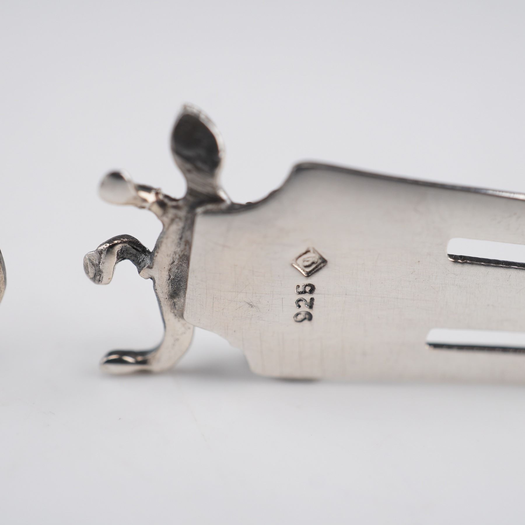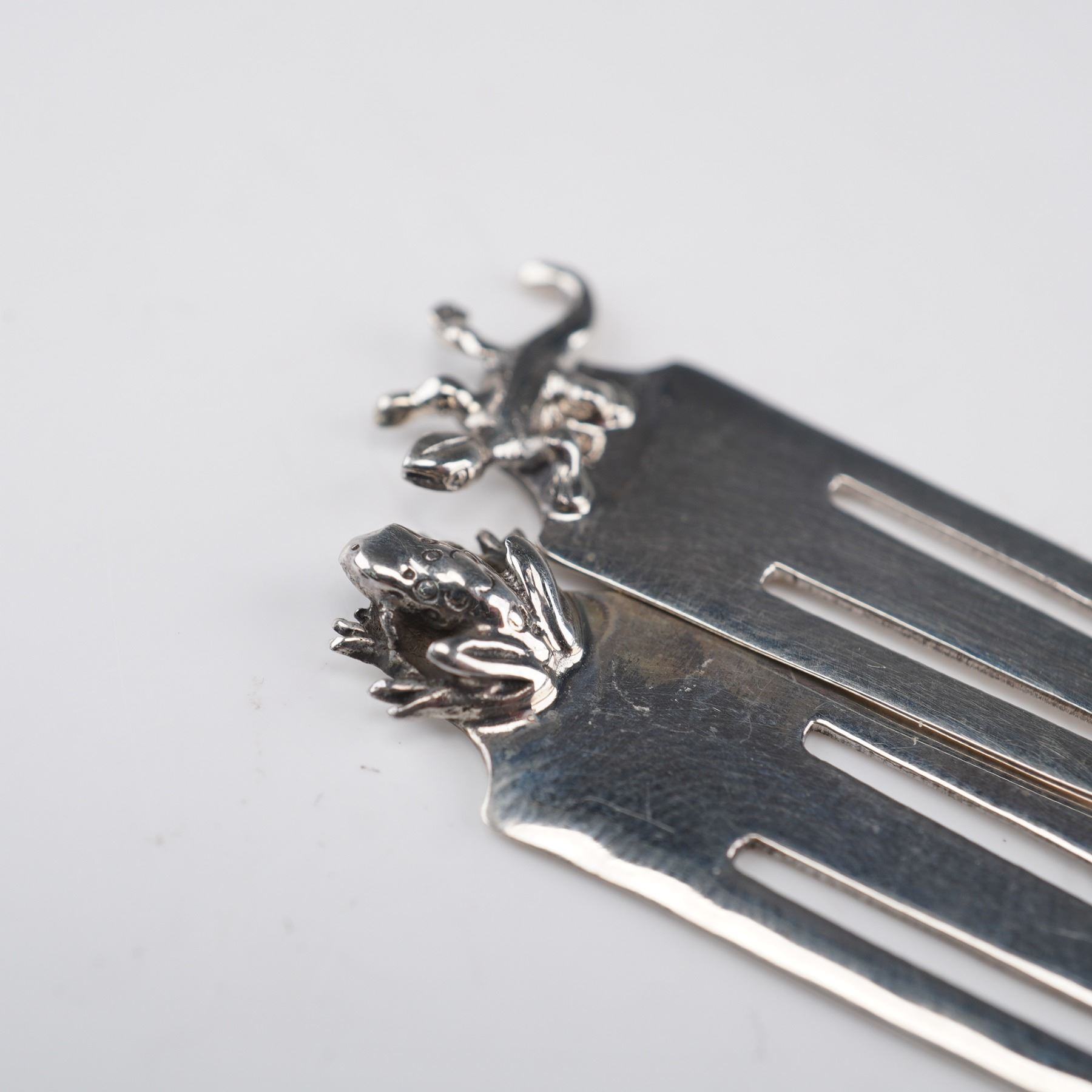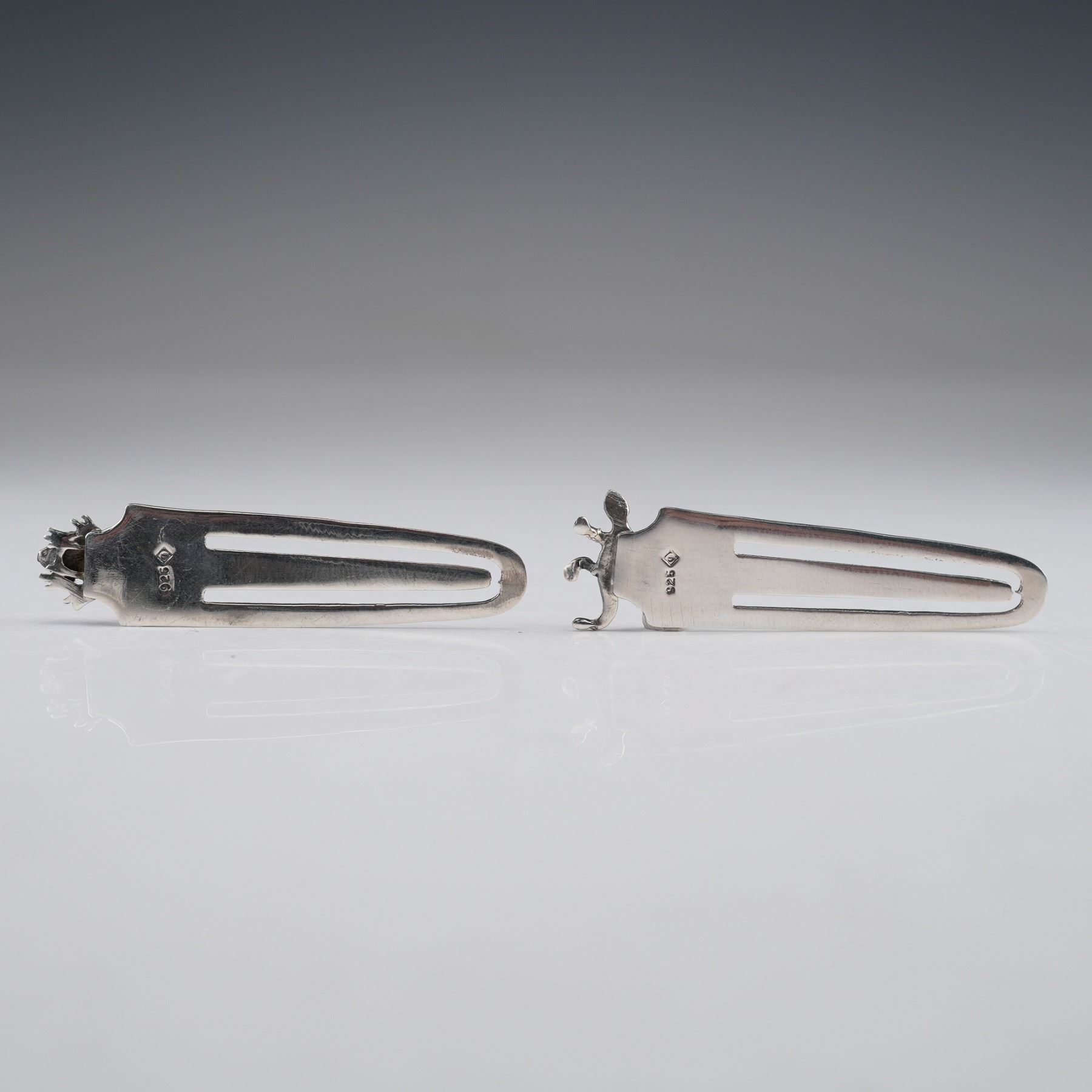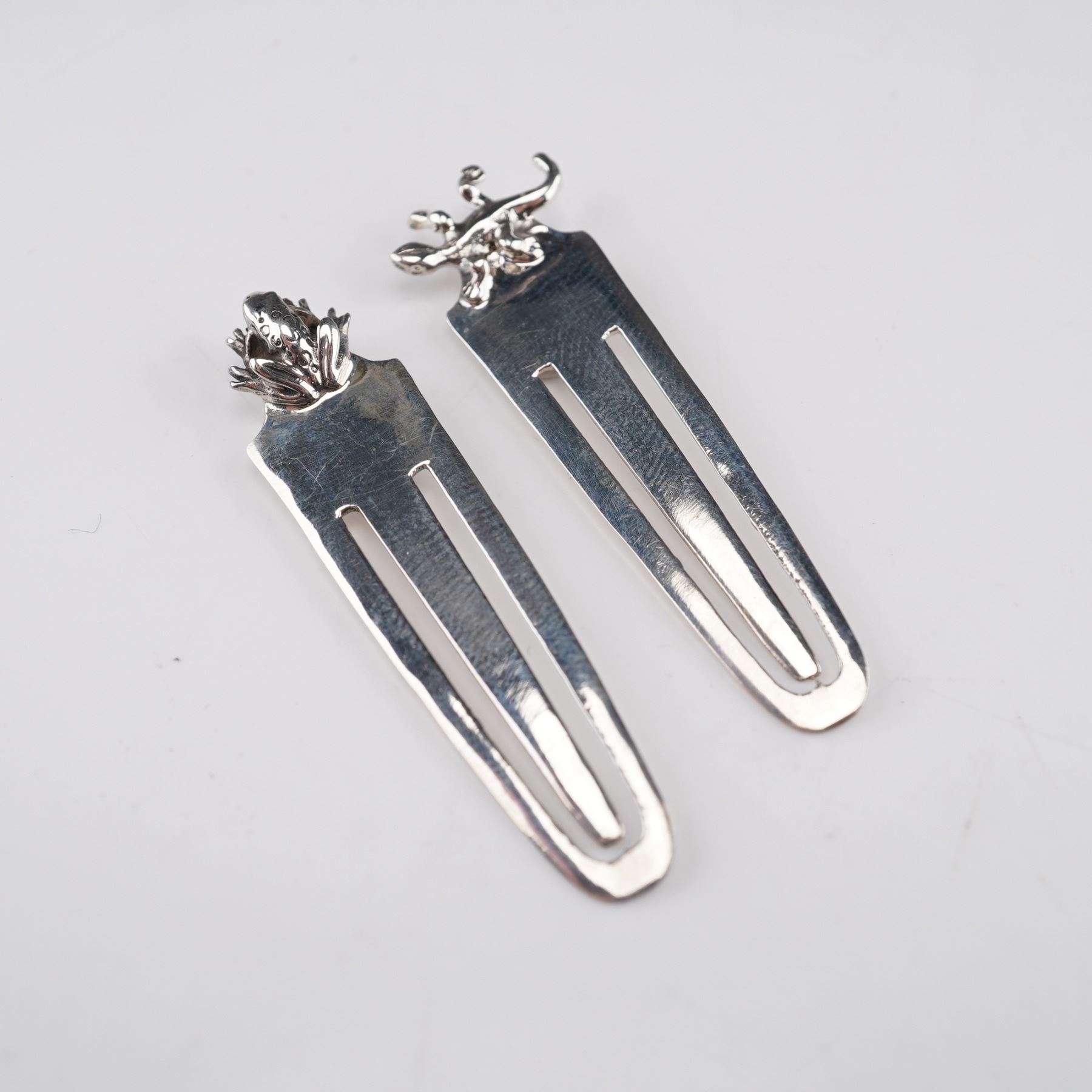 This set of two sterling silver bookmarks, marked with 925 for sterling silver, features intricate animal figures. One bookmark showcases a frog, while the other features a lizard at the top. These finely crafted bookmarks are both functional and decorative, making them a unique addition to any collection. Net Silver weight 0.134 troy oz.