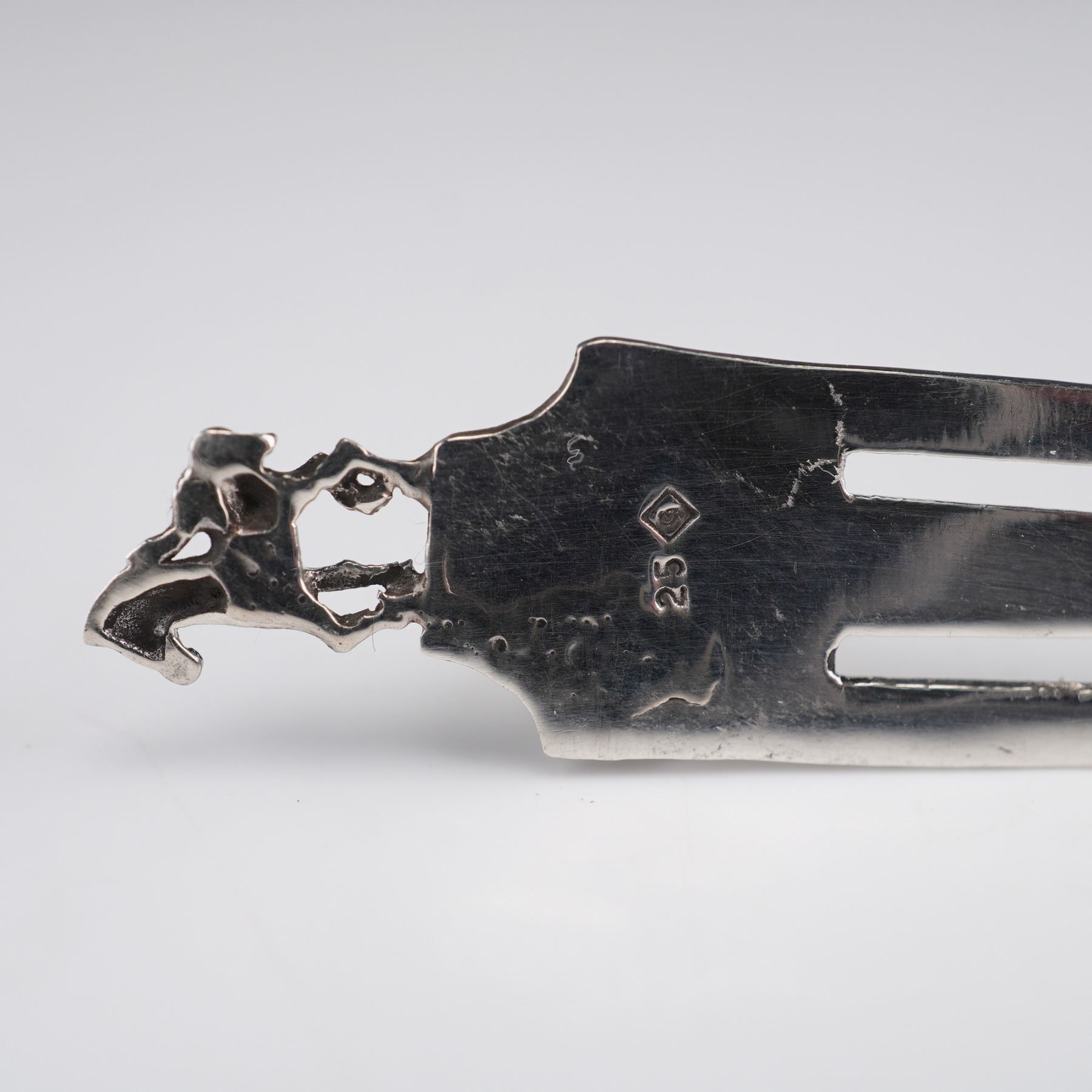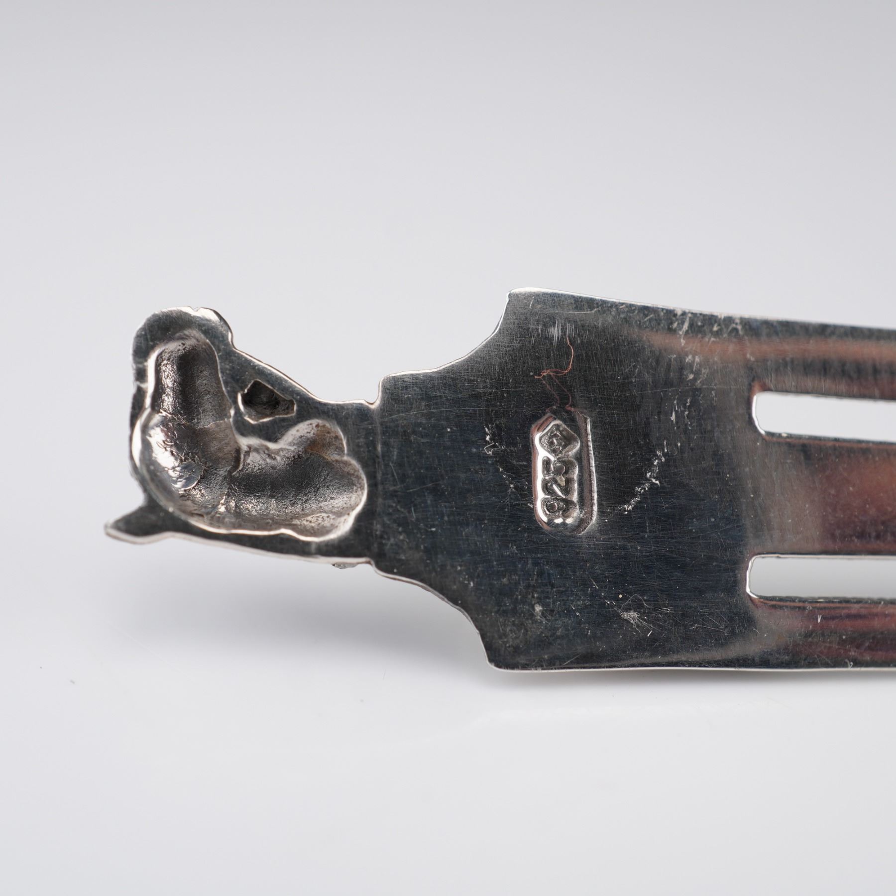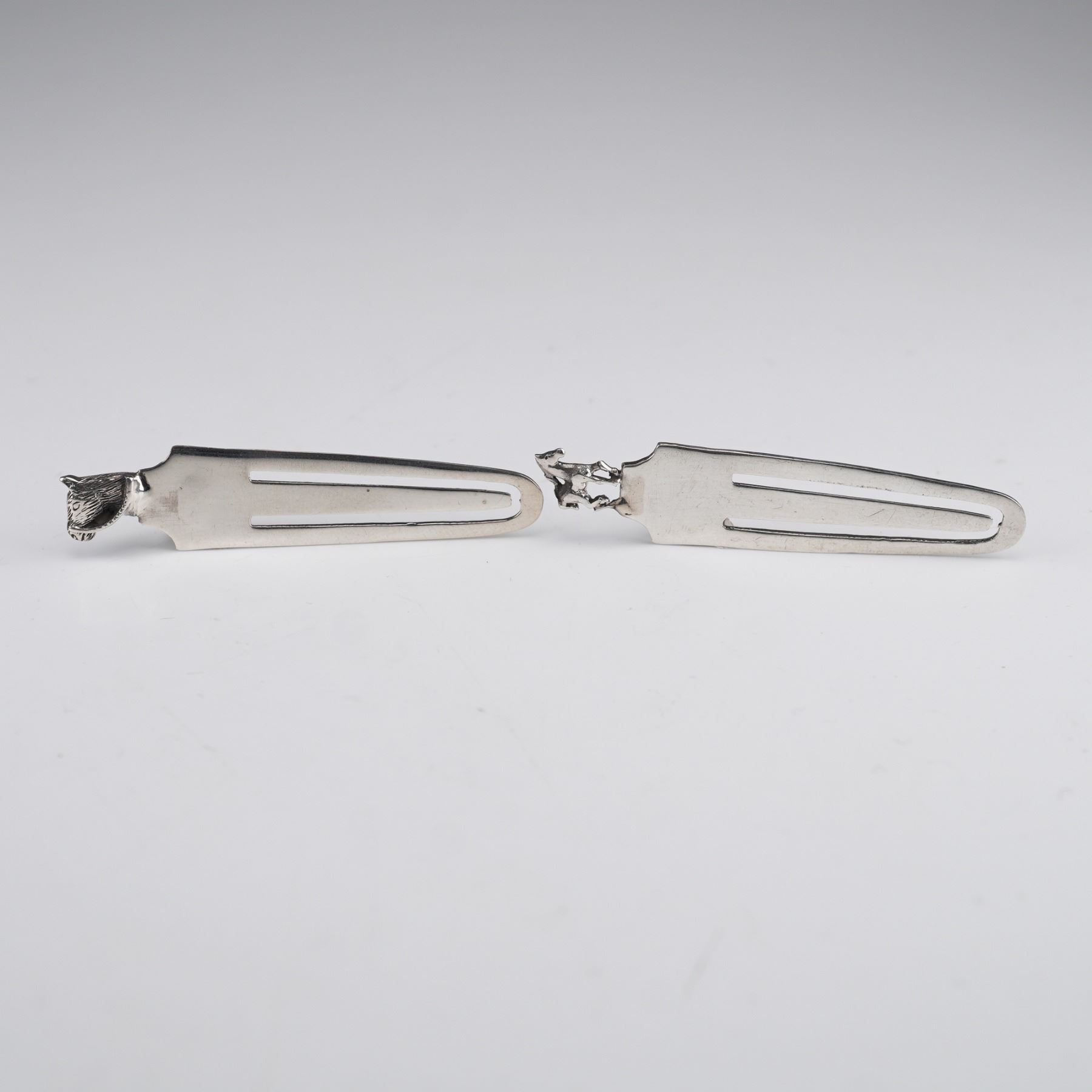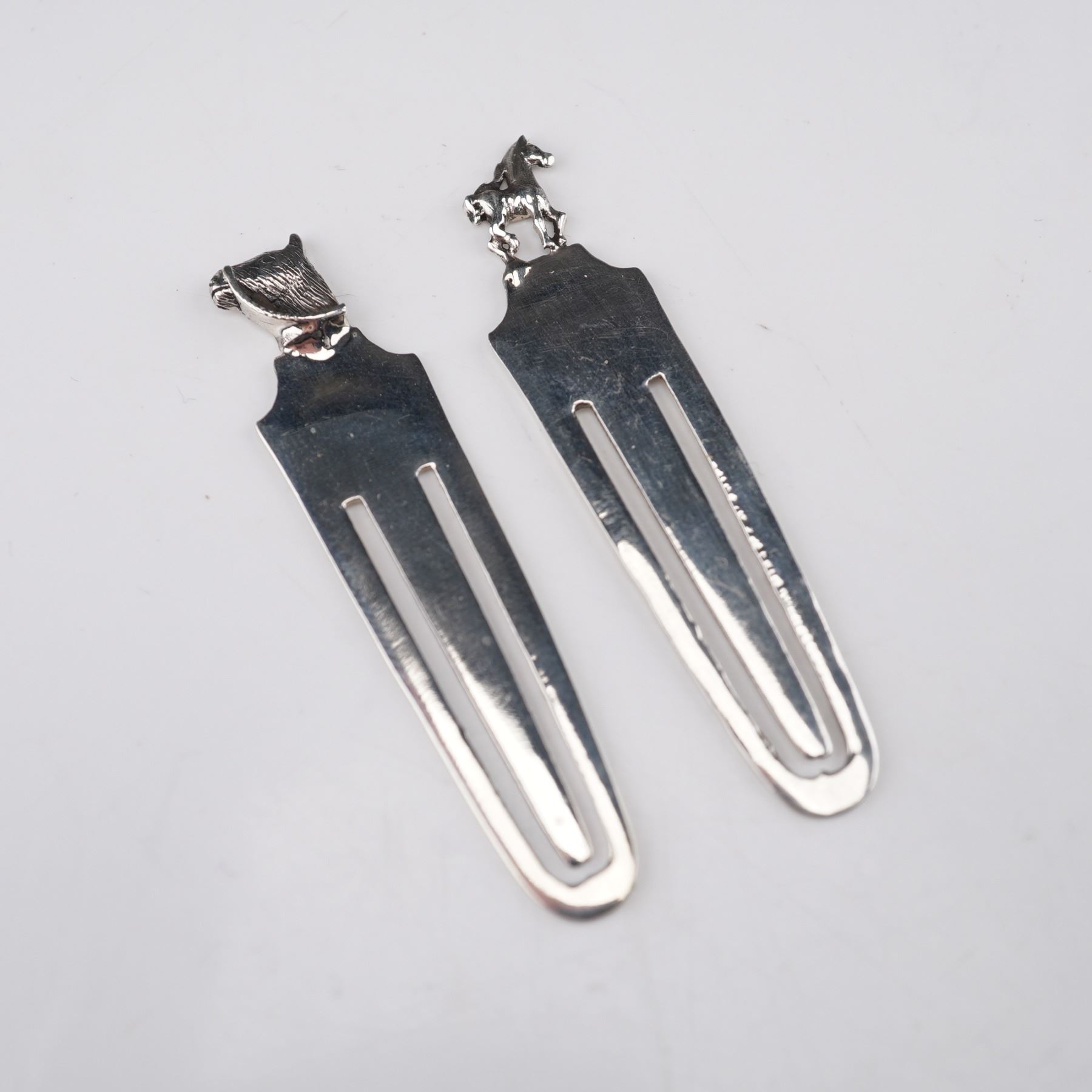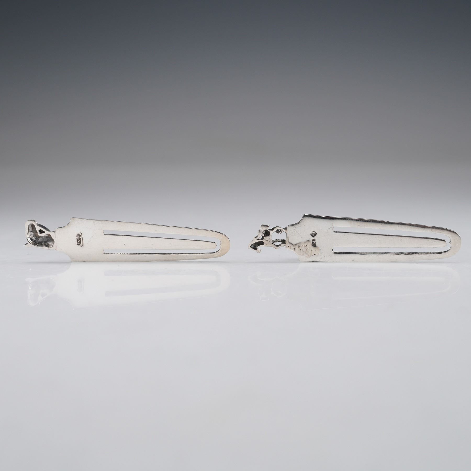 This set of two sterling silver bookmarks, each marked with 925 for sterling silver, features intricate figural decorations of horses. One bookmark showcases a standing horse, while the other features a bridled horse head. These bookmarks combine functionality with beautiful craftsmanship, making them a unique addition to any collection. Net Silver weight 0.124 troy oz.
