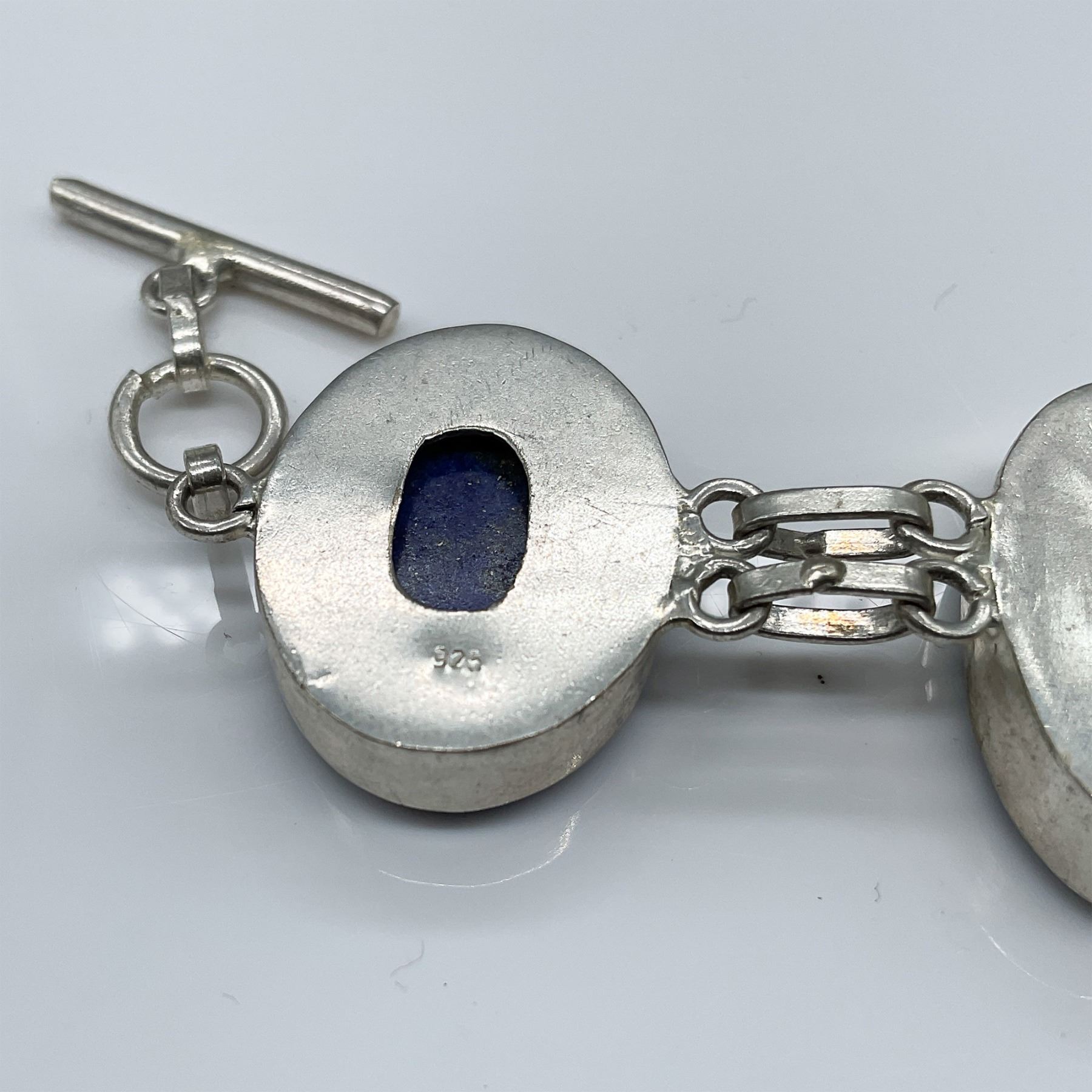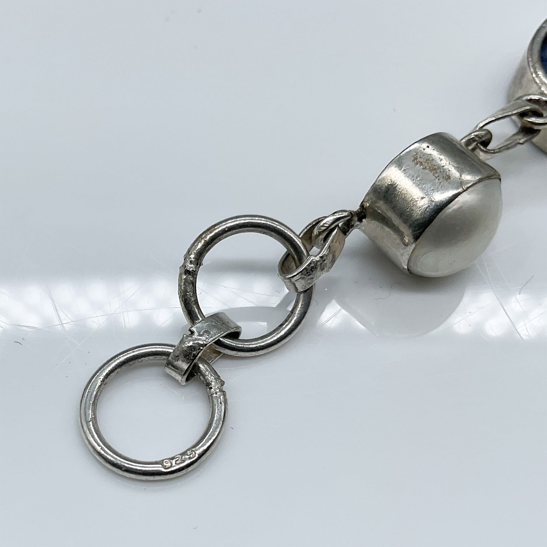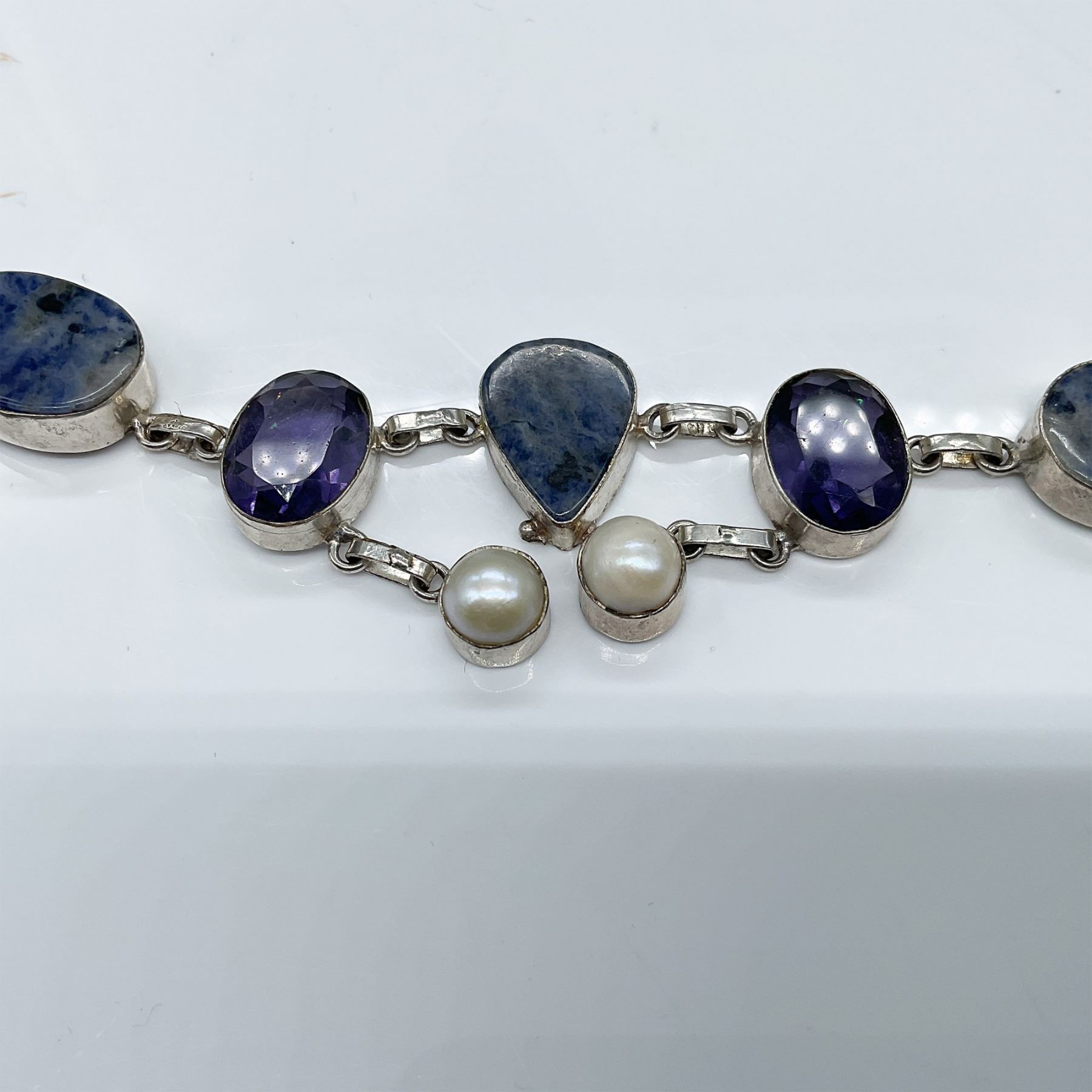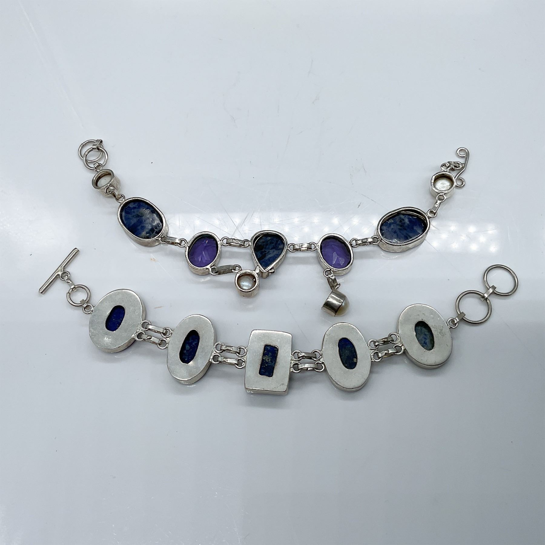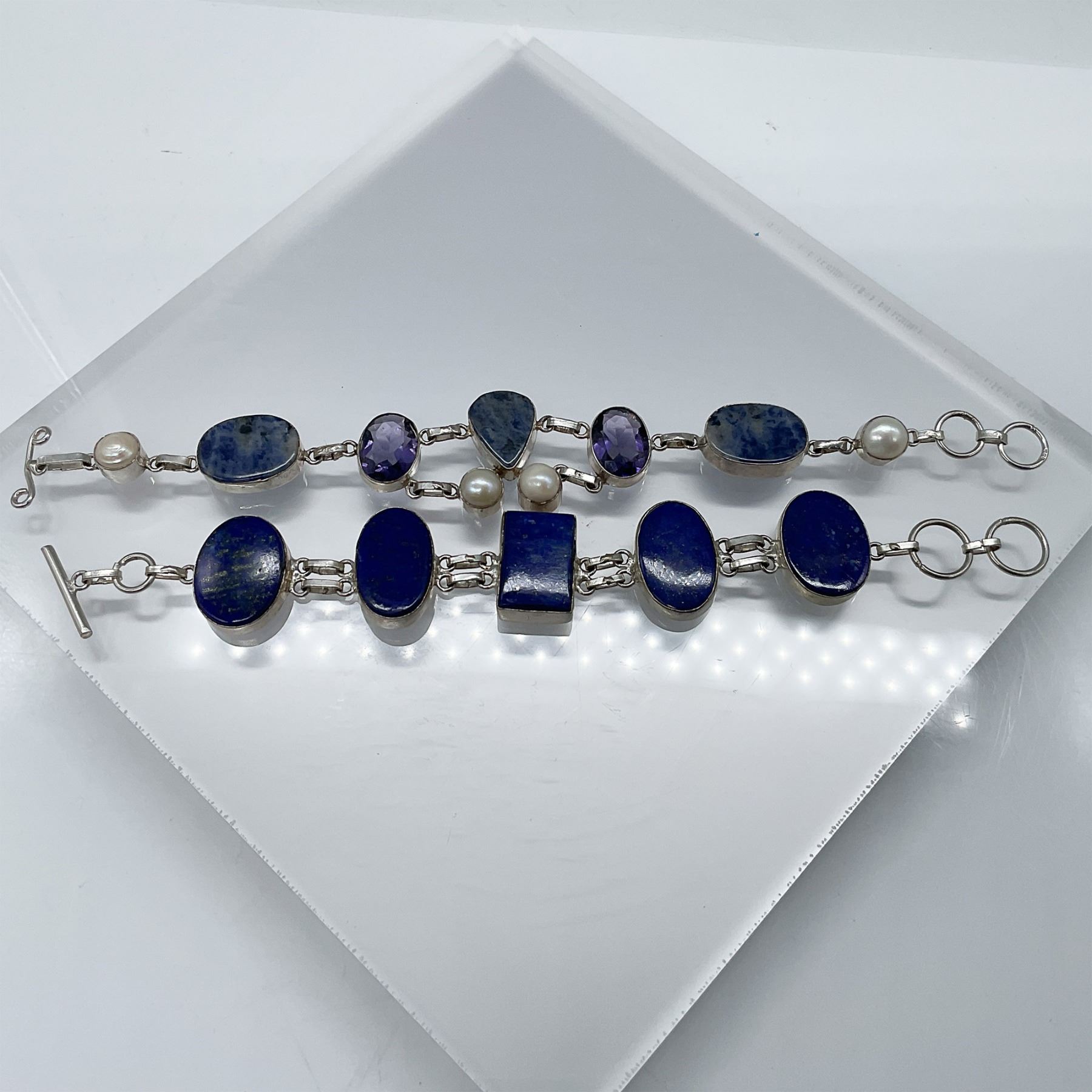 Two sterling silver bracelets featuring blue stones, each marked 925. One bracelet includes additional accents of amethyst-colored stones and pearls, while the other showcases an elegant design with blue stones. The largest bracelet measures 8.5"L from clasp to clasp. These bracelets combine craftsmanship with a striking mix of materials, making them timeless additions to any collection.