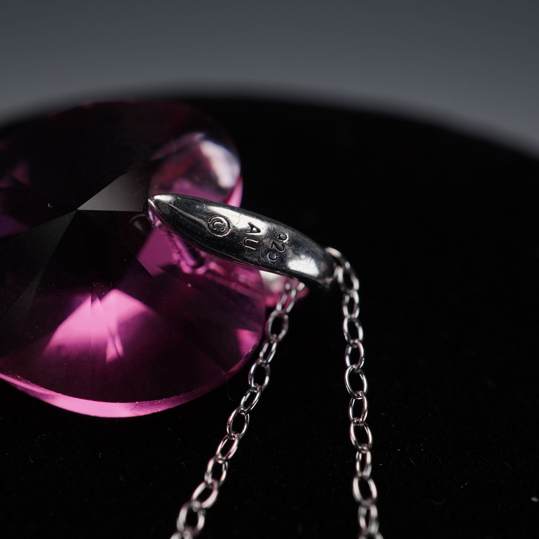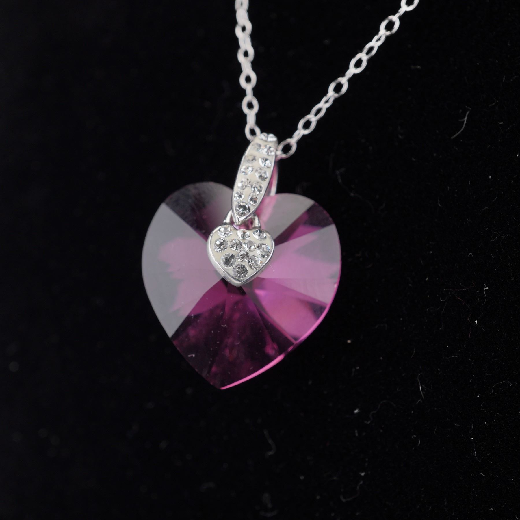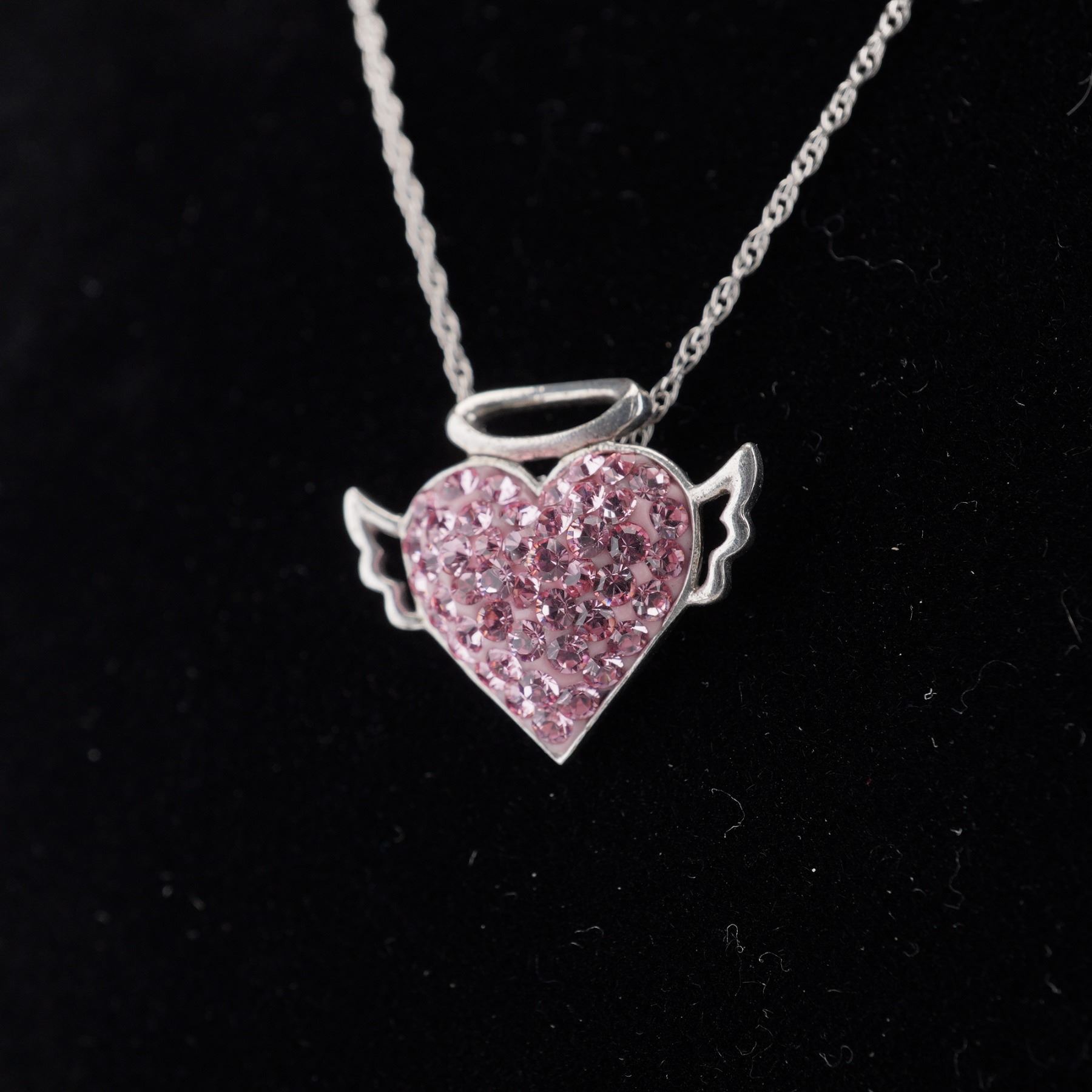A vibrant duo of sterling silver necklaces featuring heart-themed pendants in bold pink tones, both adorned with Swarovski crystals for exceptional sparkle. One showcases a faceted pink Swarovski crystal heart accented with a smaller heart set with clear crystals, marked 925 AU on the bail. The second necklace features a whimsical design with a pink pave-set Swarovski crystal heart flanked by wings and topped with a halo, giving it an angelic character. Both pendants are suspended from sterling silver chains and stamped 925. A spirited and romantic pair, perfect for lovers of playful jewelry with a touch of shimmer. Total combined weight: 6.85g.