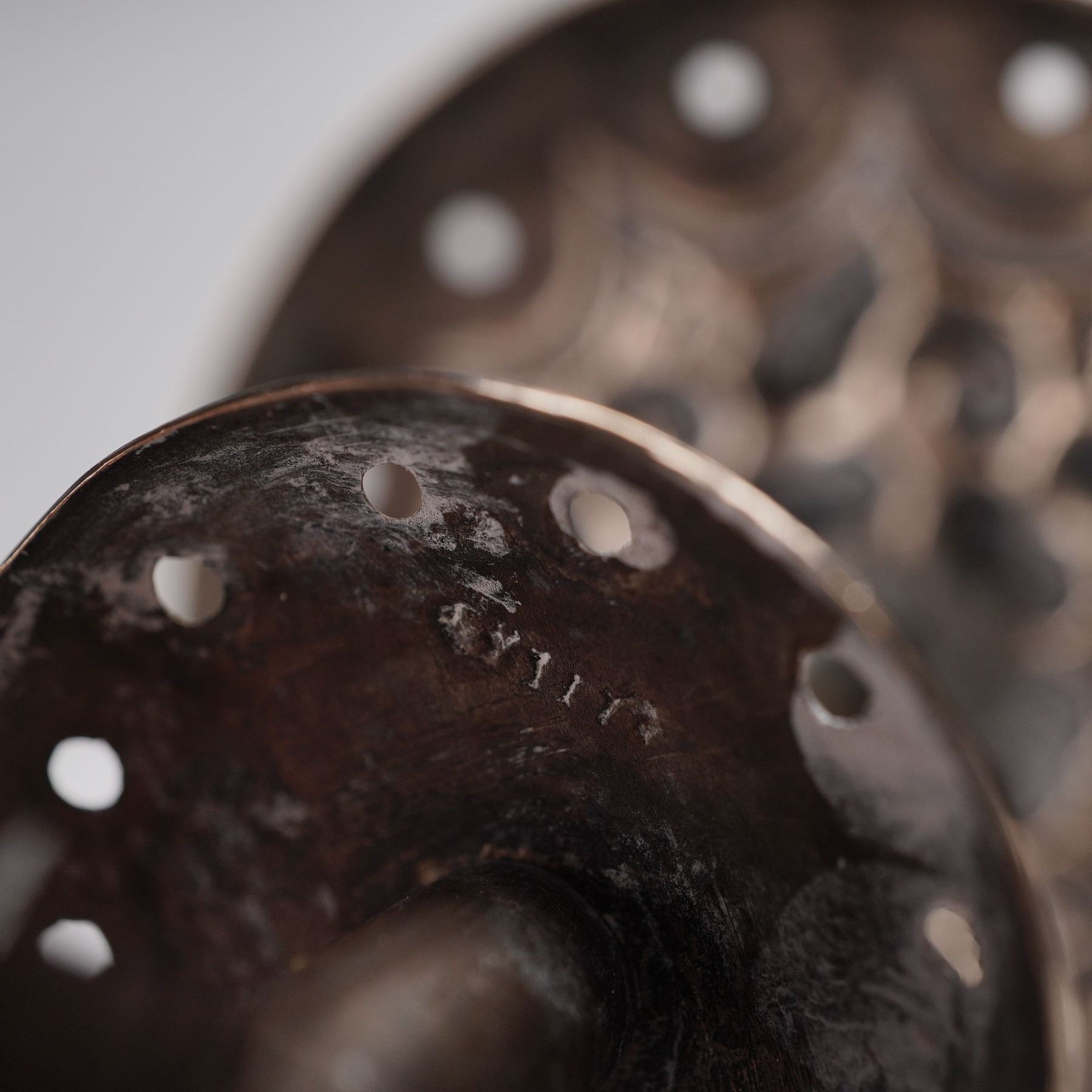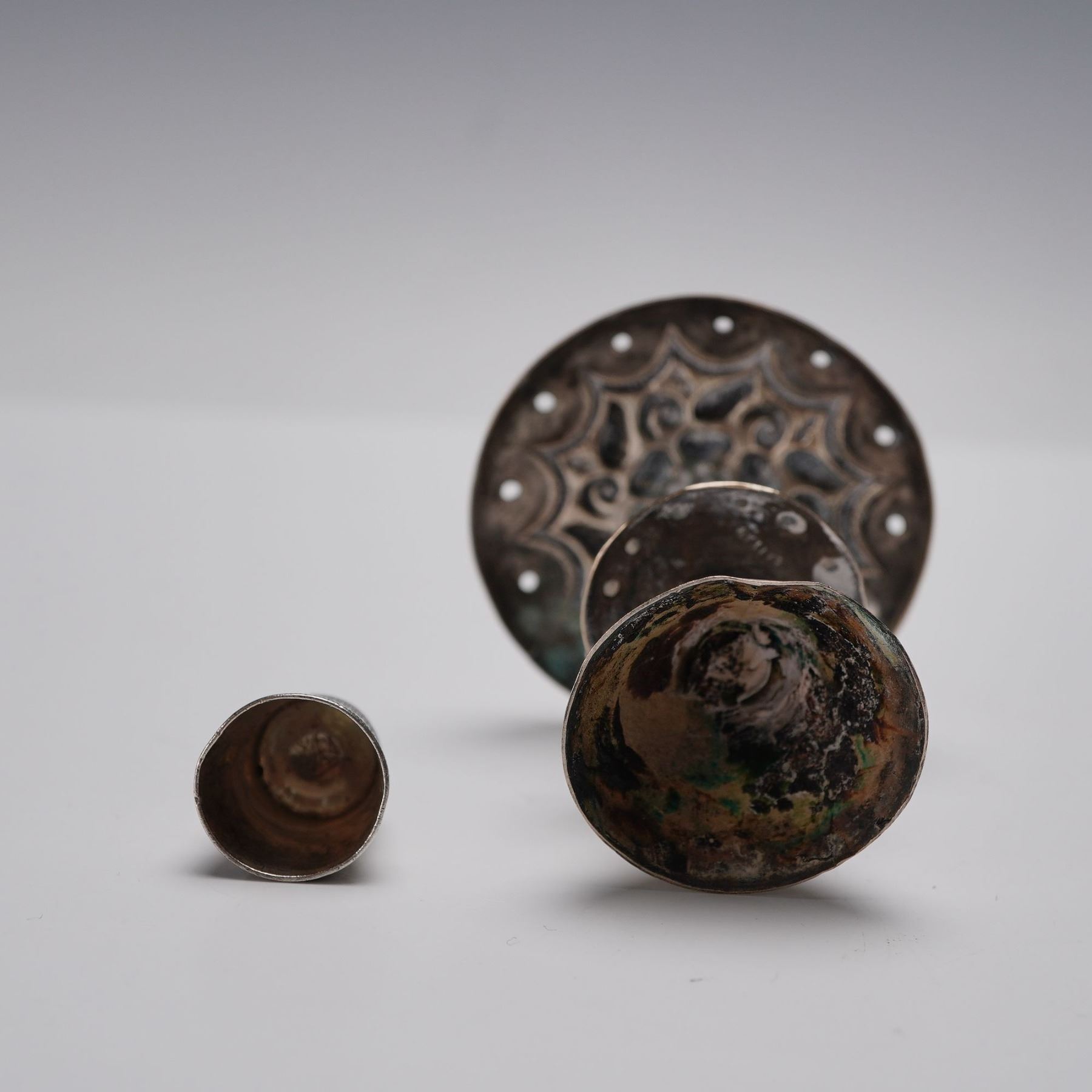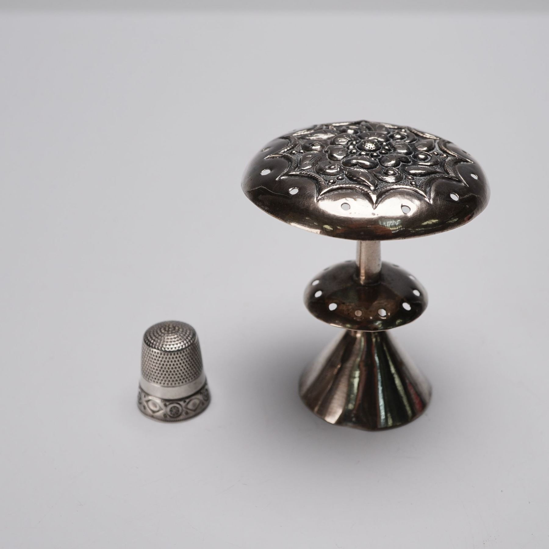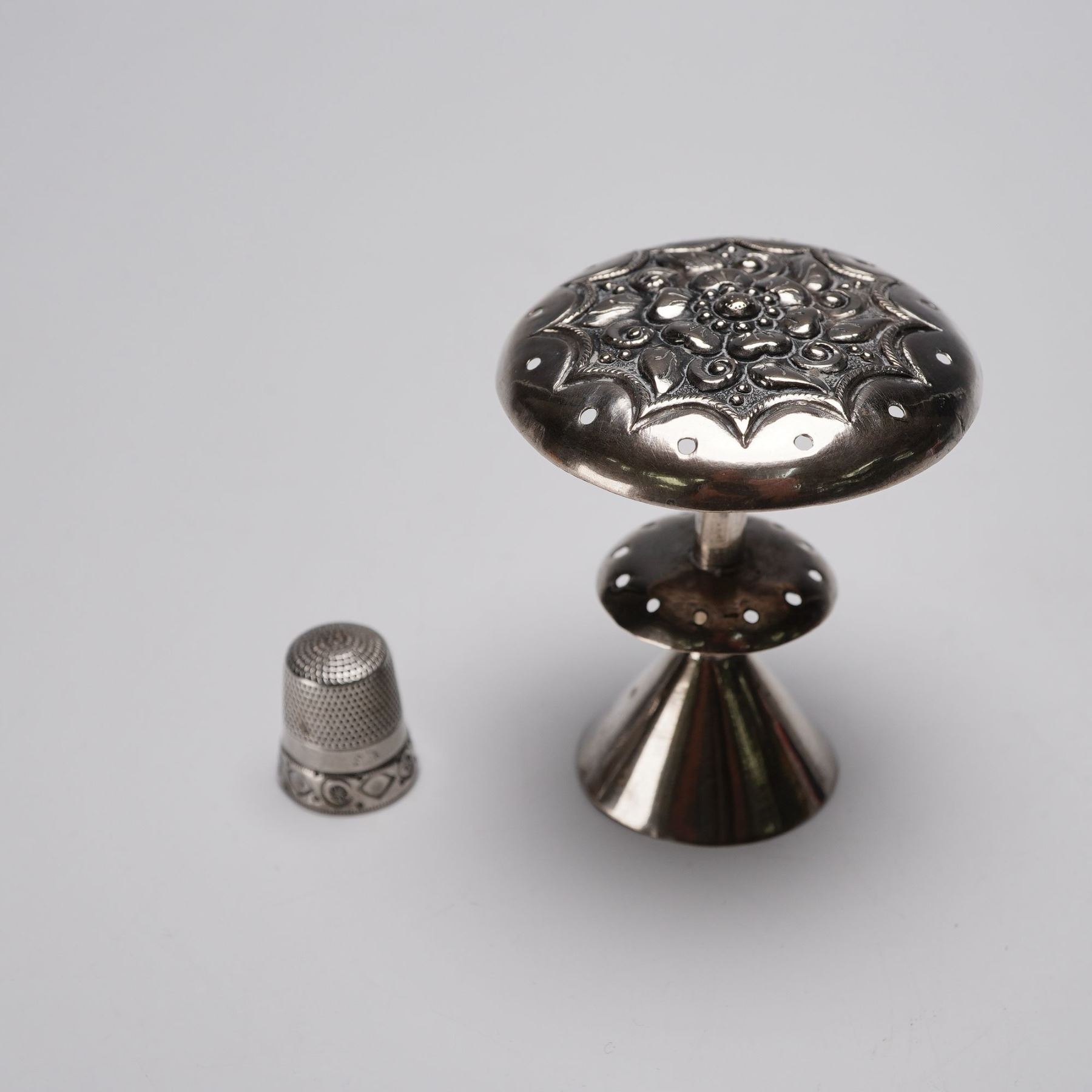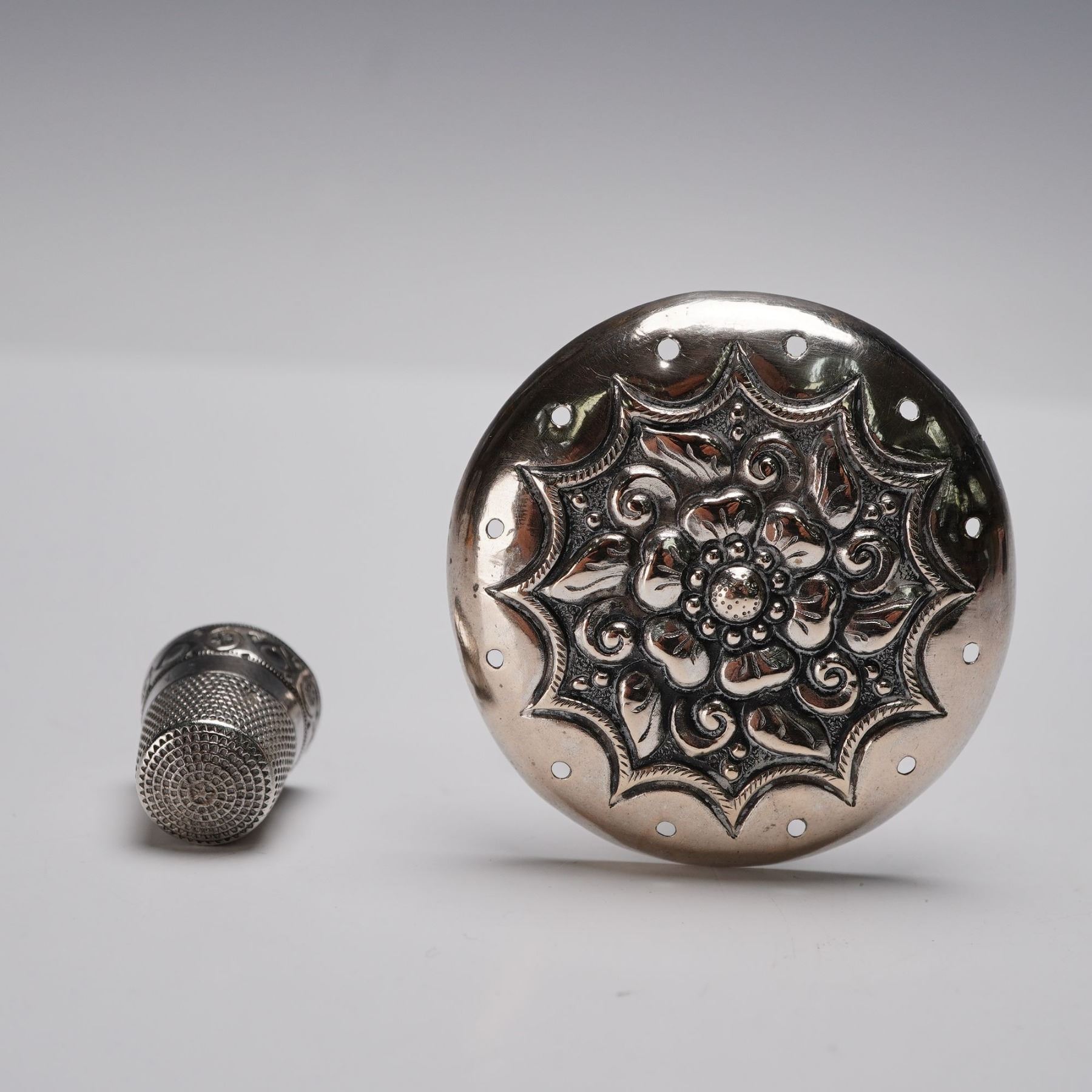 An elegant sterling silver sewing set featuring a finely detailed thimble and a hat pin holder with a raised floral design. The thimble displays a textured top and patterned band, while the holder showcases pierced and embossed decoration with graceful shaping. Together they reflect refined artistry and practical beauty. Thimble marked Sterling. Thimble marked with S in Shield backstamp. Net weight: 28 g.
