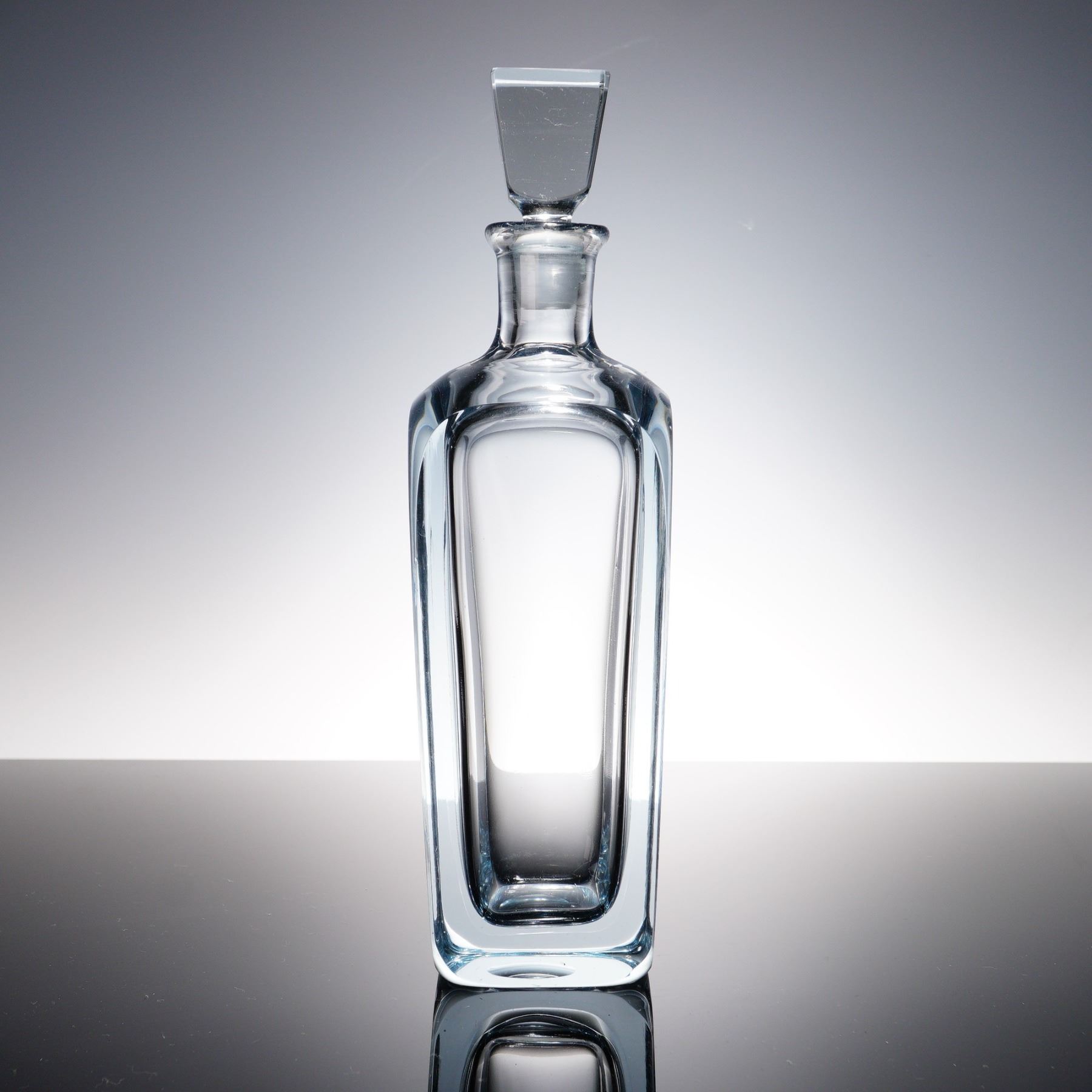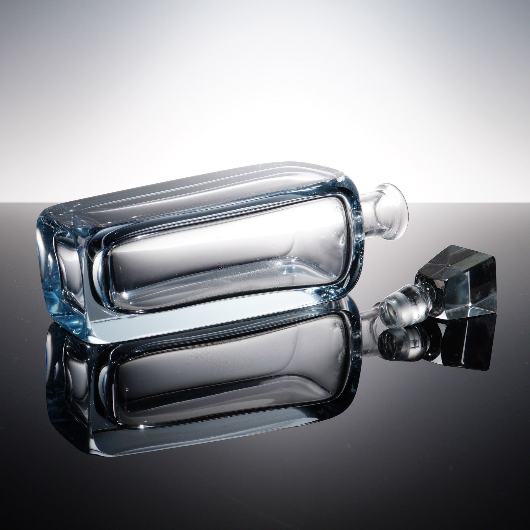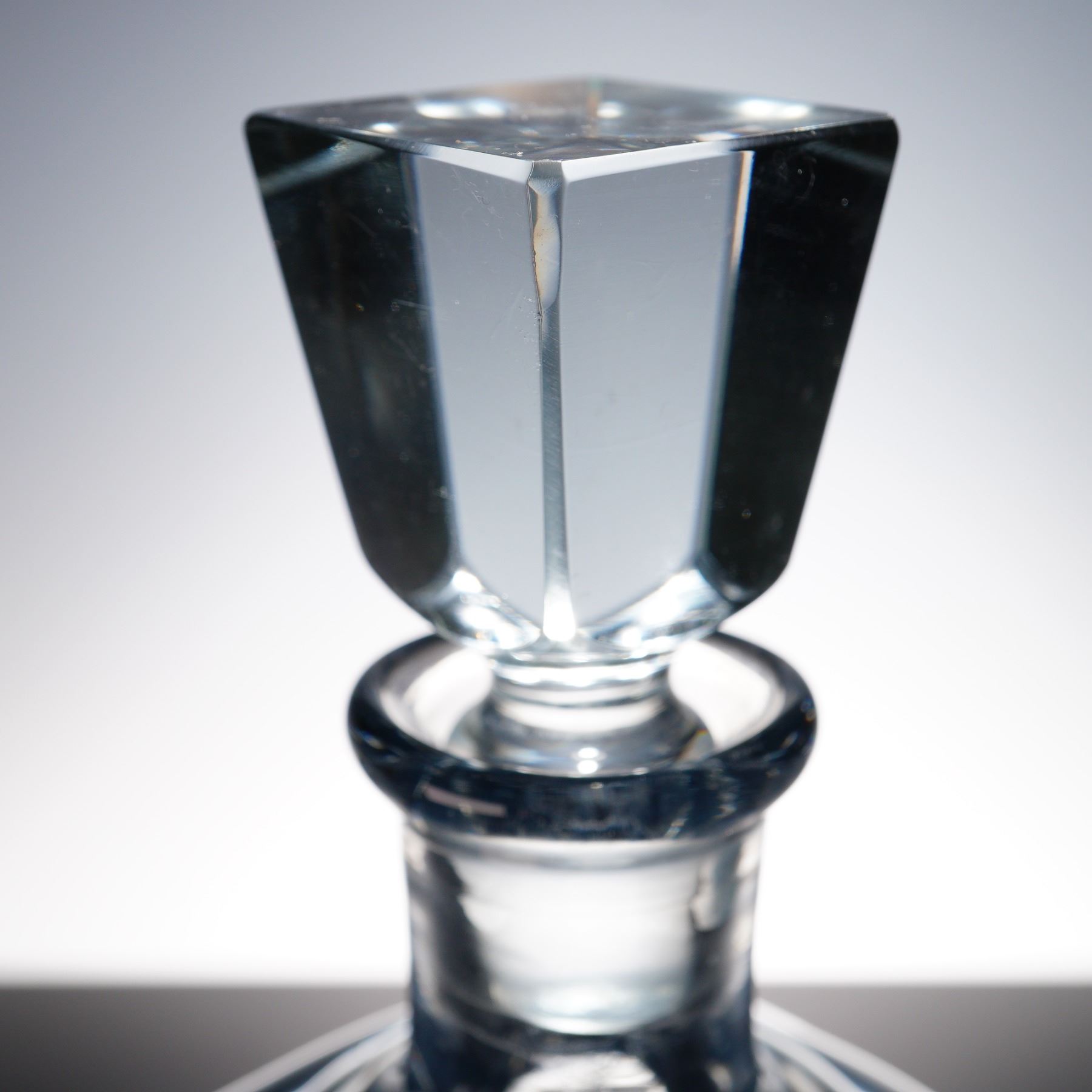 Mid-20th century Swedish art glass decanter by Strombergshyttan, featuring a heavy clear body with soft bluish tone and squared tapering form. Topped with an angular faceted stopper. Artist signature on base.