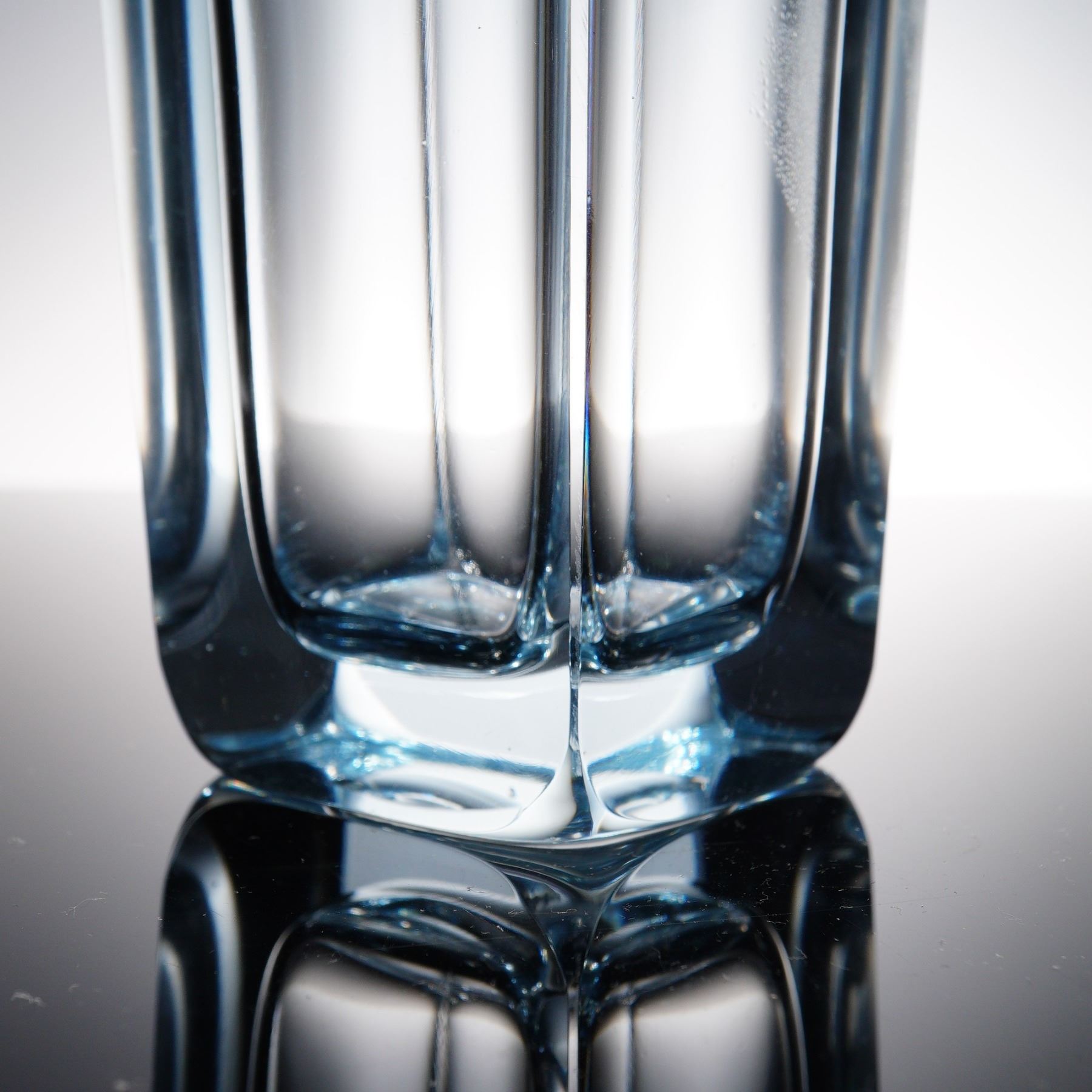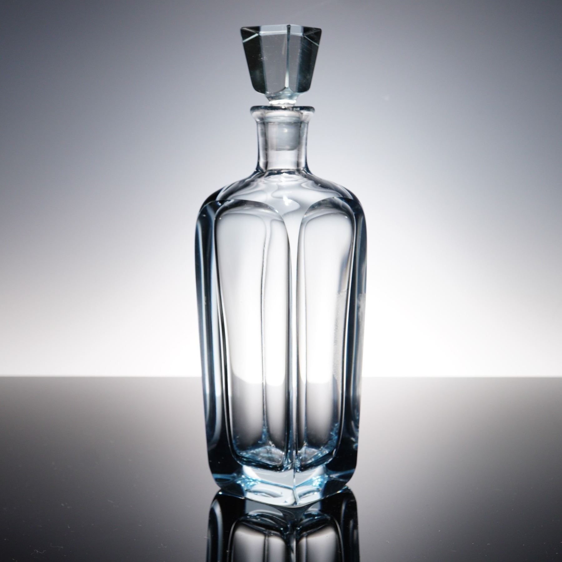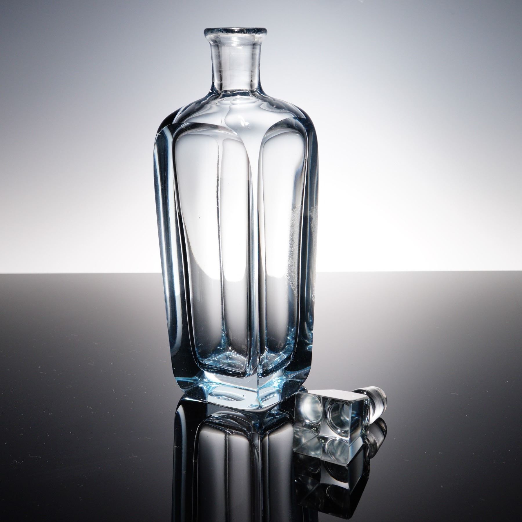Mid-20th century Swedish art glass decanter by Strombergshyttan, featuring a heavy clear body with soft bluish tone and squared tapering form. Topped with an angular faceted stopper. Artist signature on base.