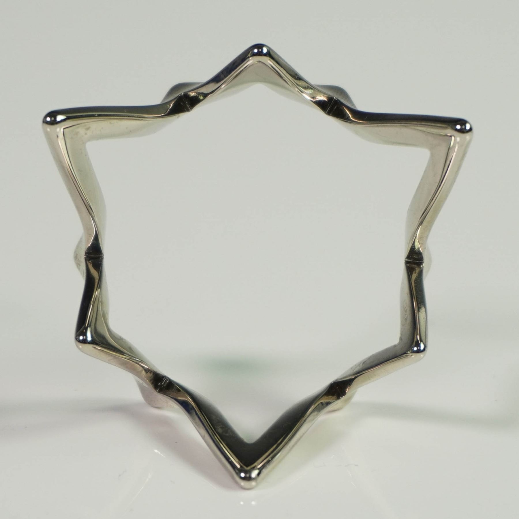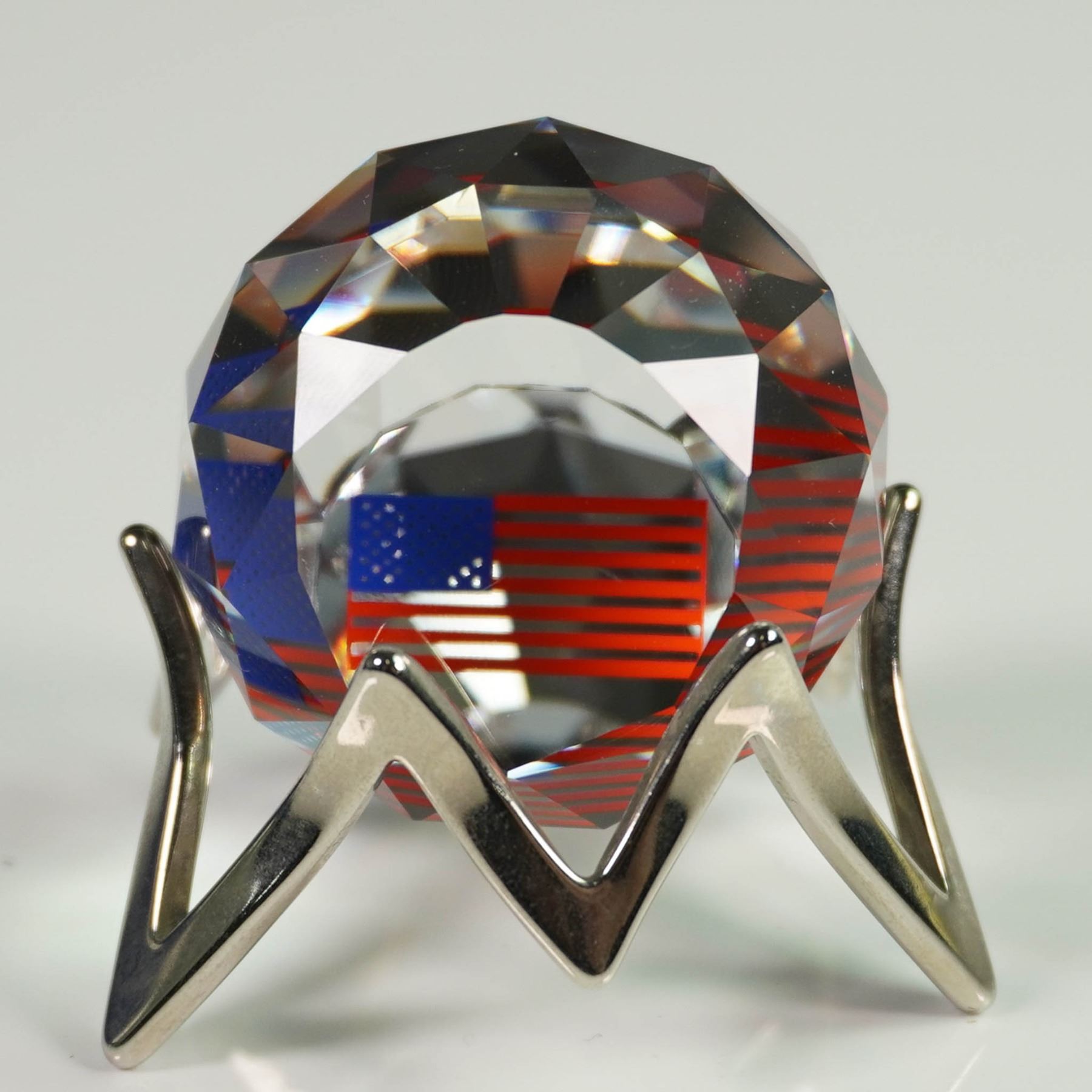 This crystal paperweight features a multi-faceted clear crystal sphere with American flag imagery embedded within. The piece rests on a chrome-colored metal stand shaped in a zigzag form. This item has its original box. This item has a base included: 2"W x 1"H.