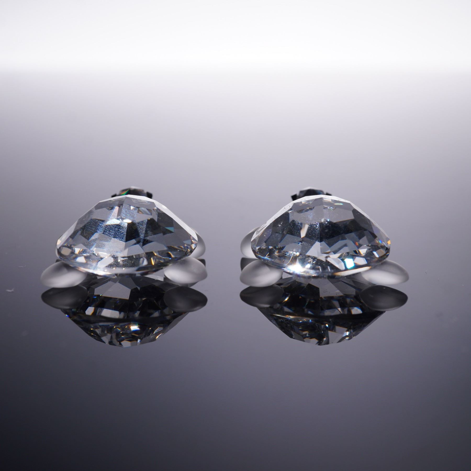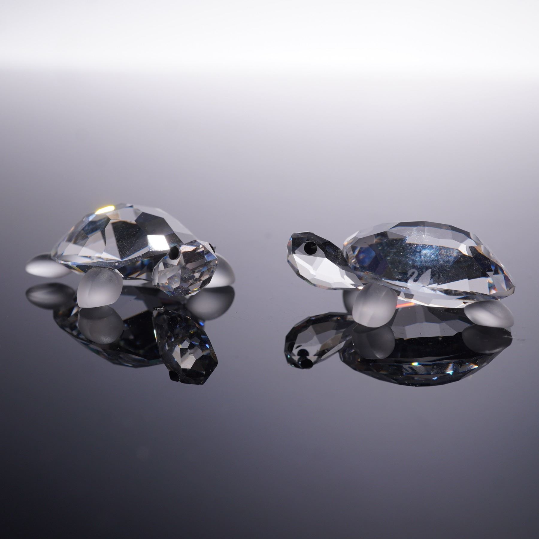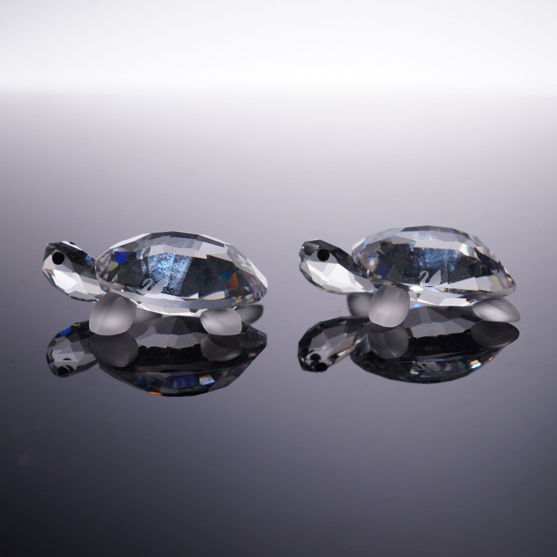 Pair of Swarovski crystal baby turtles from the Baby Animals series, model 220960. Each turtle is made of clear faceted crystal with frosted accents and measures approximately 1"L. Swarovski backstamp. Both come with their original cylindrical Swarovski storage box marked with UPC 768549030819. Box measures 2.5"H x 3.5" dia.