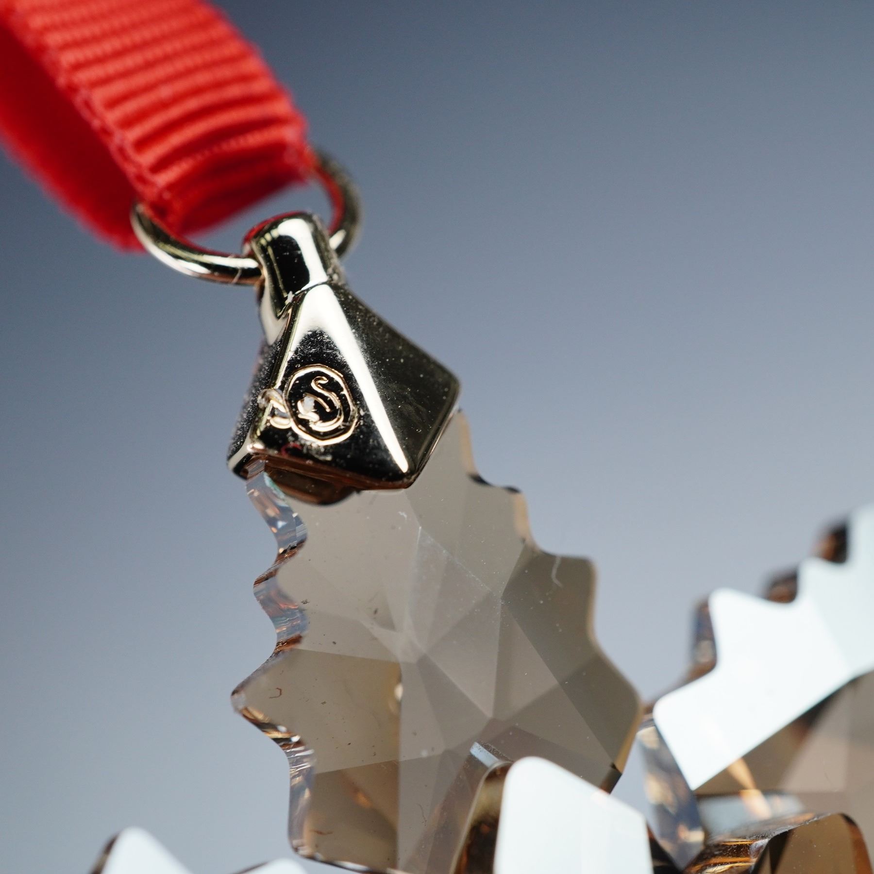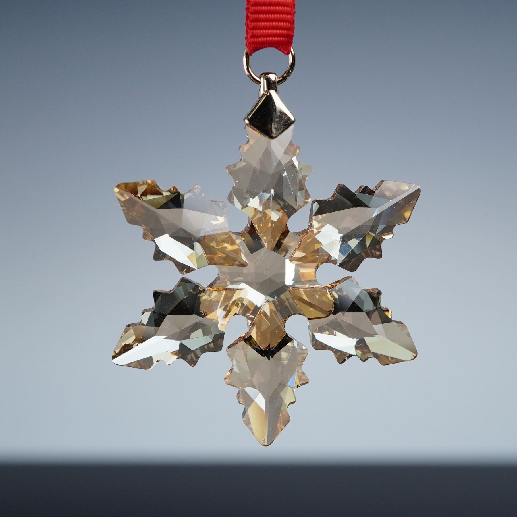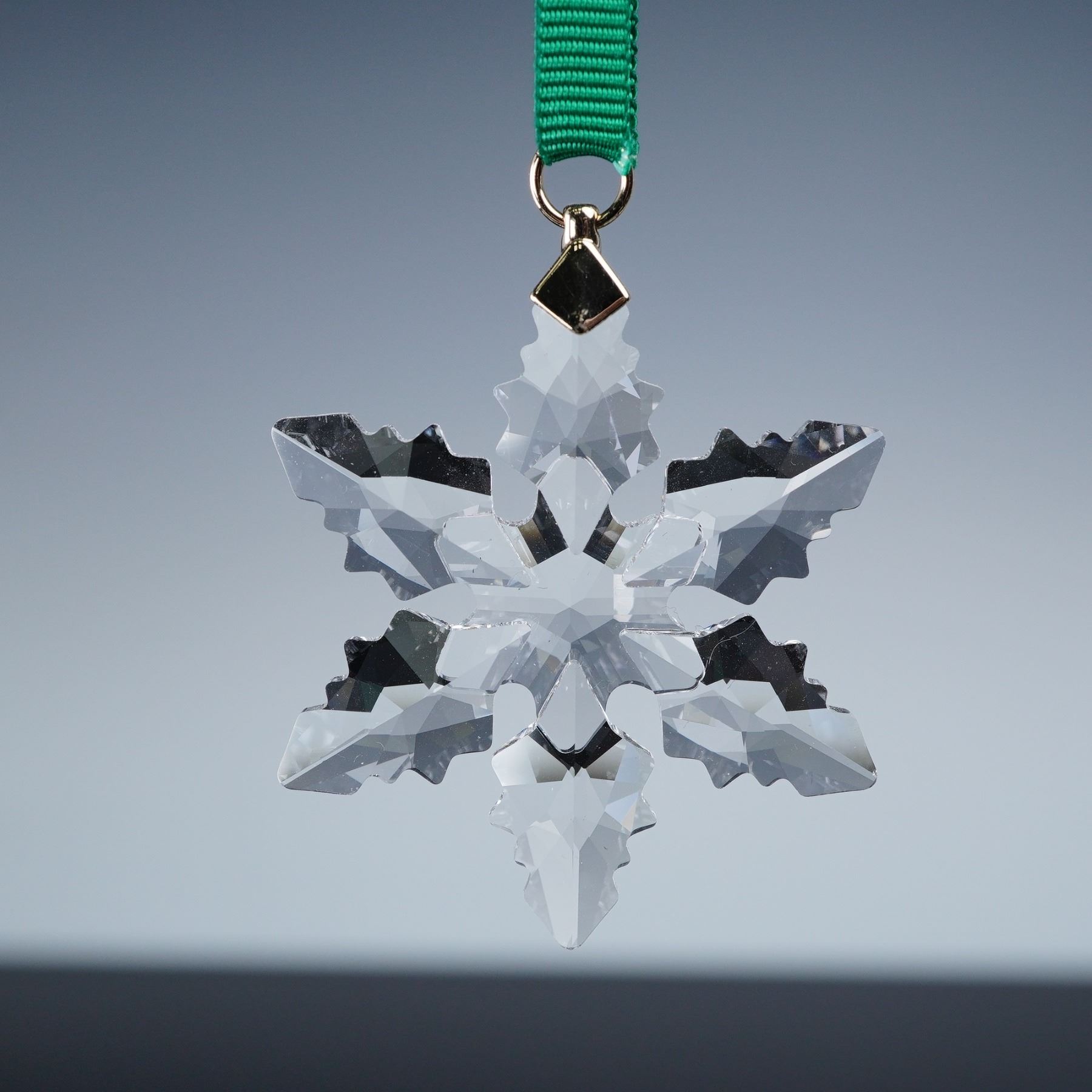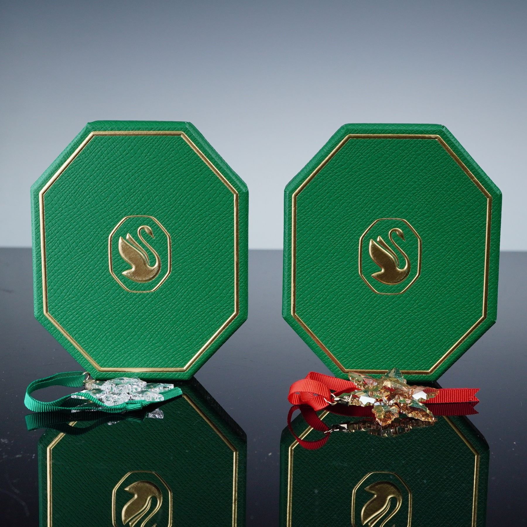 Pair of Swarovski crystal snowflake ornaments. Includes the 2024 Little Snowflake Ornament, number 5673430, a delicate faceted snowflake in clear crystal with a green ribbon, alongside a golden snowflake with a red ribbon hanger. Both are presented with their original boxes.