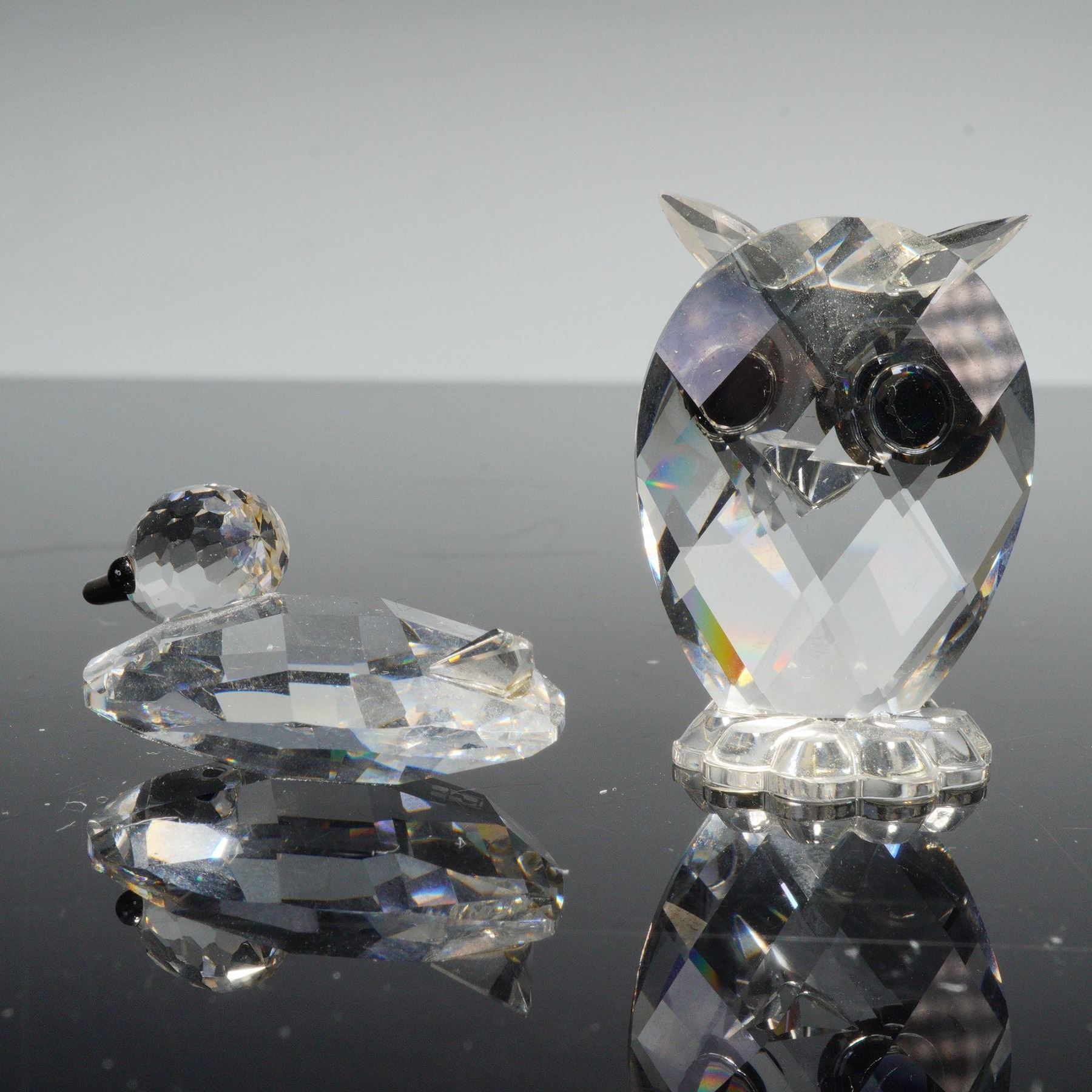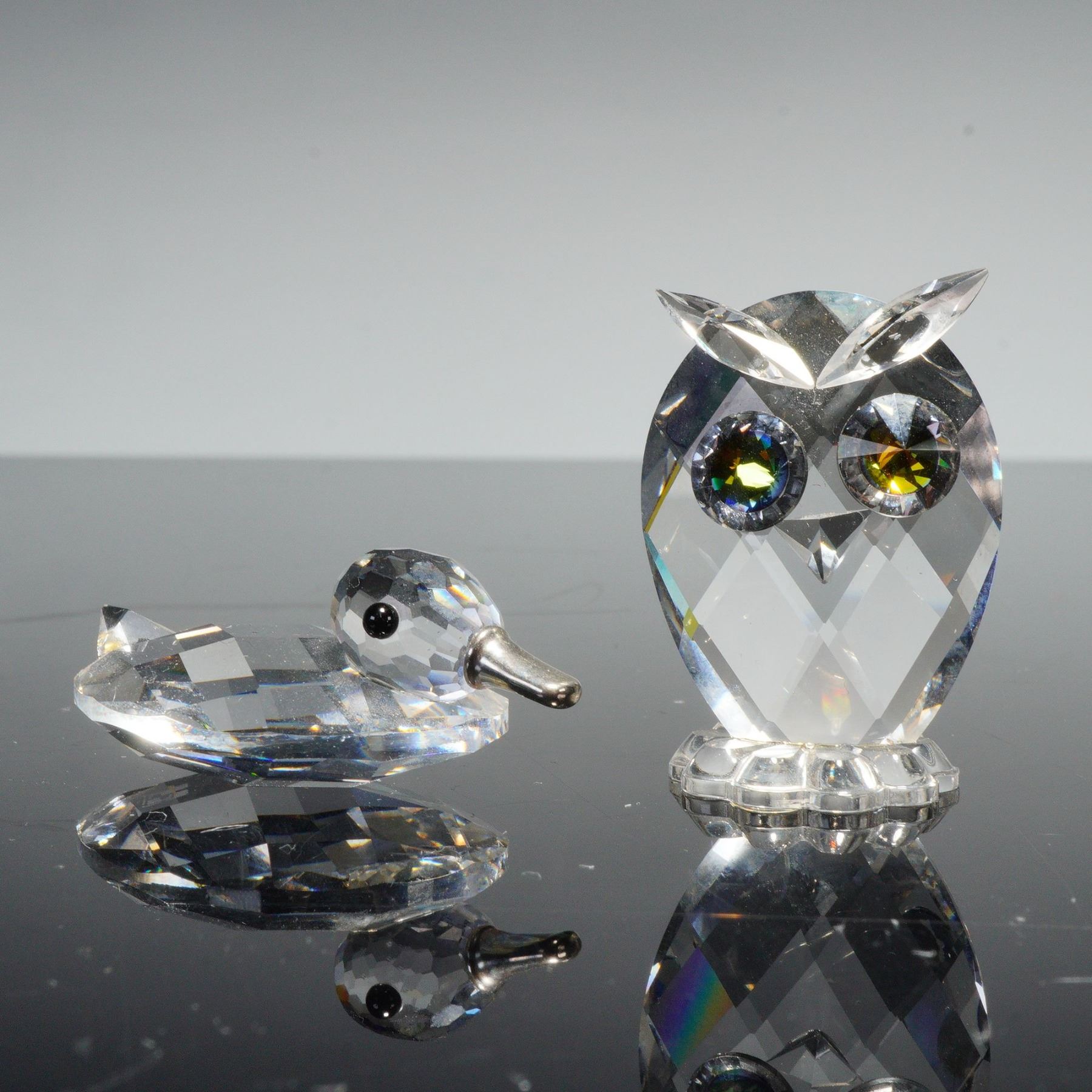 This set includes two Swarovski crystal animals: a faceted owl and a mini duck. The owl features clear crystal with Citron crystal eyes and sits on a small, round base. The duck is made from clear faceted crystal with black eyes and a silver-colored metal bill (beak). Swarovski backstamp.