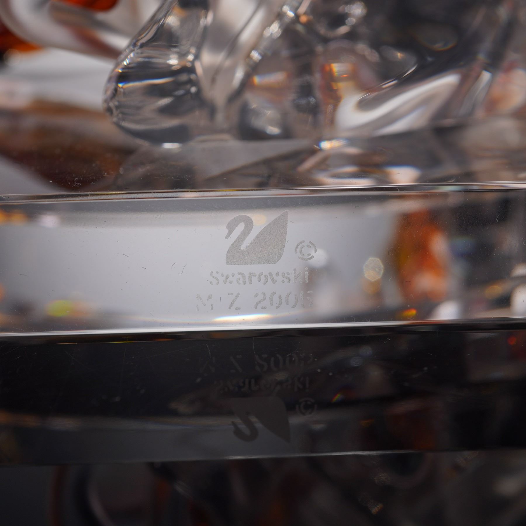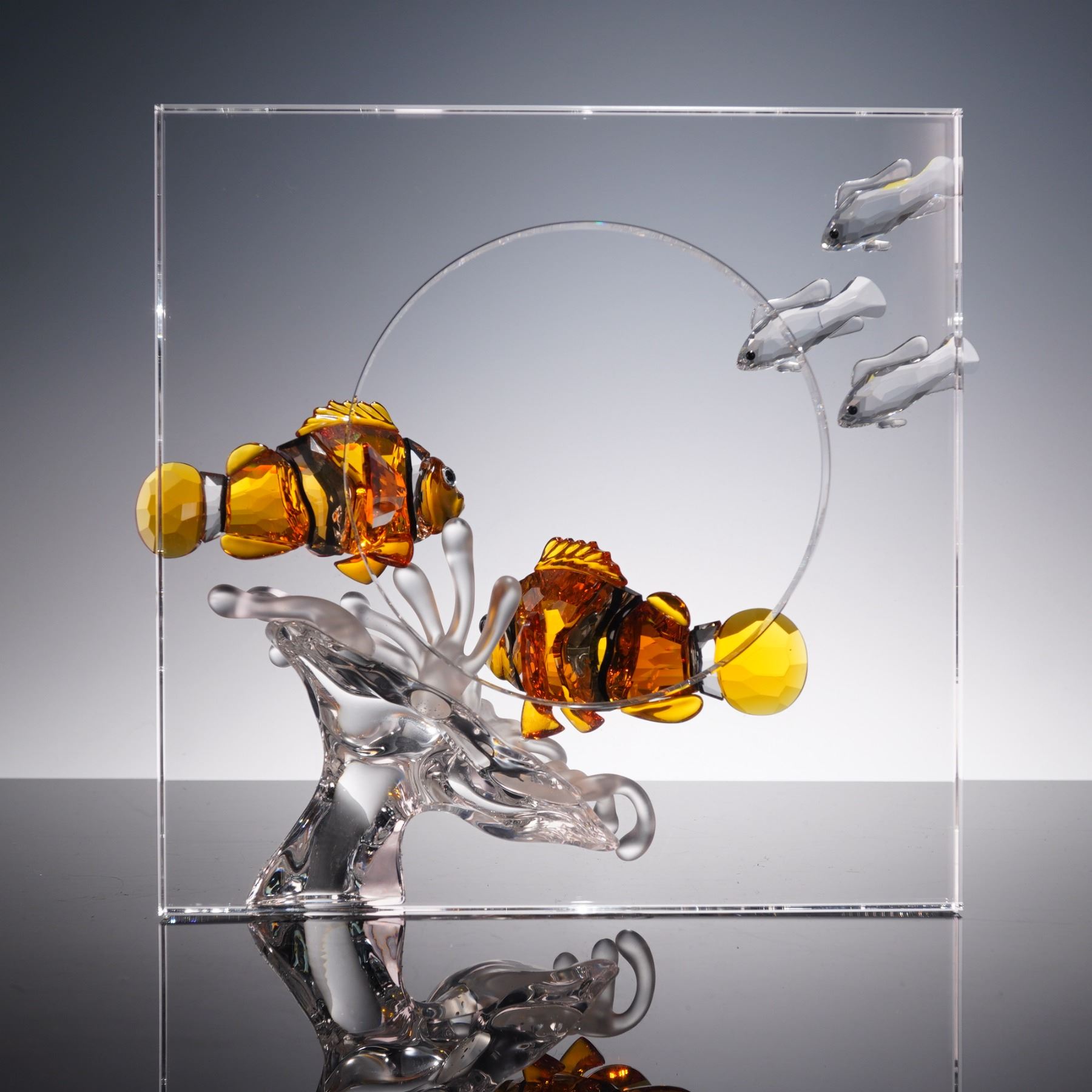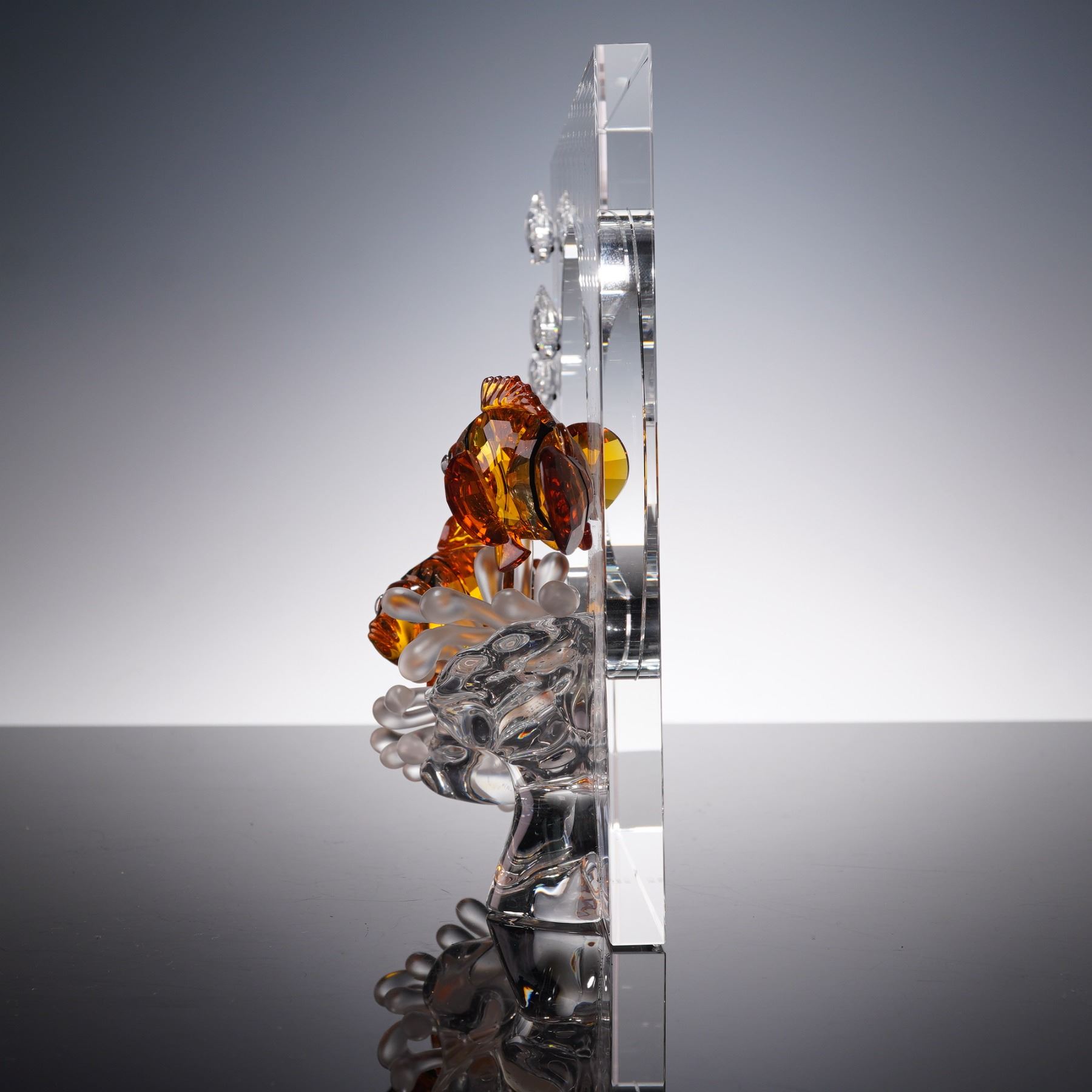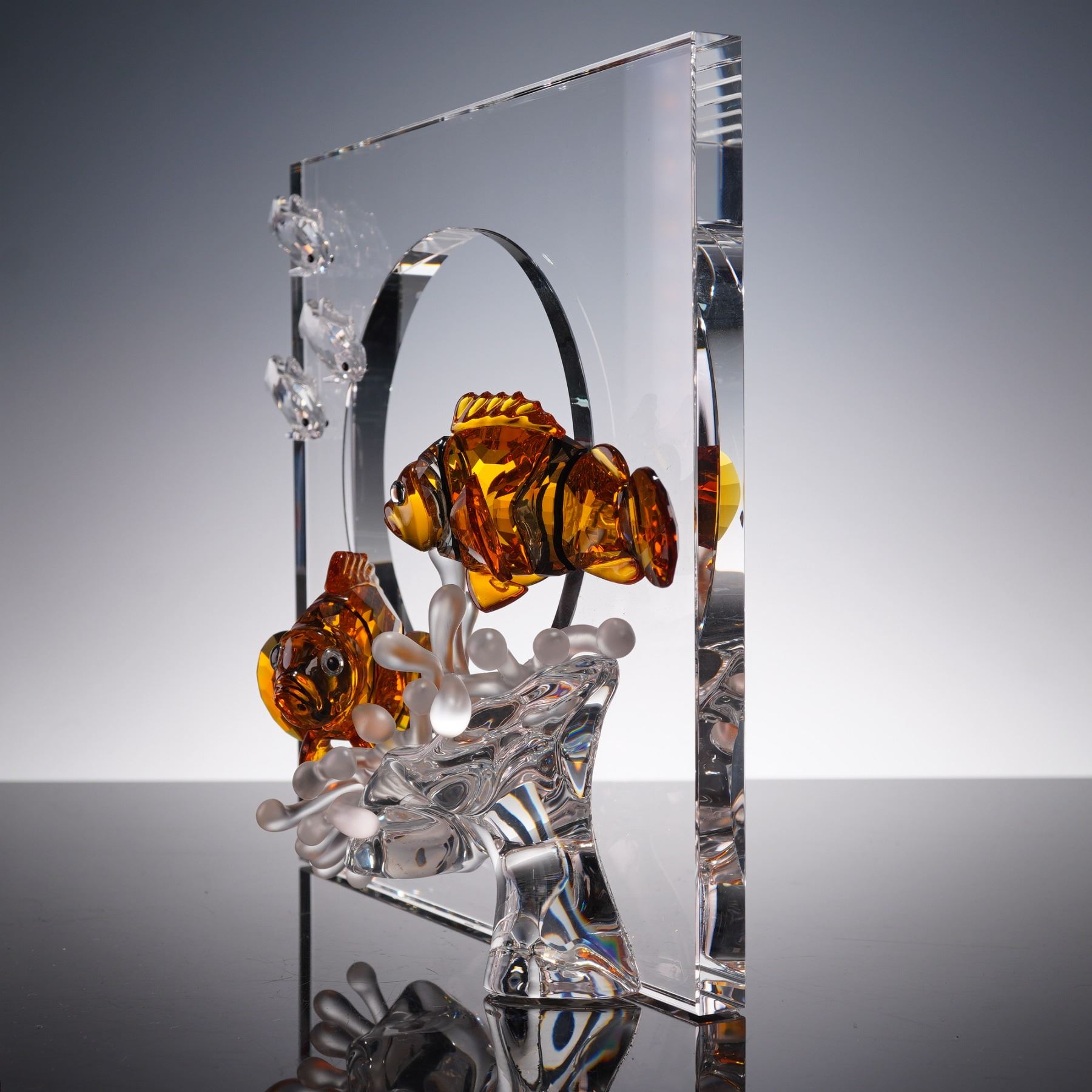 This exquisite Swarovski crystal set from the "Wonders of the Sea" collection features the stunning Harmony figurine, accompanied by its original matching plaque. Designed by the renowned Martin Zendron and issued in 2005, this collectible showcases the elegance and craftsmanship that Swarovski is celebrated for. The main piece displays a vibrant underwater scene, with two brilliantly faceted orange-and-yellow clownfish gracefully swimming above crystal coral, while three clear crystal fish accent the backdrop. The coordinating plaque, also in clear crystal, is etched with the series name "Wonders of the Sea - Harmony" along with the designer's name. Both pieces bear the Swarovski swan hallmark, ensuring authenticity. This retired piece is highly sought after by collectors and remains in excellent condition, displaying dazzling sparkle from every angle.