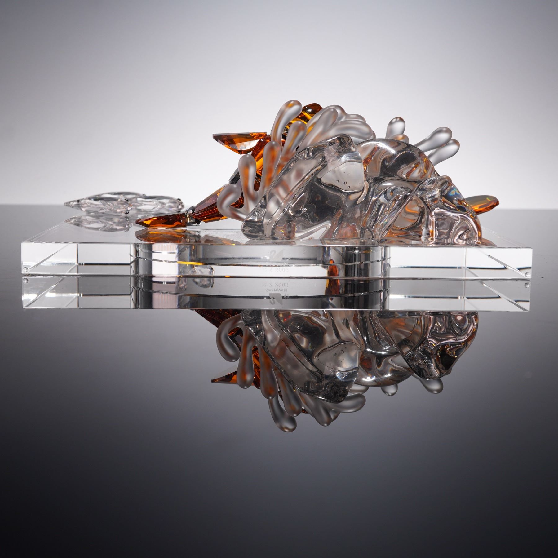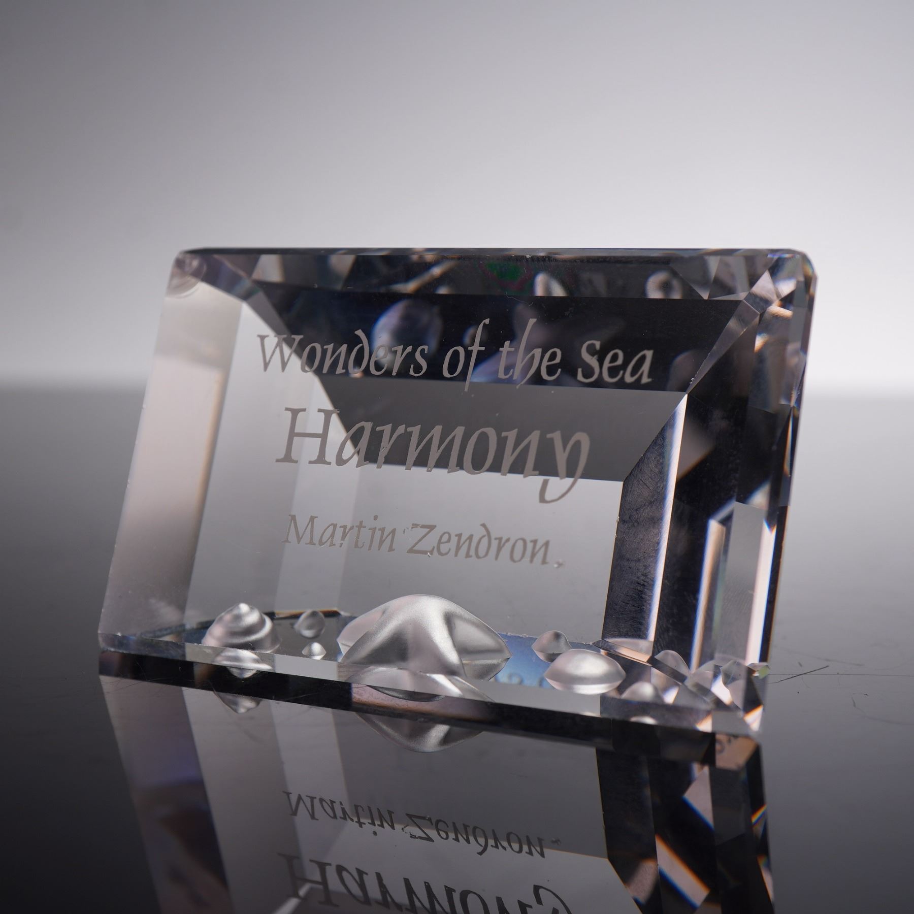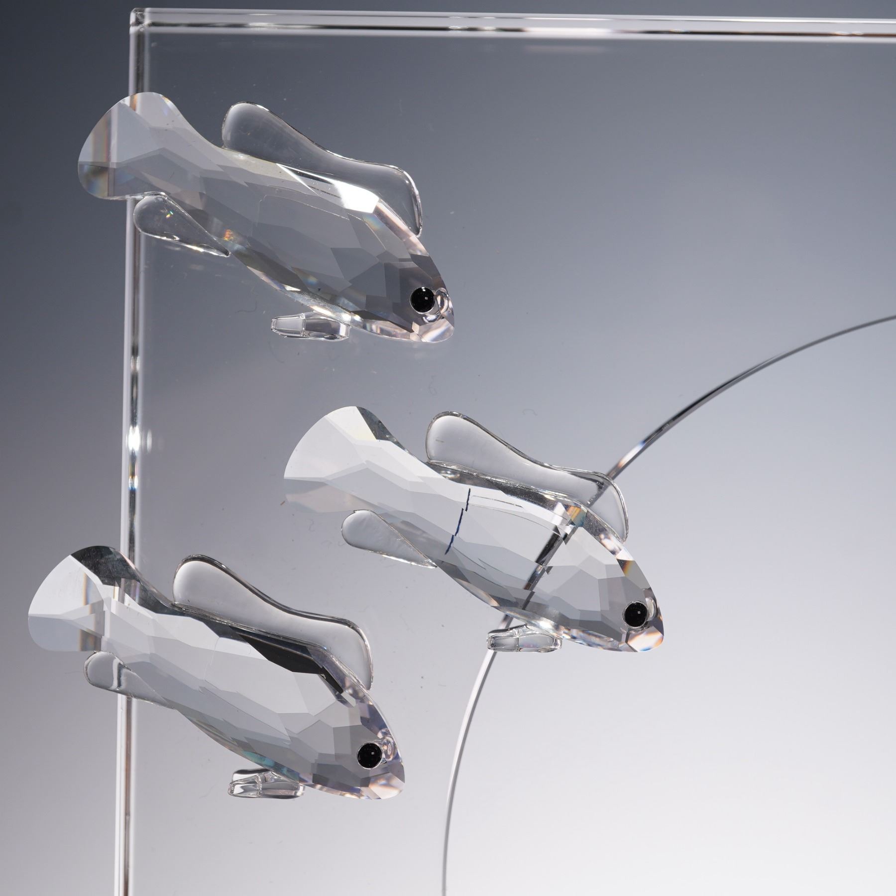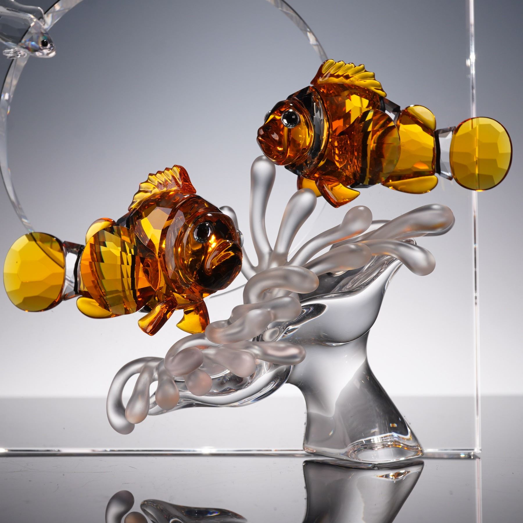 This exquisite Swarovski crystal set from the "Wonders of the Sea" collection features the stunning Harmony figurine, accompanied by its original matching plaque. Designed by the renowned Martin Zendron and issued in 2005, this collectible showcases the elegance and craftsmanship that Swarovski is celebrated for. The main piece displays a vibrant underwater scene, with two brilliantly faceted orange-and-yellow clownfish gracefully swimming above crystal coral, while three clear crystal fish accent the backdrop. The coordinating plaque, also in clear crystal, is etched with the series name "Wonders of the Sea - Harmony" along with the designer's name. Both pieces bear the Swarovski swan hallmark, ensuring authenticity. This retired piece is highly sought after by collectors and remains in excellent condition, displaying dazzling sparkle from every angle.