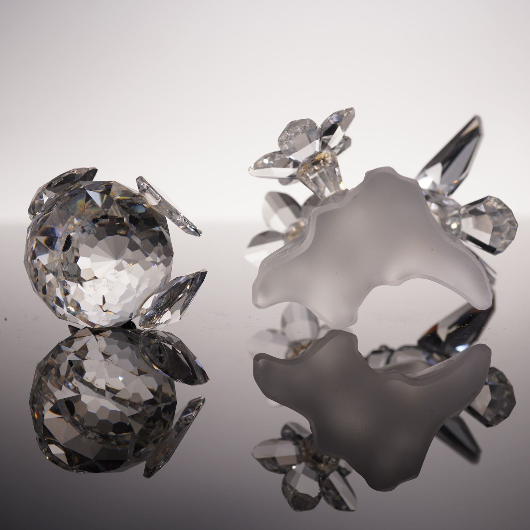 Swarovski crystal figurines designed by Claudia Schneiderbauer and Max Schreck. The hummingbird is shown in mid-flight, poised over a faceted crystal flower mounted on a frosted crystal base, highlighting Swarovski's artistry in capturing delicate natural forms. The large sparrow figurine features a faceted round body with expressive black crystal eyes and wings in clear crystal. Both pieces exhibit brilliant sparkle and fine detailing, and include original box packaging. 166184, 7650 032 000.
