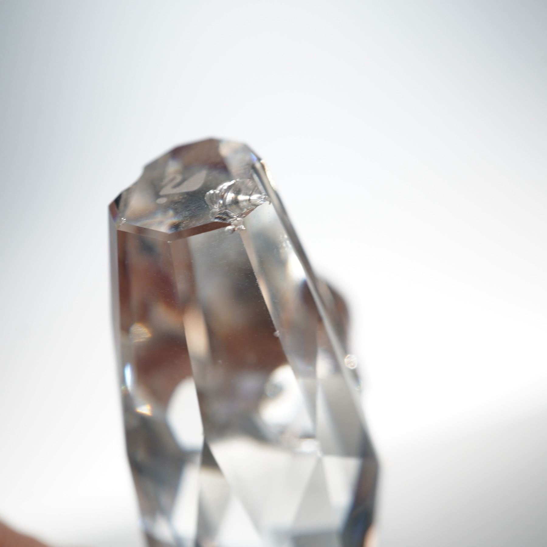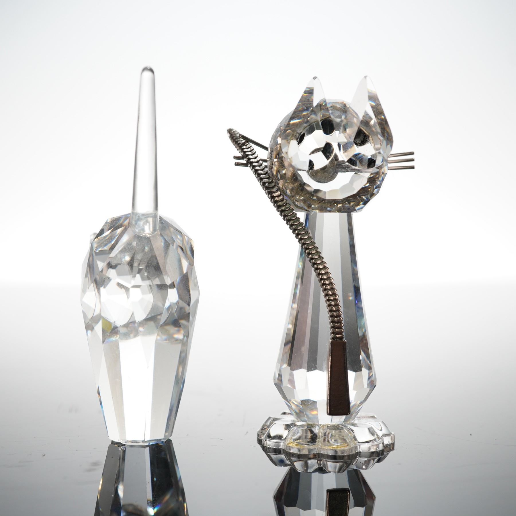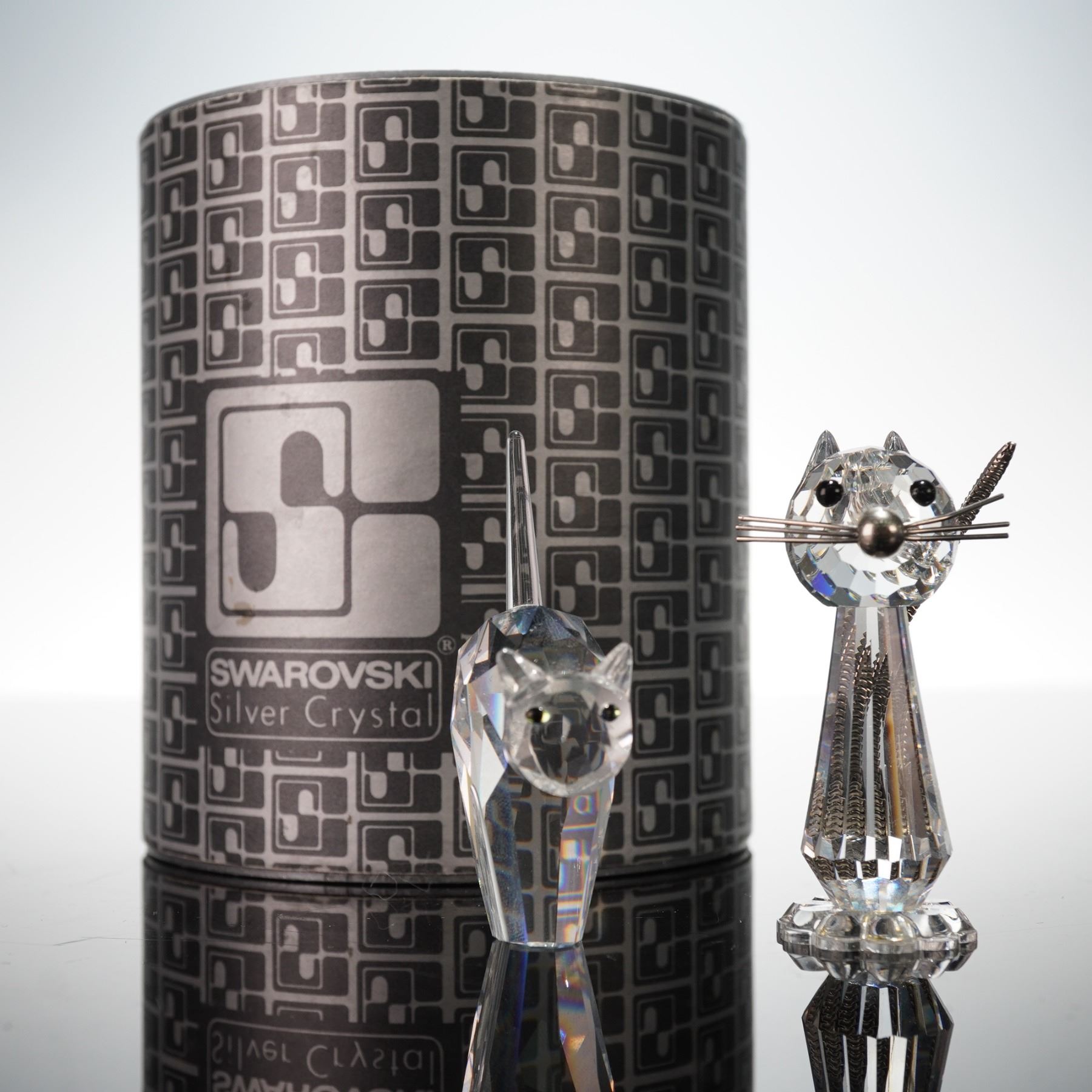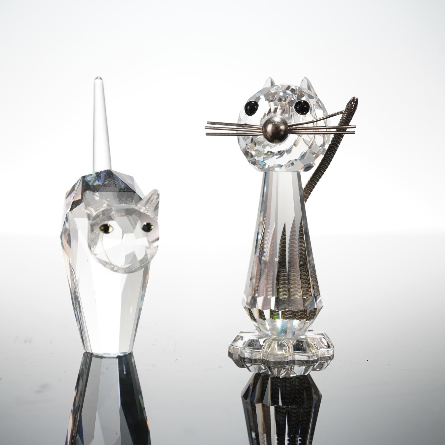 Figurines including the Medium Cat, designed by Max Schreck, and the Tom Cat, designed by Anton Hirzinger. Each is crafted in faceted clear crystal with jet-black eyes and metal accents forming the whiskers and tails. Both pieces bear the etched Swan logo and exemplify Swarovski's Silver Crystal series quality. Includes original cylindrical packaging. 7634 052 000. 198241.