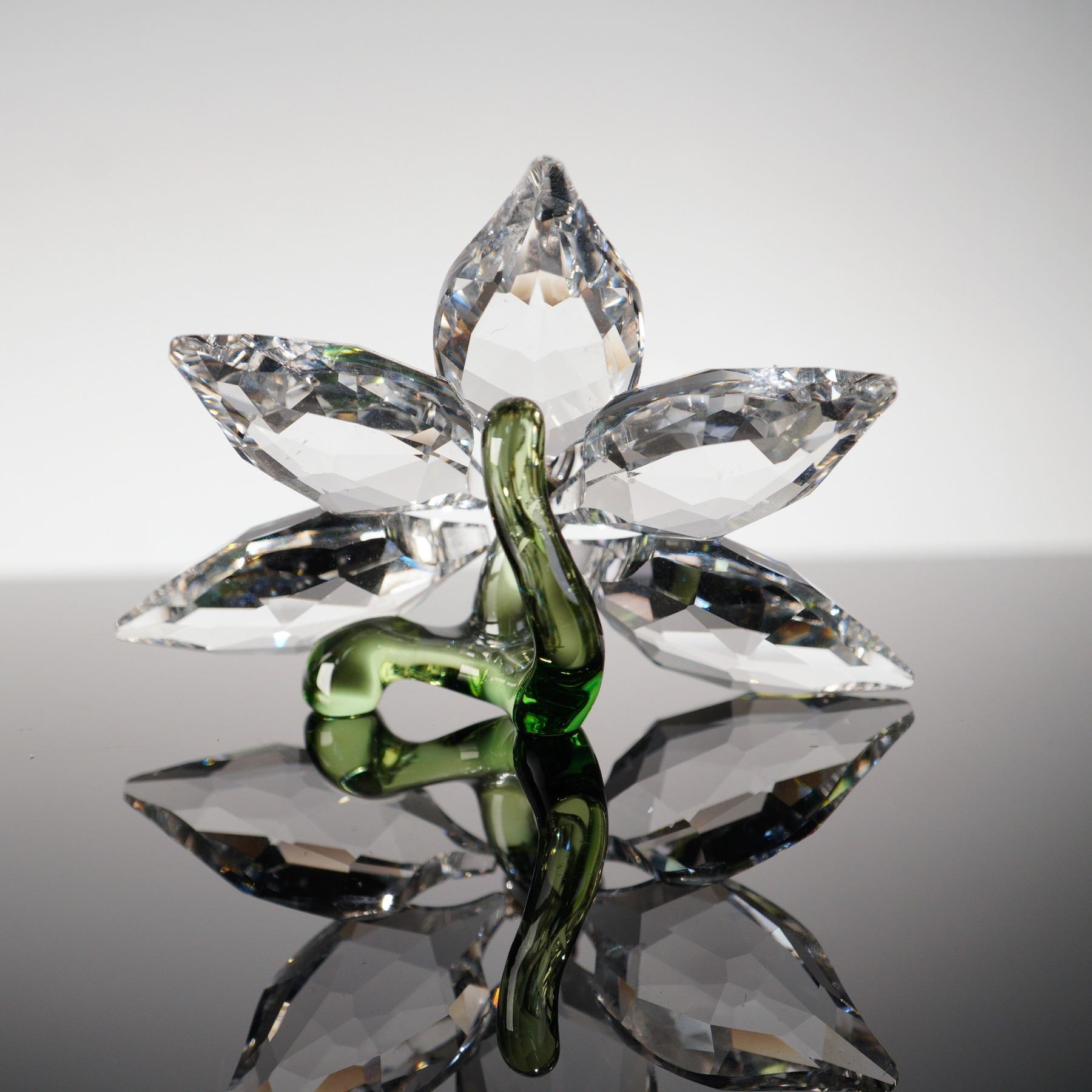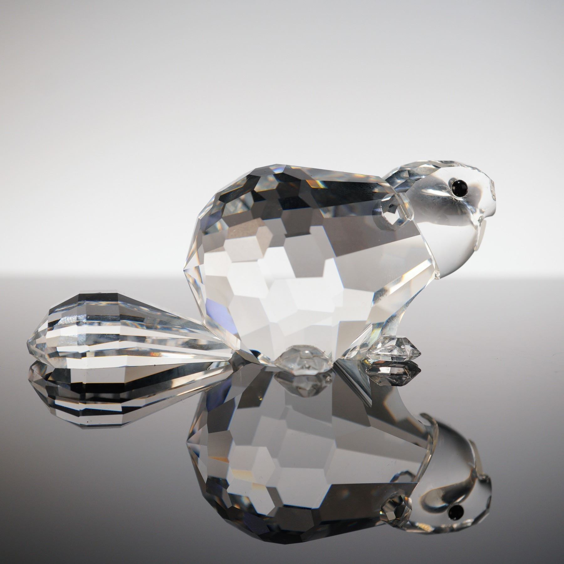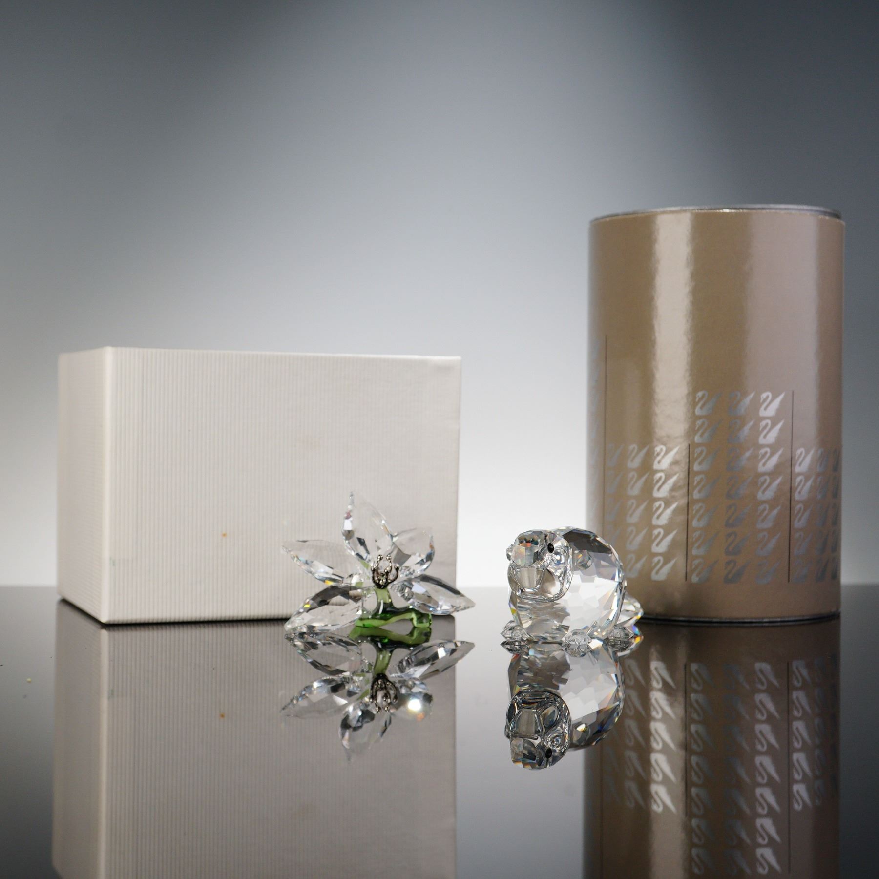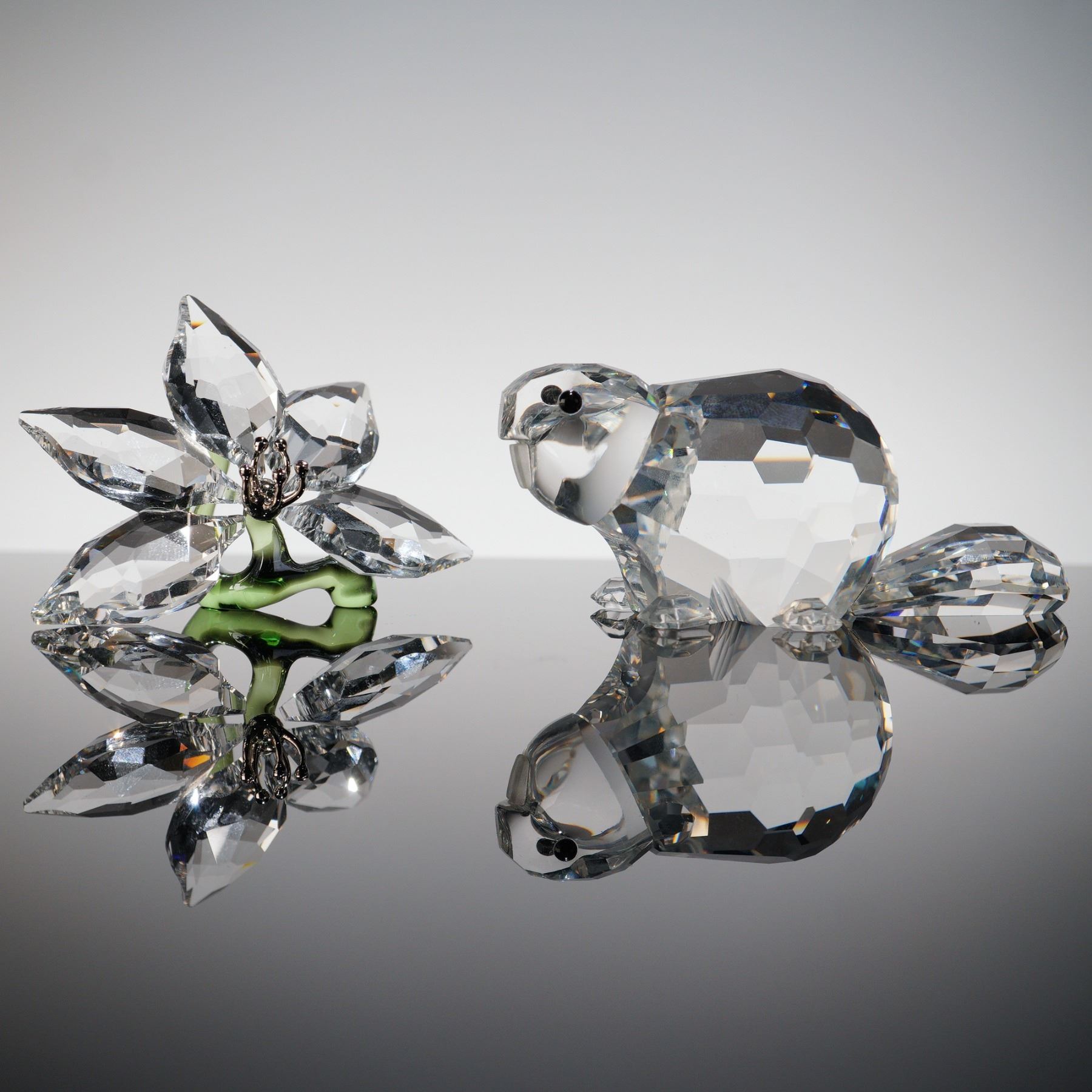 Lot of two Swarovski crystal figurines including a Mother Beaver 7616 with faceted clear crystal body and a floral ornament with green stem and faceted petals. Both with Swarovski backstamps and Beaver with its original box.
