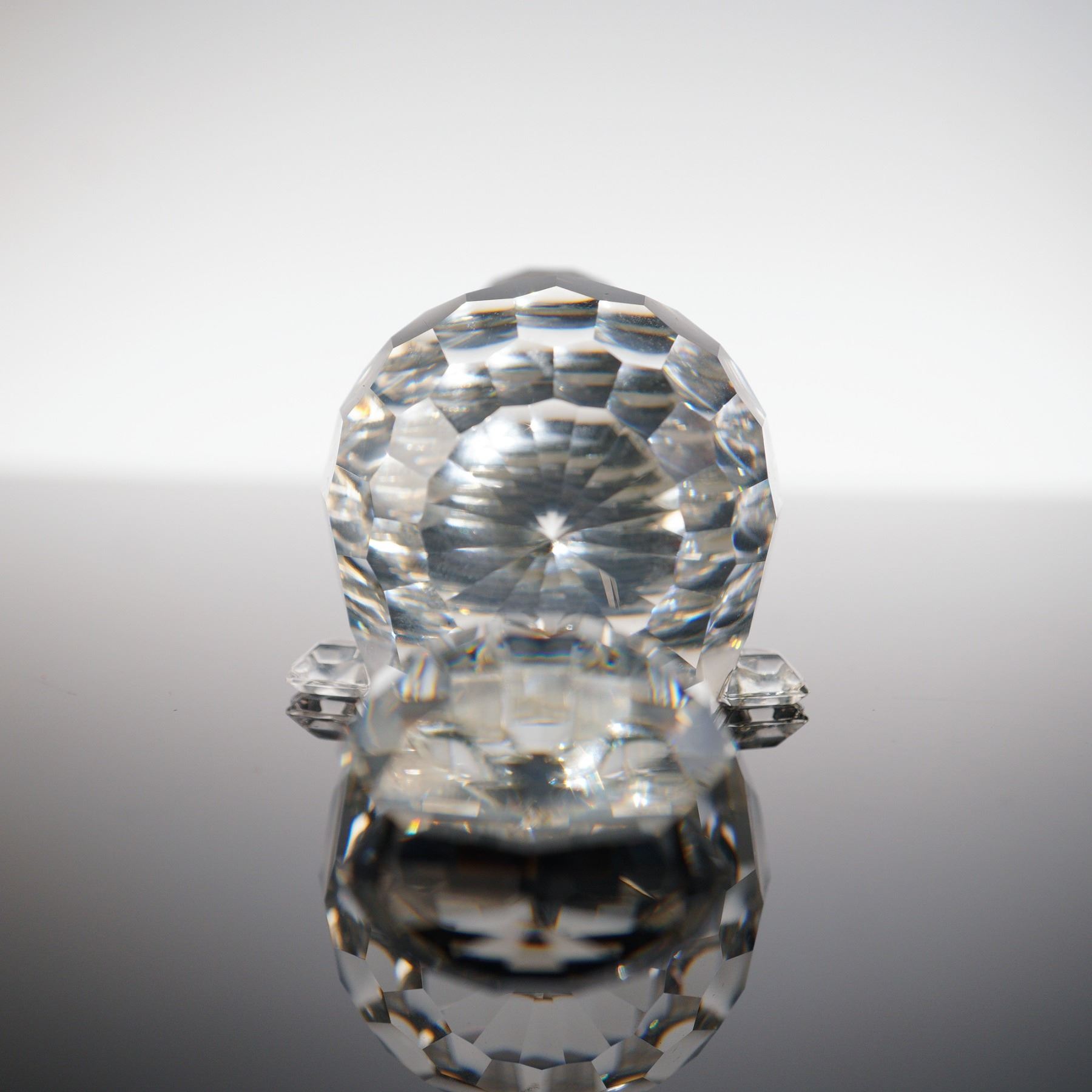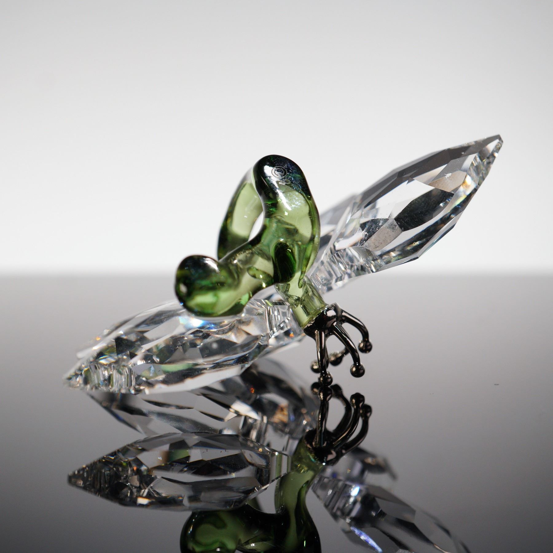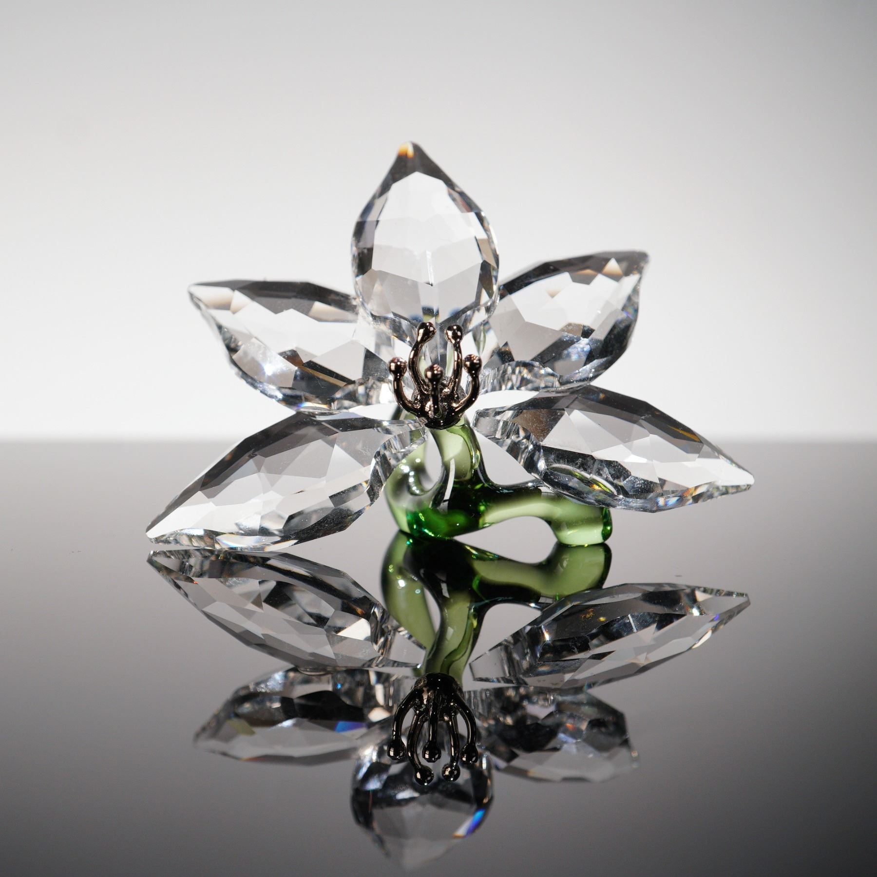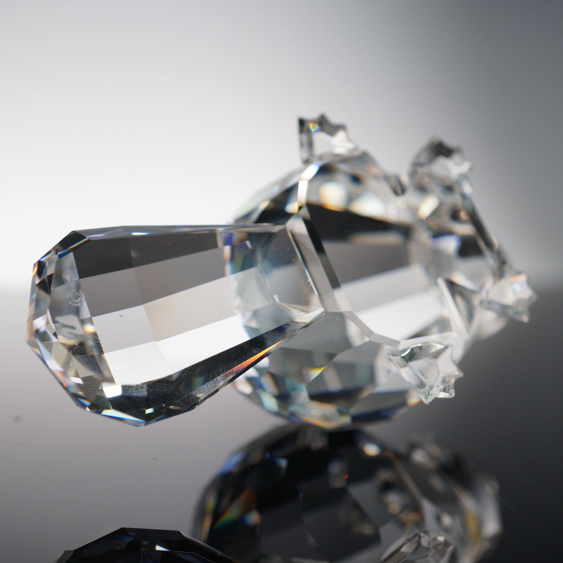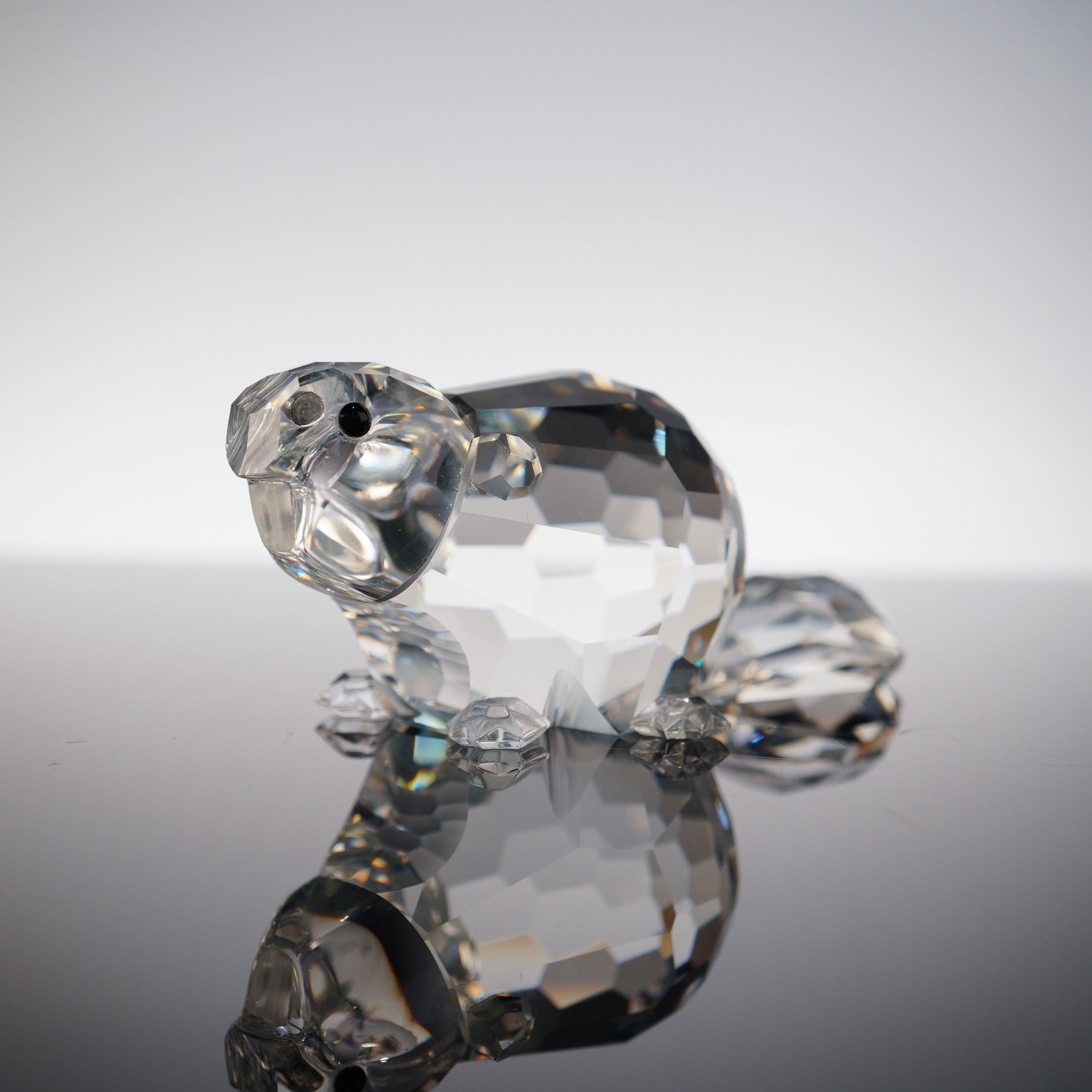 Lot of two Swarovski crystal figurines including a Mother Beaver 7616 with faceted clear crystal body and a floral ornament with green stem and faceted petals. Both with Swarovski backstamps and Beaver with its original box.