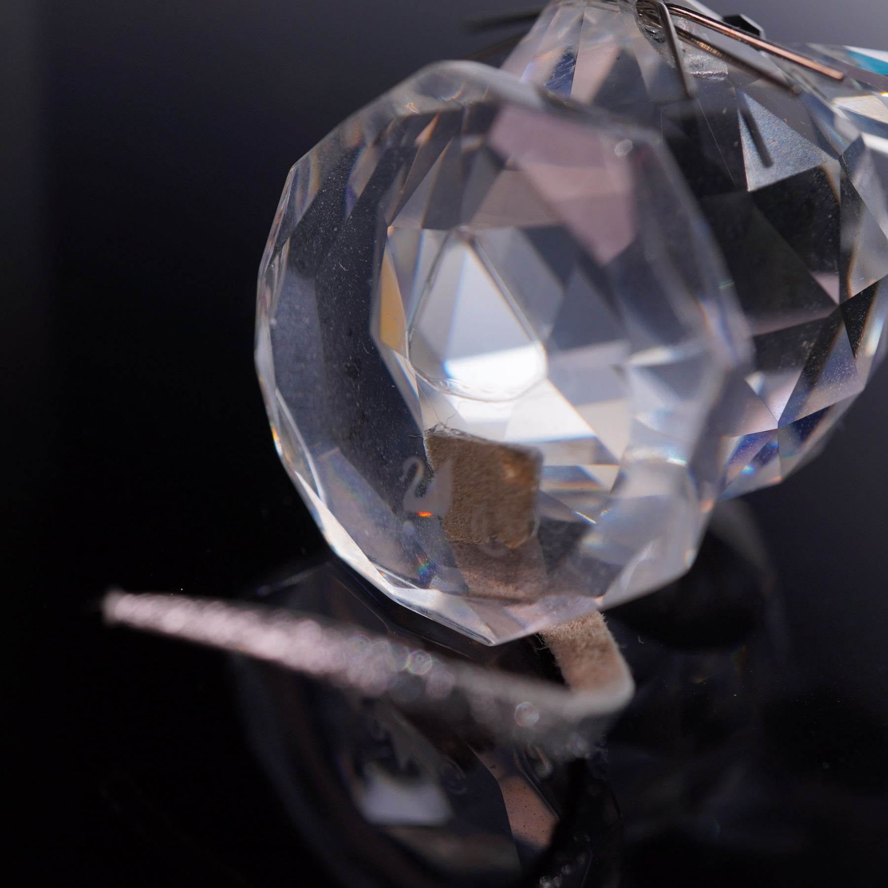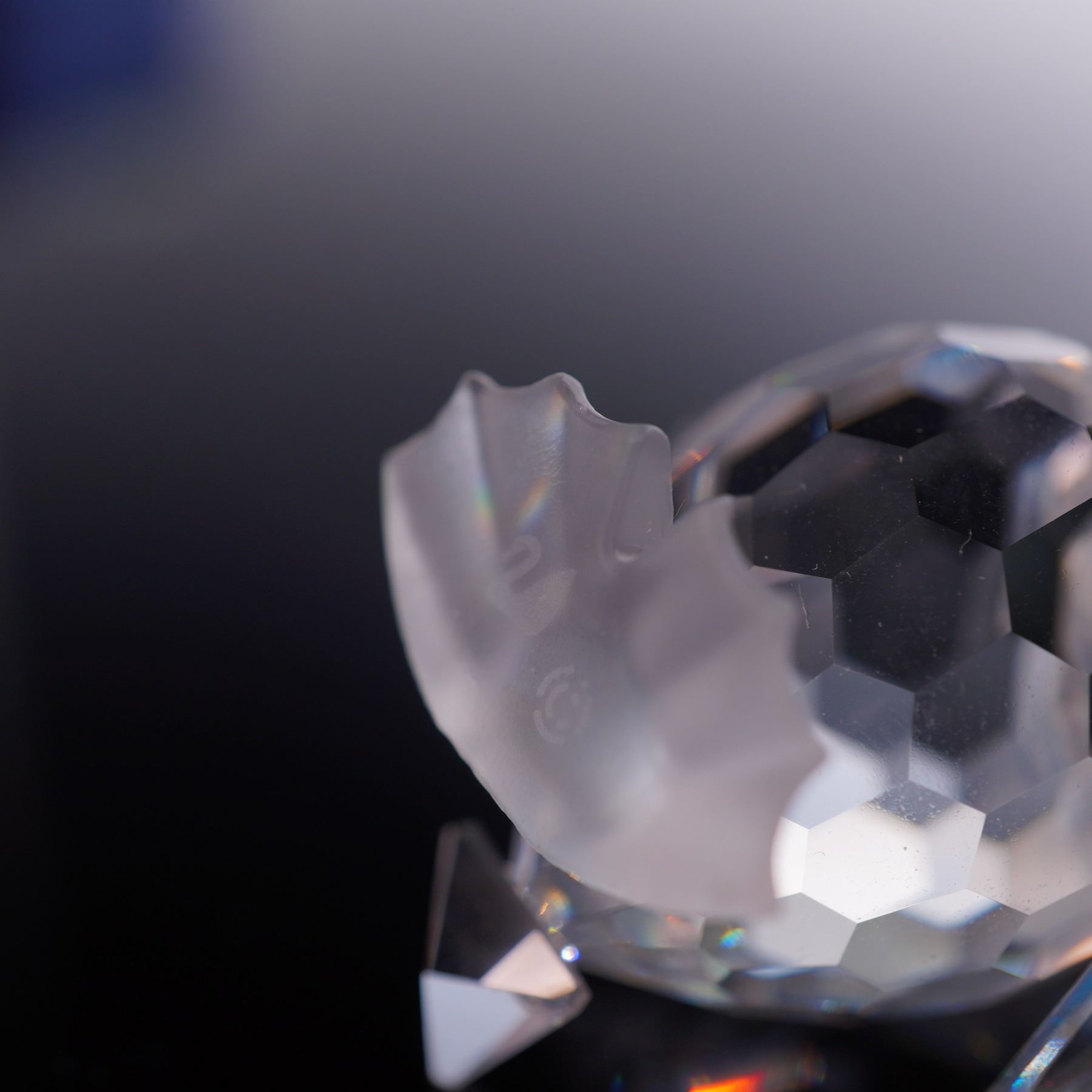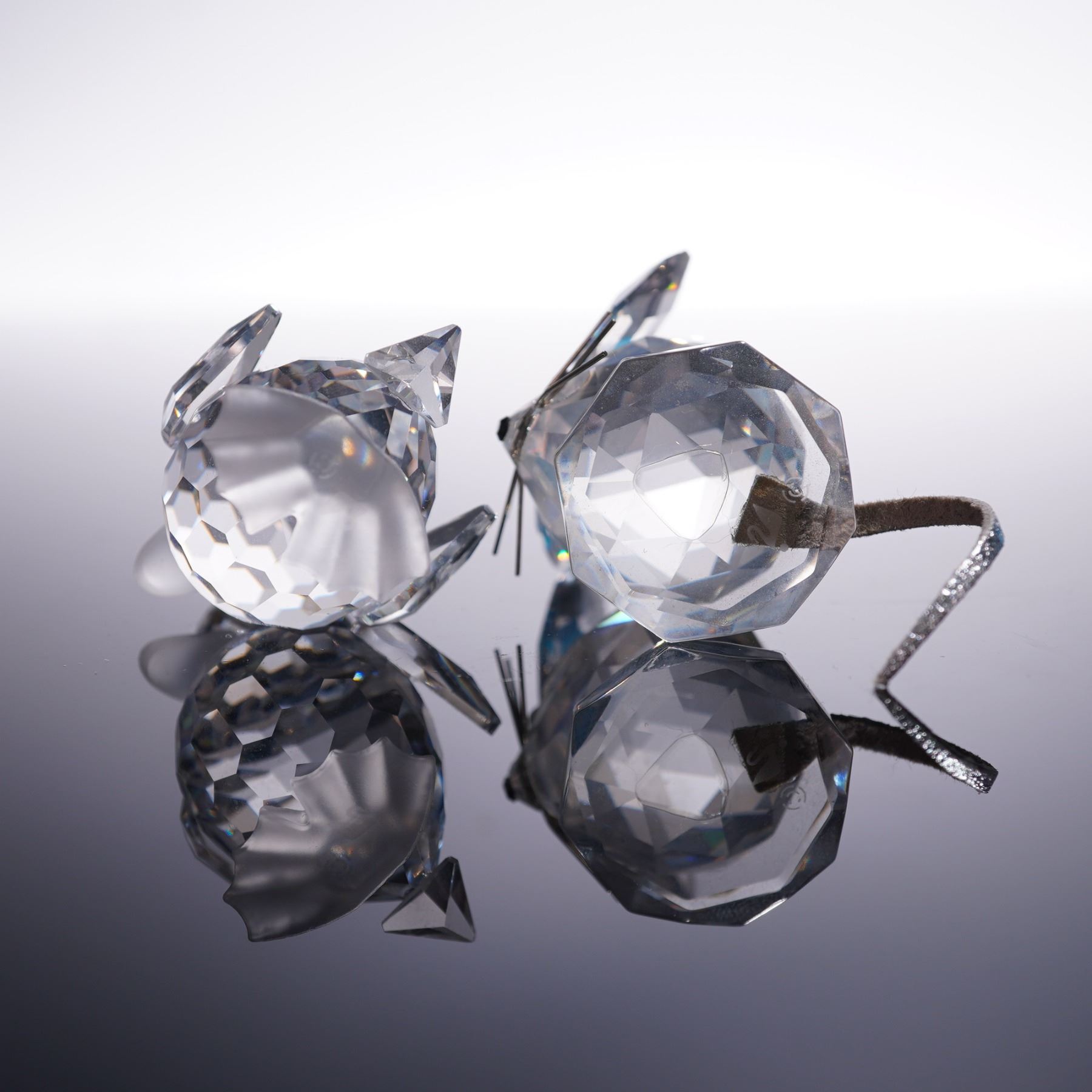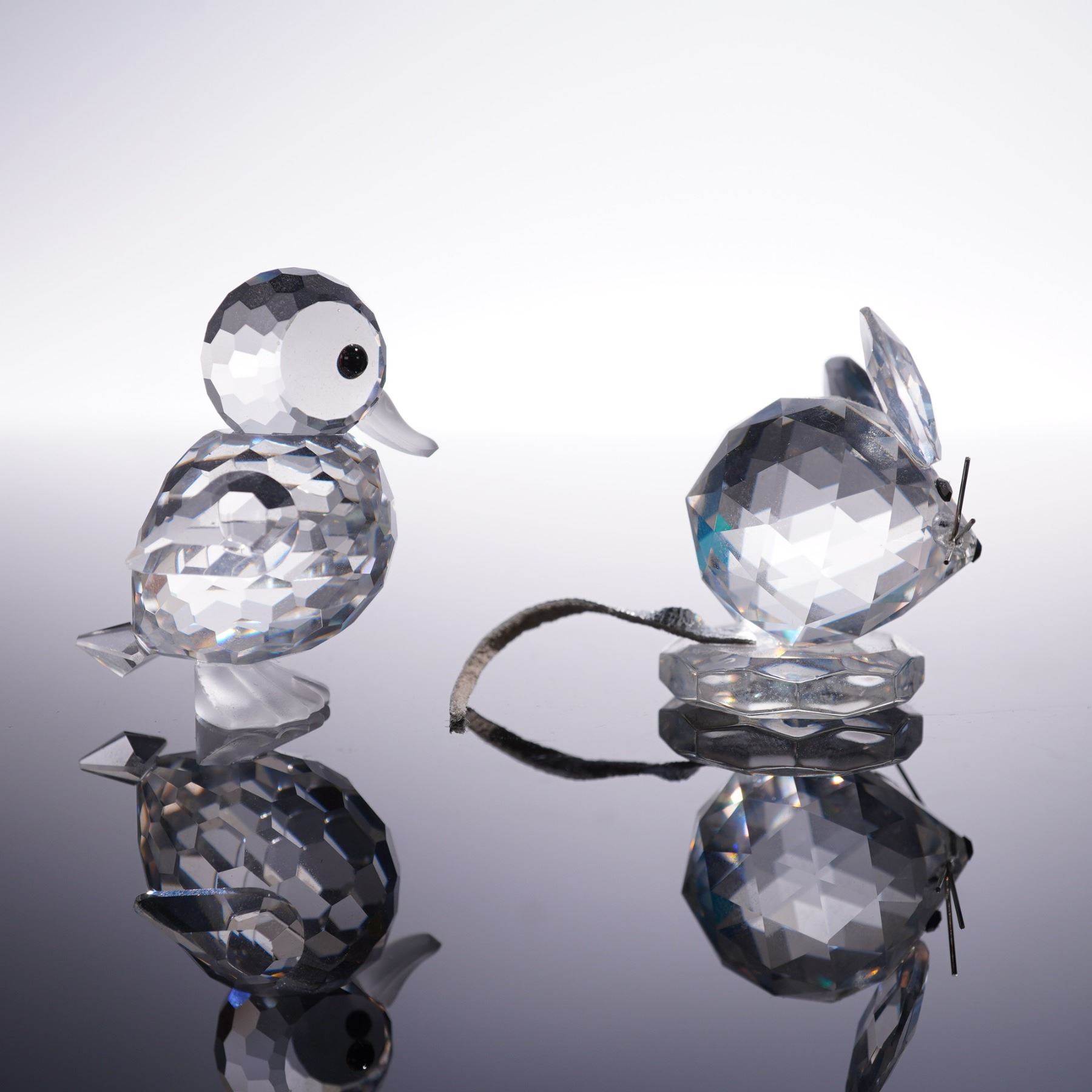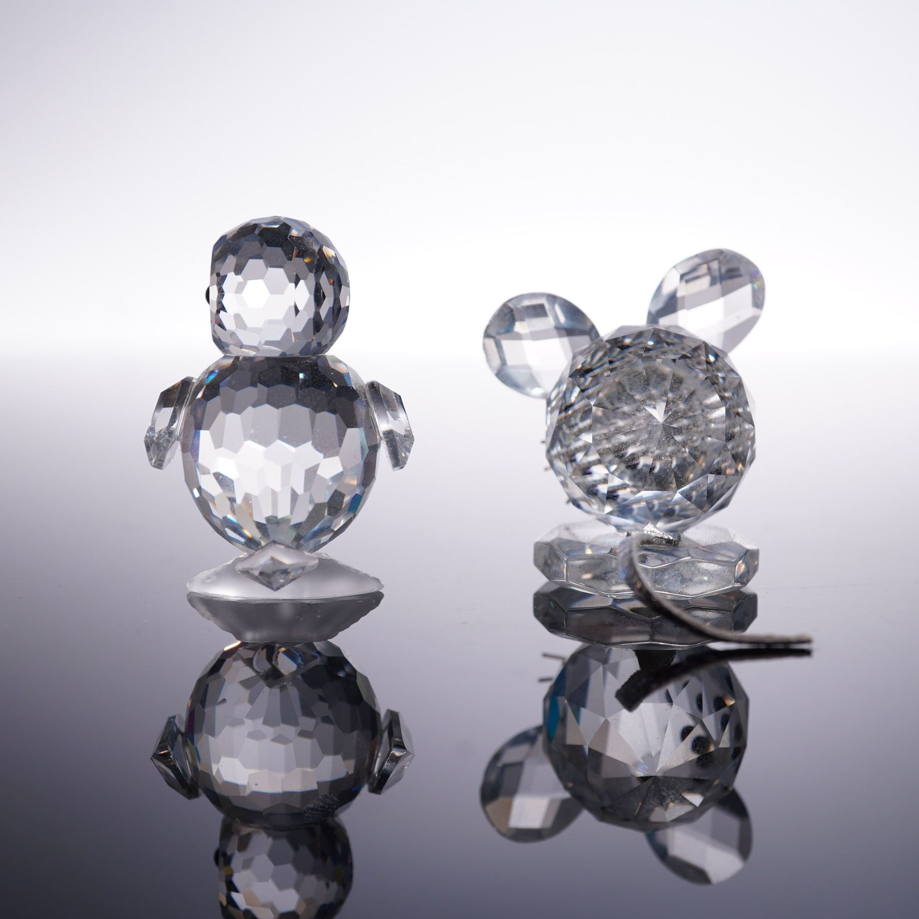 Charming Swarovski crystal figurine pair featuring a clear faceted duck with frosted base and a mouse with large ears and wire whiskers. Swarovski backstamp. Each figure measures approximately 1.25"H.