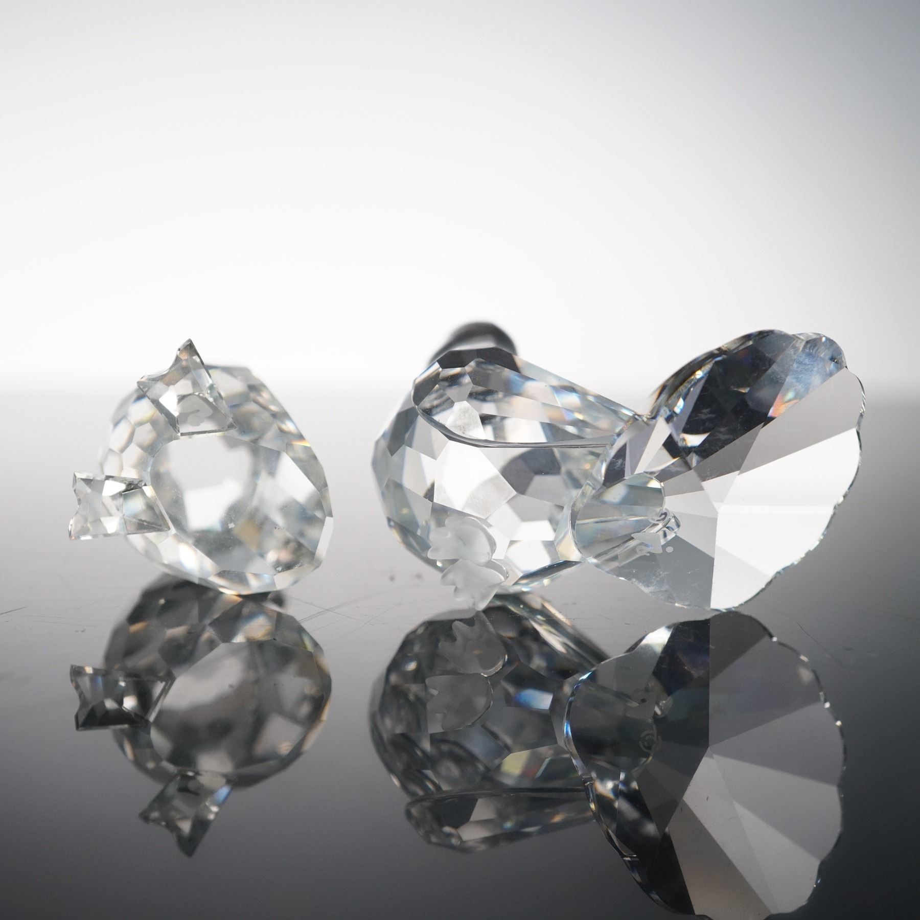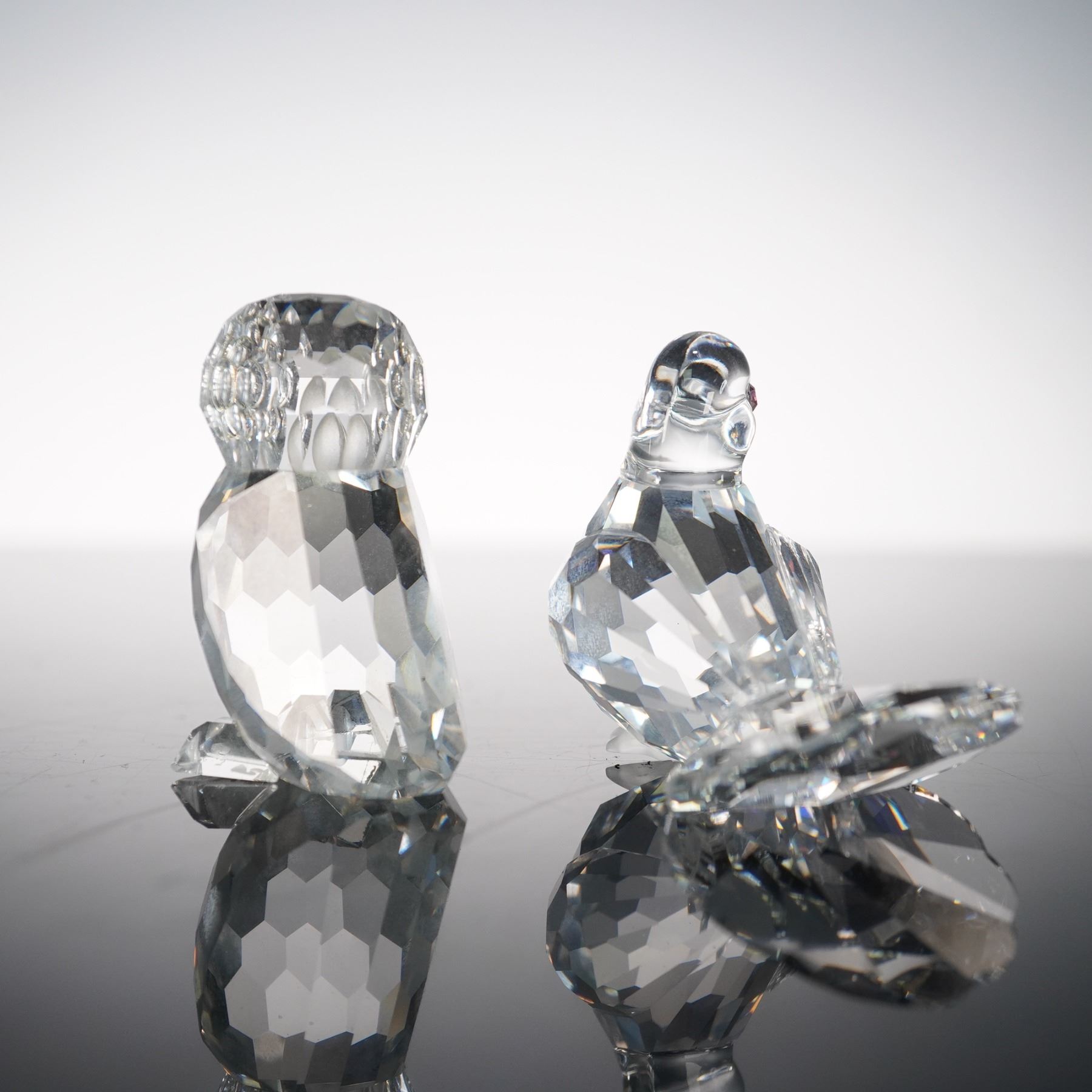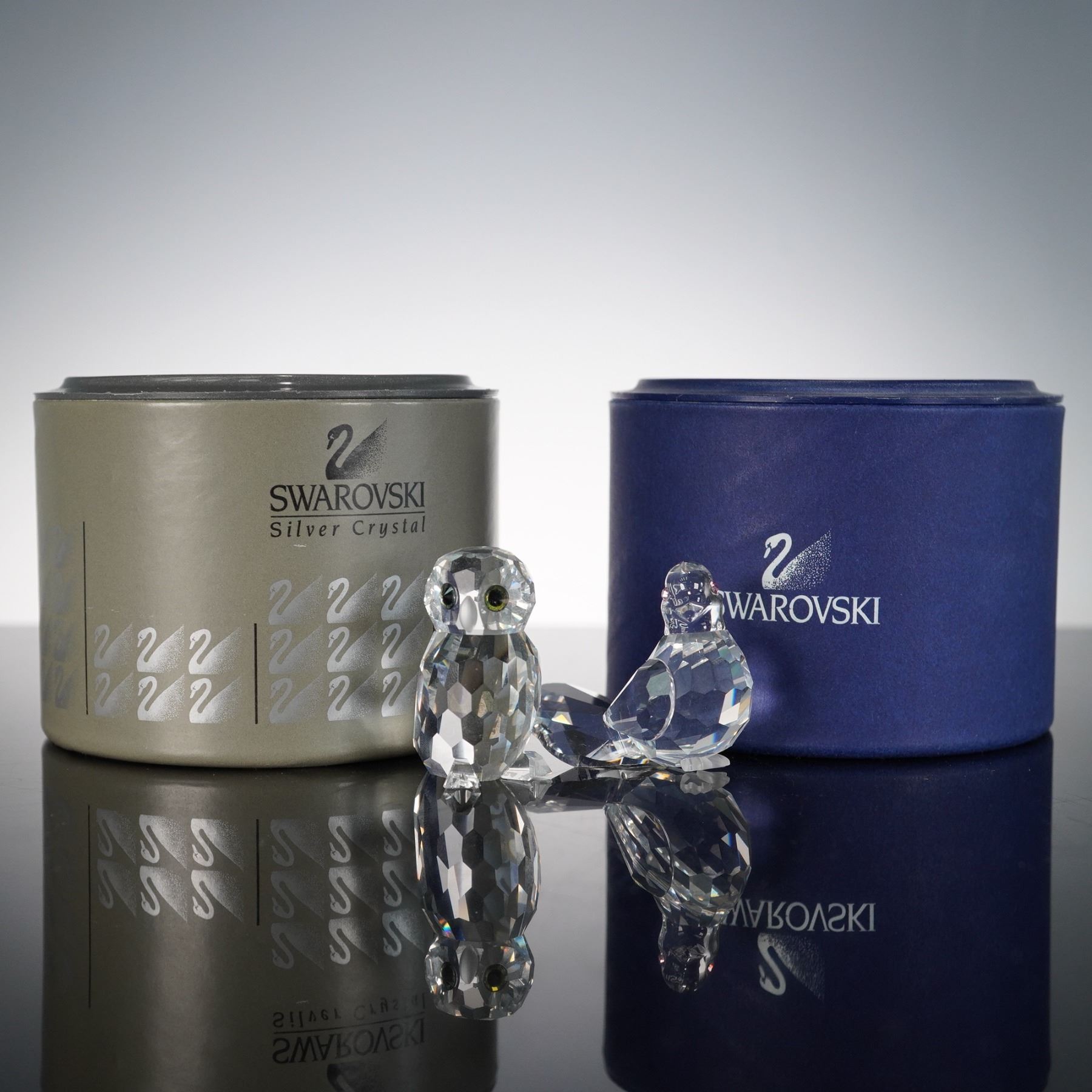 Swarovski crystal figurines including an Owlet designed by Anton Hirzinger and a Dove designed by Edith Mair. Both pieces feature precision-cut clear crystal bodies with faceted detail and colored crystal eyes that add lifelike character. Includes original Swarovski boxes as shown. 188386 & 191696.