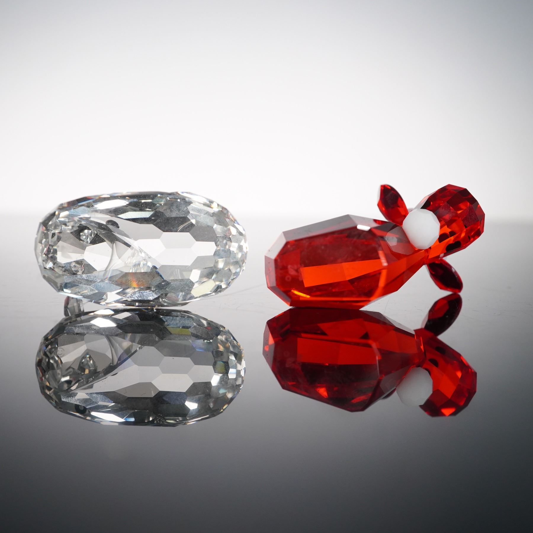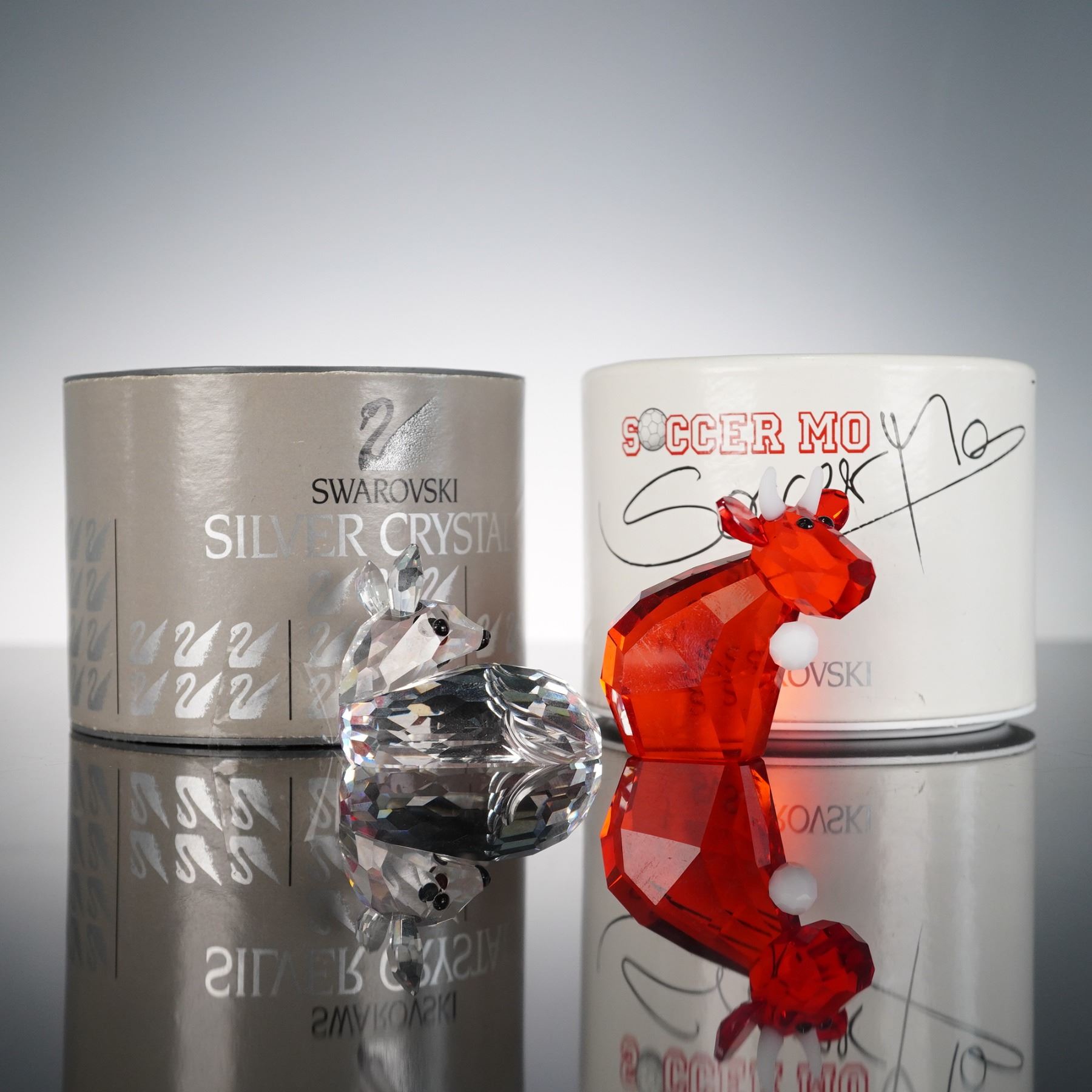 Roe Deer Fawn 183271, from the Swarovski Silver Crystal collection, in faceted clear crystal with black crystal eyes. Together with Soccer Mo 968798, from the Swarovski Lovlots collection, a faceted red crystal cow with white horns and soccer ball accent. Includes boxes. Swarovski backstamp.