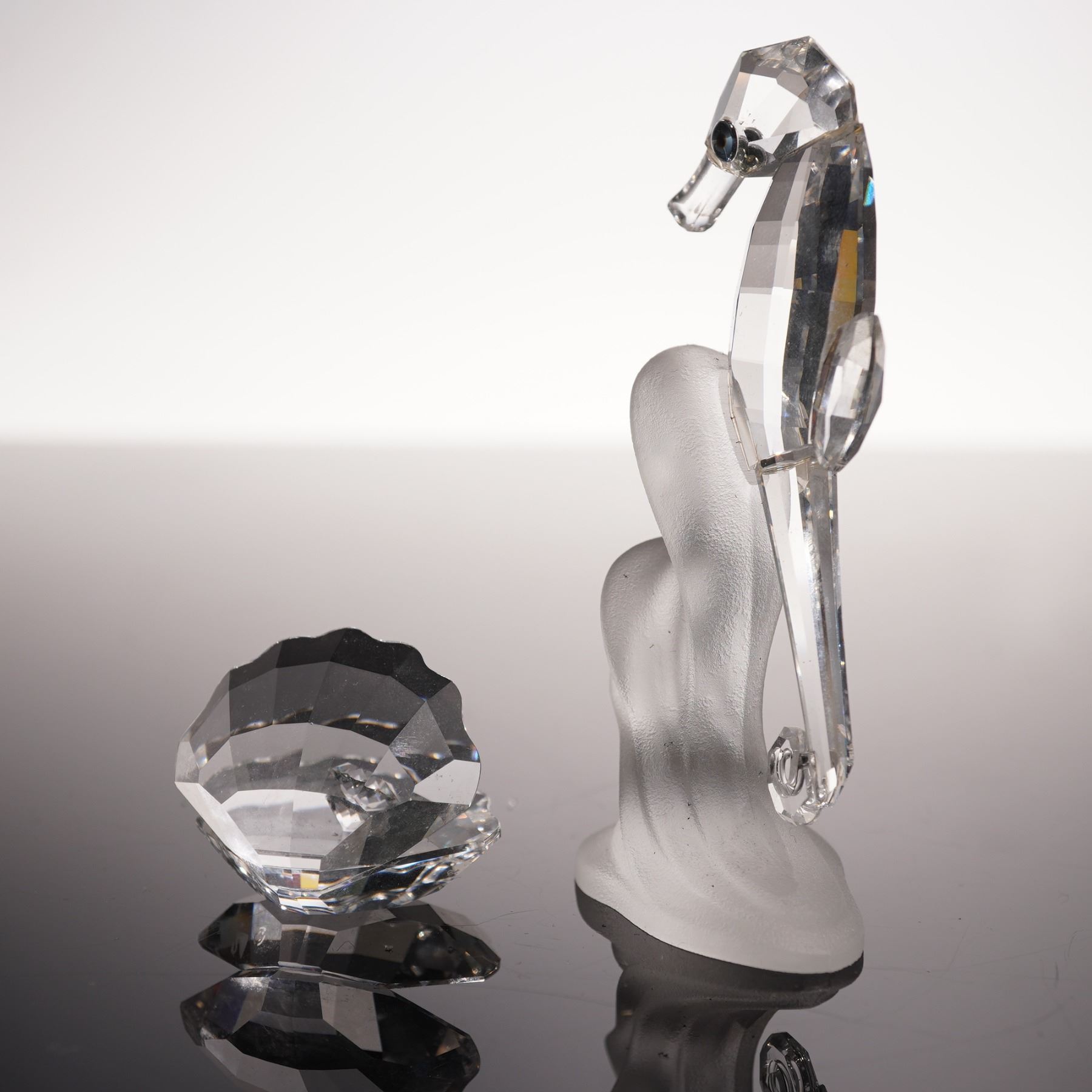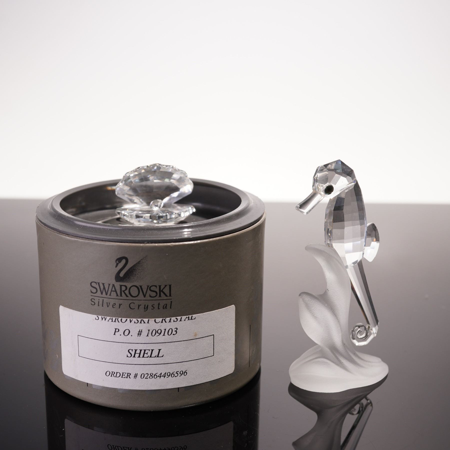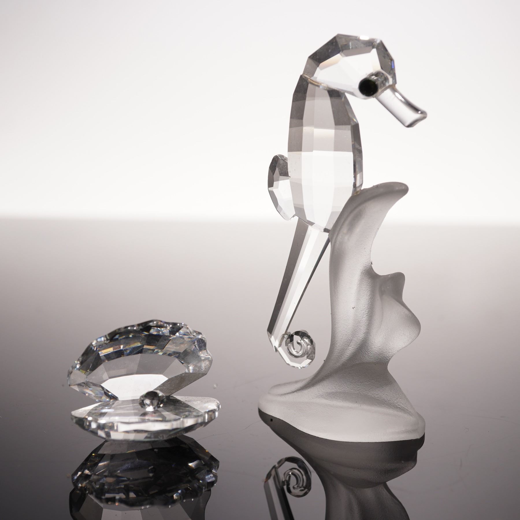 Set of two Swarovski crystal figurines designed by Michael Stamey, including a faceted crystal seashell with pearl and a graceful crystal seahorse mounted on a frosted crystal wave. The seahorse features expressive black crystal eyes and is signed by the designer on the base. Both pieces exhibit Swarovski's hallmark brilliance and detail. Seahorse includes the original fitted box. 191692, 168683.