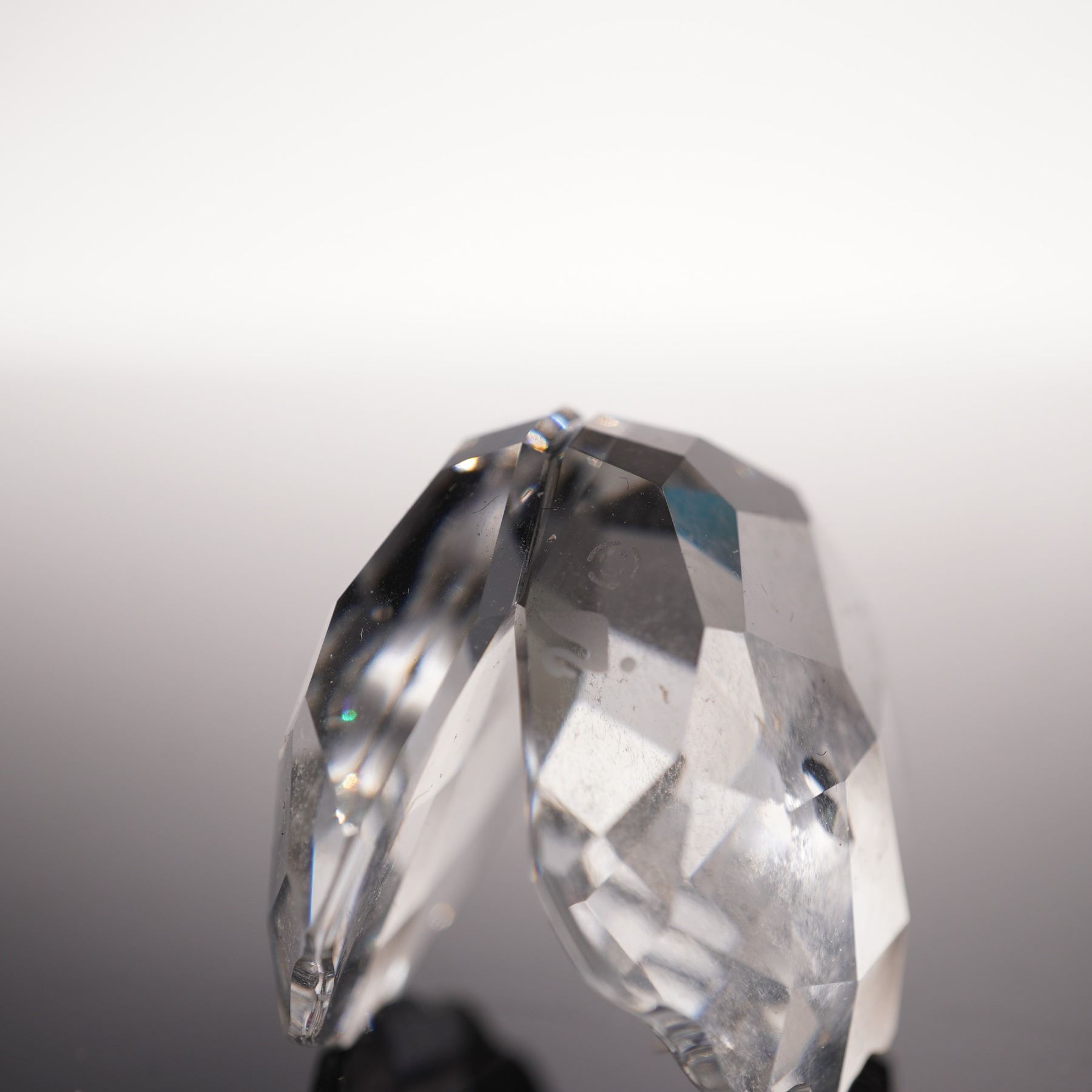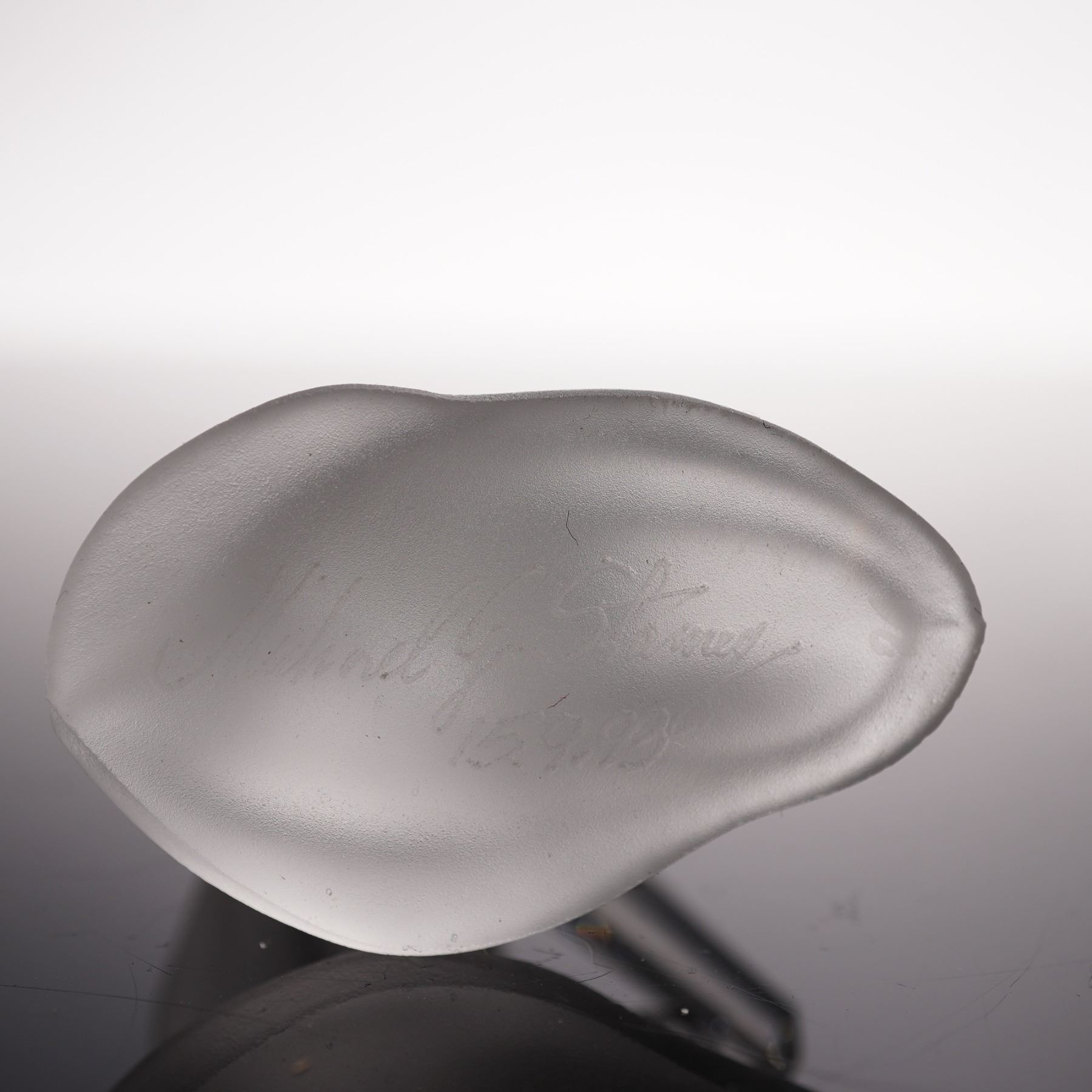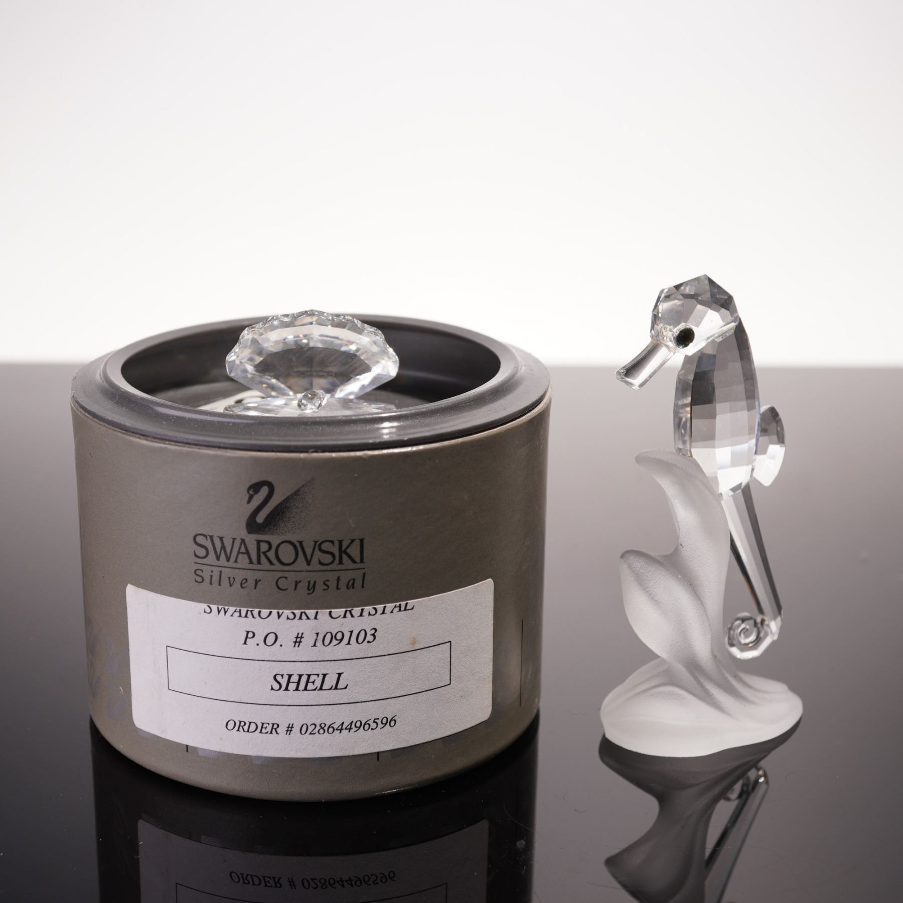 Set of two Swarovski crystal figurines designed by Michael Stamey, including a faceted crystal seashell with pearl and a graceful crystal seahorse mounted on a frosted crystal wave. The seahorse features expressive black crystal eyes and is signed by the designer on the base. Both pieces exhibit Swarovski's hallmark brilliance and detail. Seahorse includes the original fitted box. 191692, 168683.