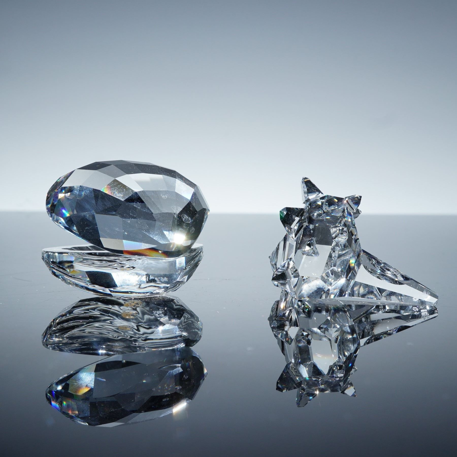 The South Sea Shell (160798) is finely crafted in faceted clear crystal with a detailed spiny shell design, signed and dated "Michael Stamey 1-24-94" on the base. The Large Shell with Pearl (5285131) features a hinged faceted crystal shell opening to reveal a luminous pearl accent inside, bearing the Swarovski swan backstamp. Together, these pieces showcase the brand's renowned precision cutting and brilliance, making them elegant additions to any crystal collection.