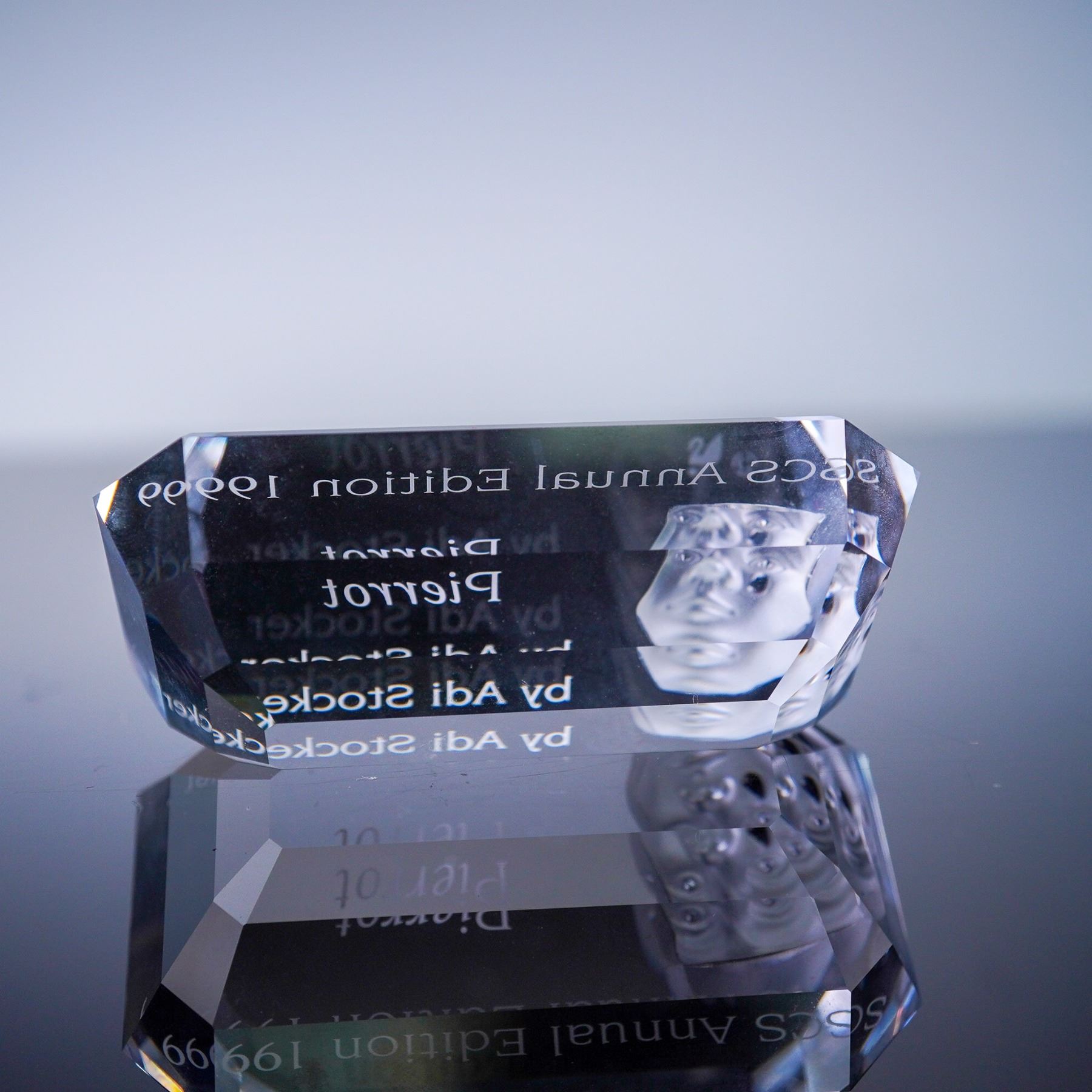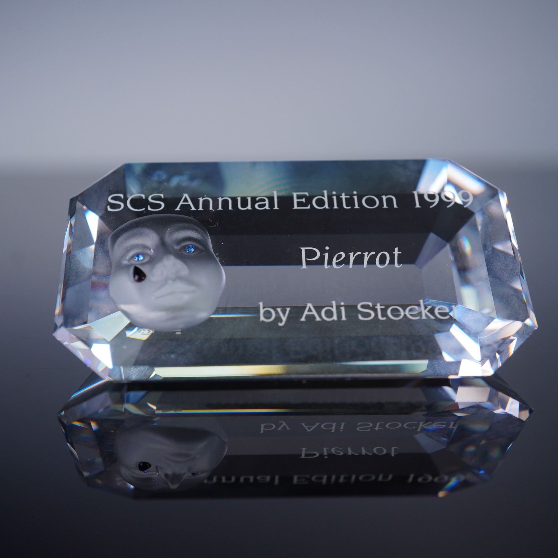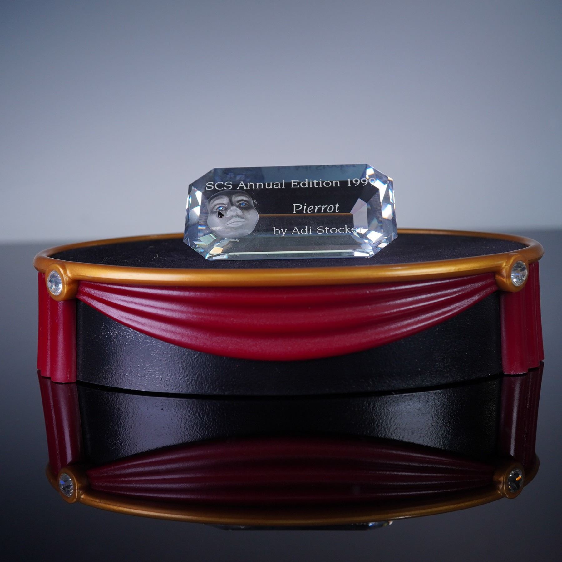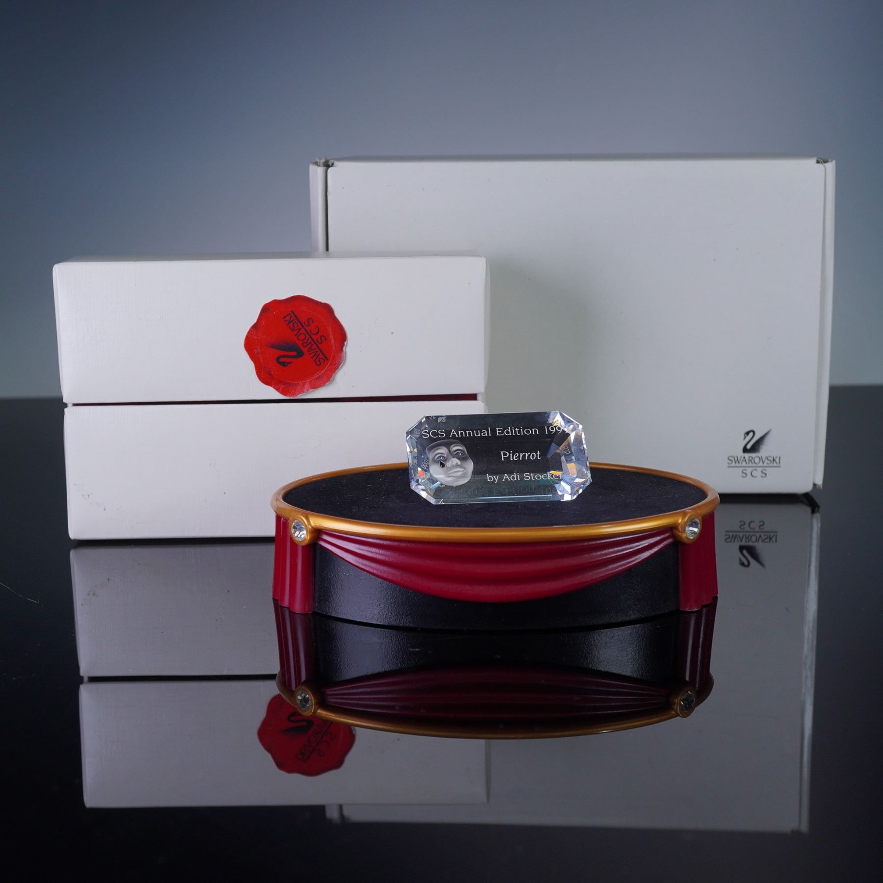 Collection includes the Masquerade SCS Annual Edition 1999, featuring a rectangular clear crystal plaque and decorative base. The plaque is etched with the frosted face of Pierrot on the left side and inscribed with the text: "SCS Annual Edition 1999, Pierrot, by Adi Stocker." The accompanying display stand is designed to resemble a theatrical stage with sculpted red curtains and a gold trim, adorned with two clear crystal accents. The stand is intended for use with the Pierrot figurine and serves as a presentation base for the plaque. Original boxes included. Plaque: 2.25"L x 1"W x 1"H. Stand: 5.5"L x 3.5"W x 1.25"H.