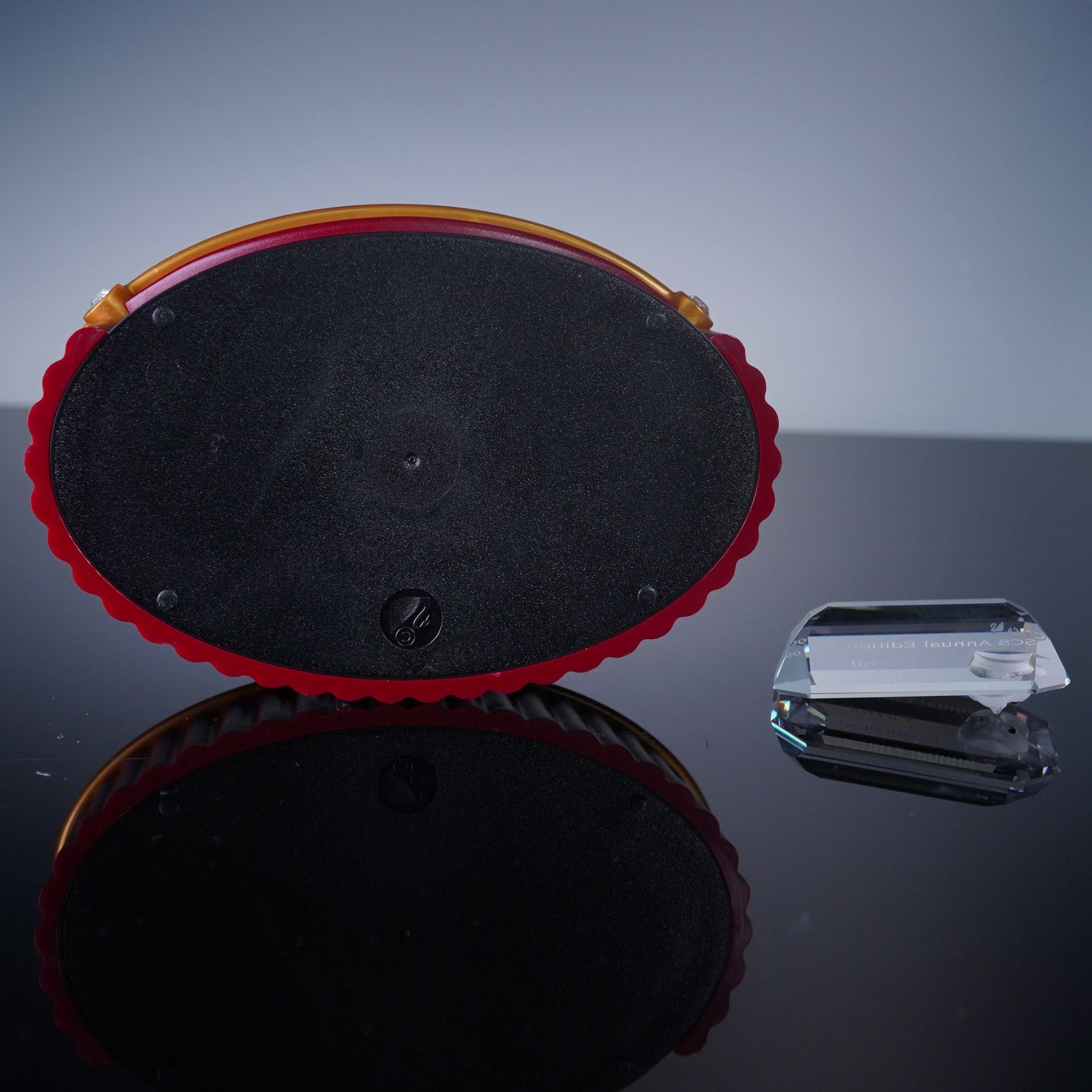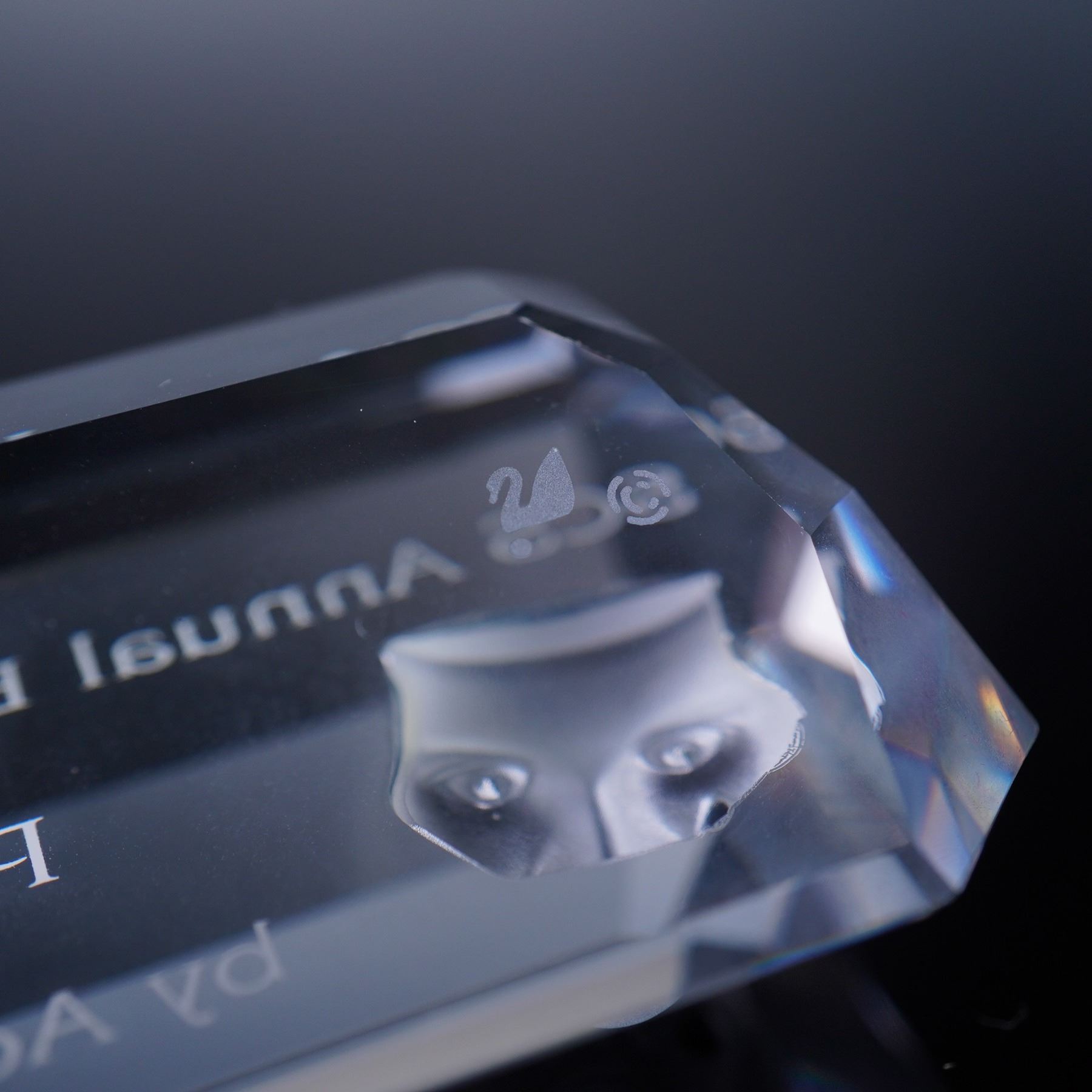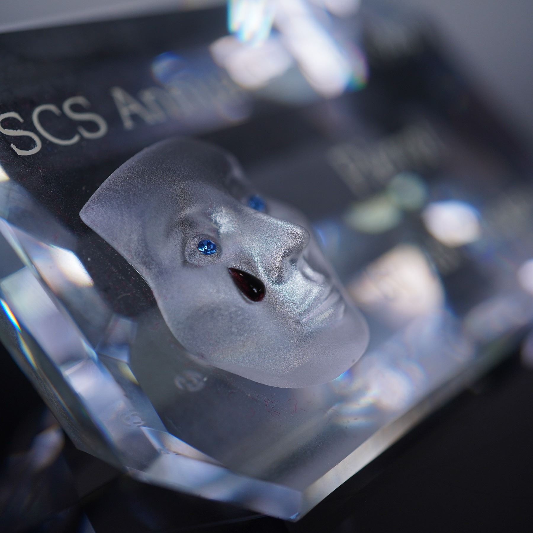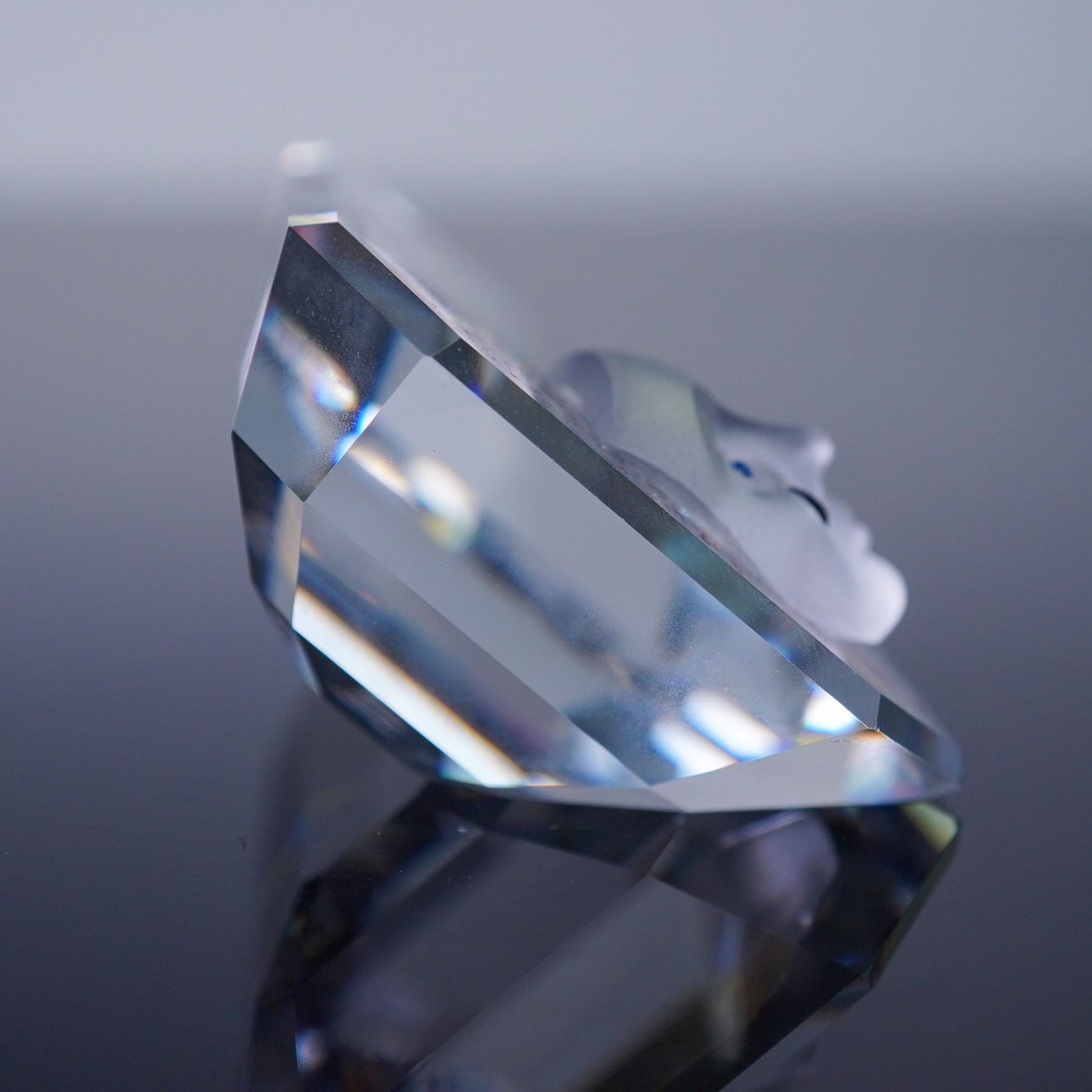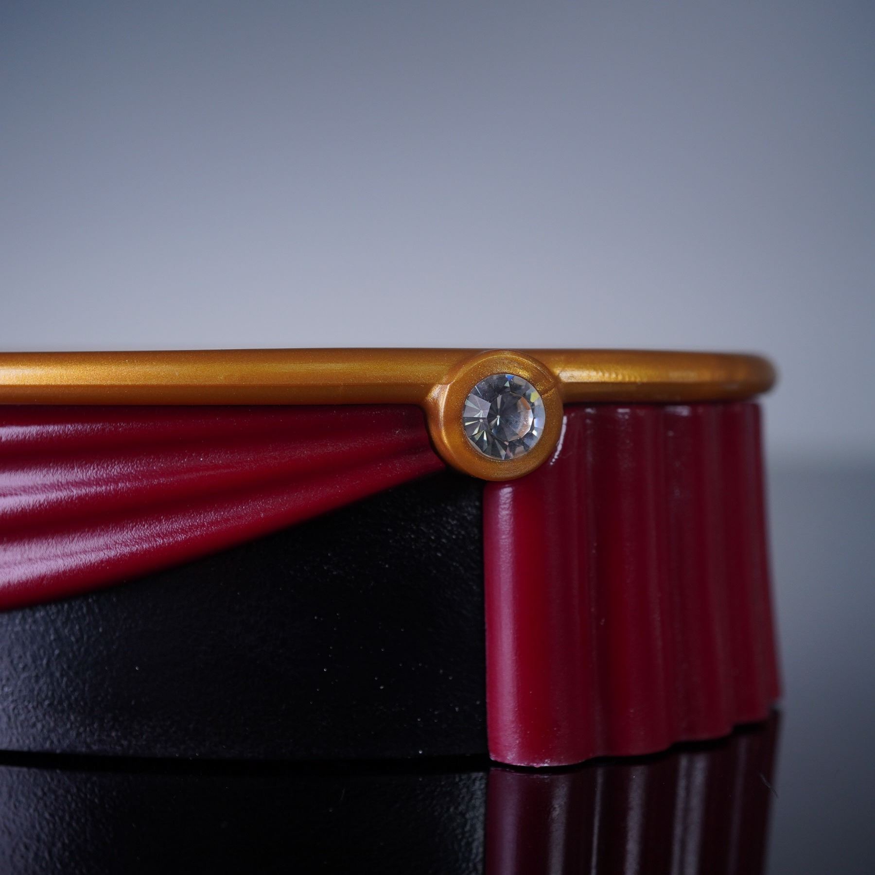 Collection includes the Masquerade SCS Annual Edition 1999, featuring a rectangular clear crystal plaque and decorative base. The plaque is etched with the frosted face of Pierrot on the left side and inscribed with the text: "SCS Annual Edition 1999, Pierrot, by Adi Stocker." The accompanying display stand is designed to resemble a theatrical stage with sculpted red curtains and a gold trim, adorned with two clear crystal accents. The stand is intended for use with the Pierrot figurine and serves as a presentation base for the plaque. Original boxes included. Plaque: 2.25"L x 1"W x 1"H. Stand: 5.5"L x 3.5"W x 1.25"H.