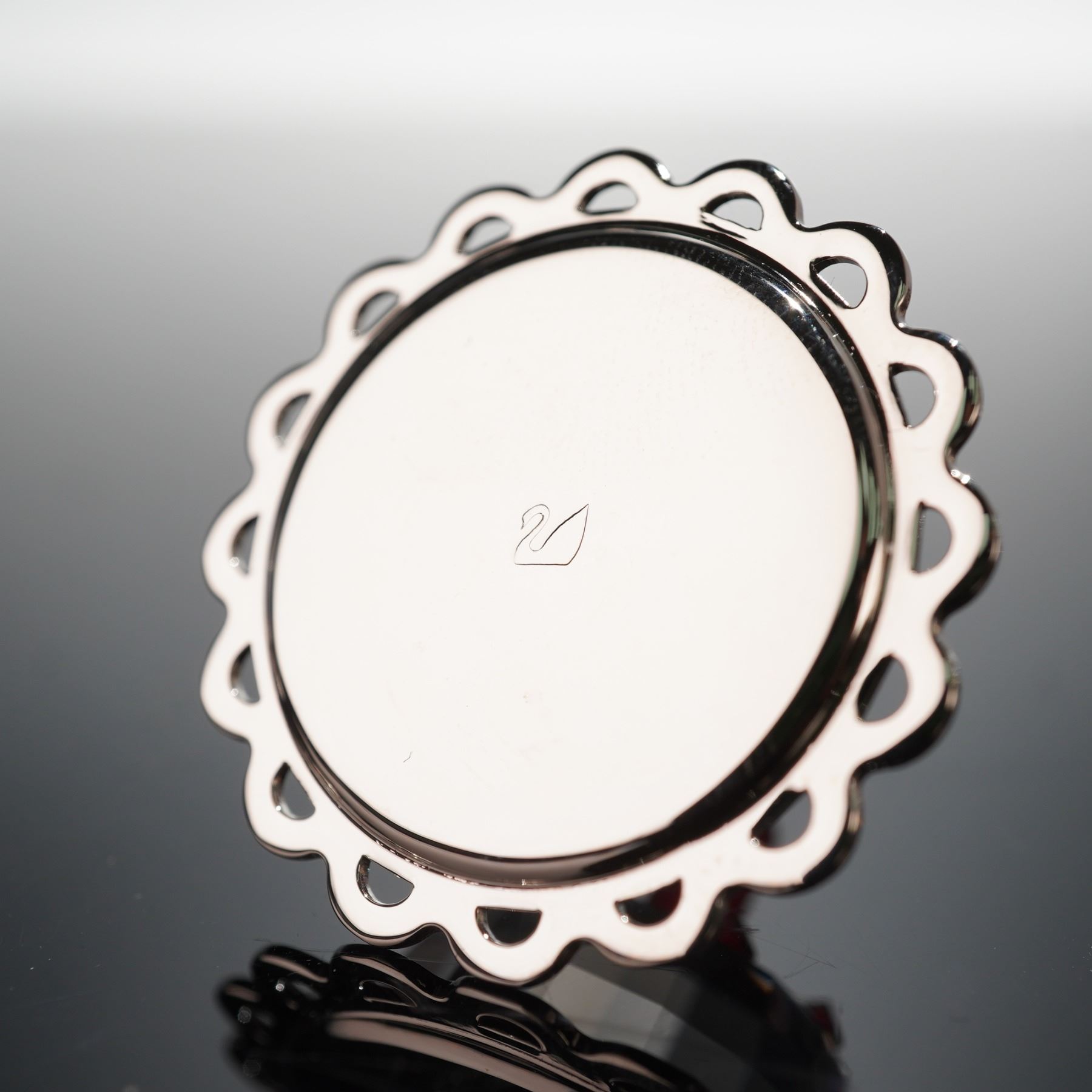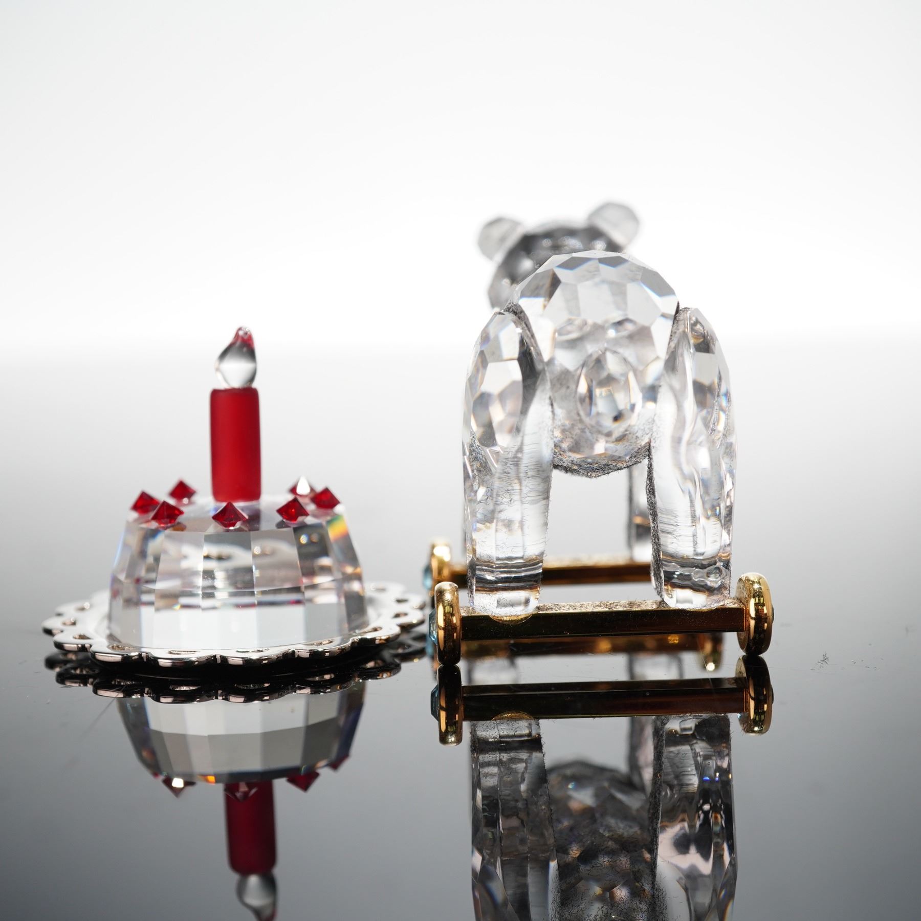 Two masterfully crafted crystal figurines including Happy Birthday Cake 296555 designed using clear and red crystal, then set atop a rhodium metal base. Also included is Teddy Bear on Wheels 253447 made of clear crystal with gold plated accents and moveable wheels. Swarovski backstamp. One item has its original box.