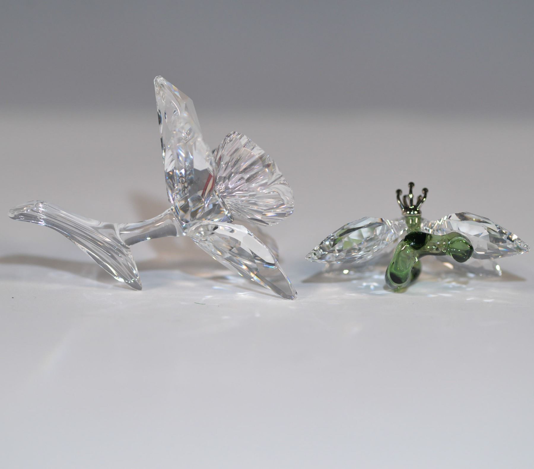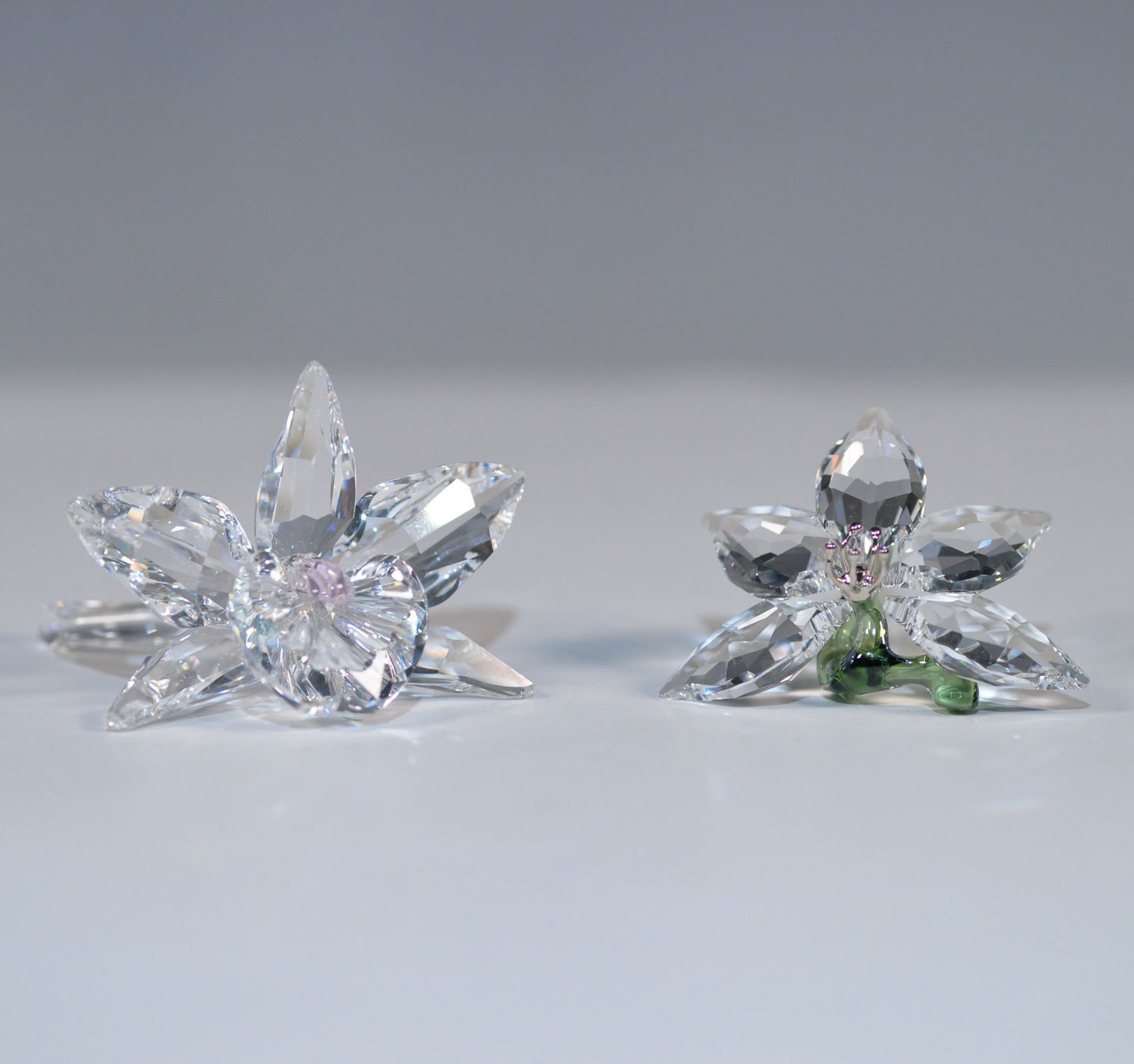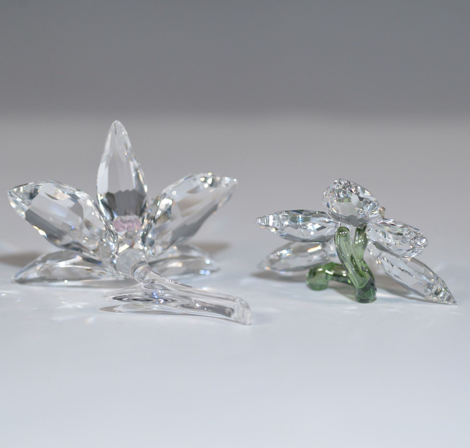 Exquisite Swarovski crystal figurine set featuring a delicate orchid with pink center (3") and orchid flower with green stem (1.5"). The orchid is intricately crafted with faceted clear crystal petals and a soft pink center, capturing the elegance of nature. The orchid petals are clear with green crystal, is adorned with a metal crown, adding a whimsical touch. Both pieces showcase Swarovski's renowned brilliance and precision craftsmanship, making this a delightful addition to any collection. Orchid with pink center comes with original box.