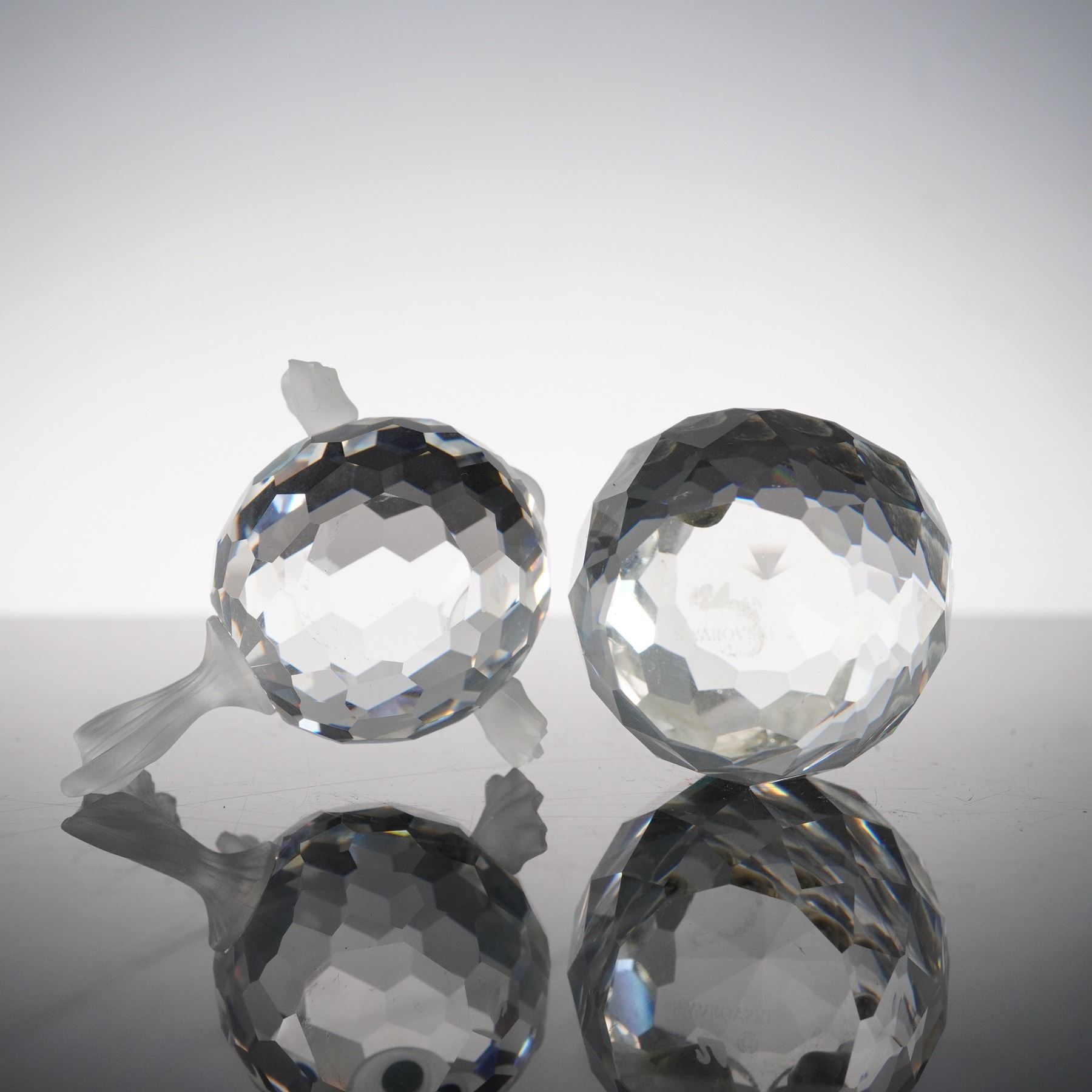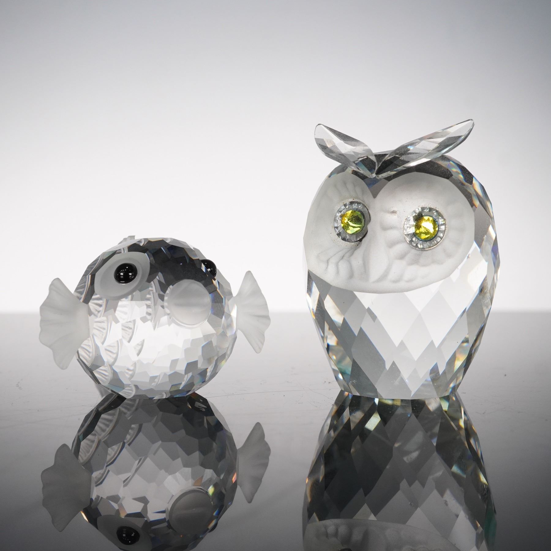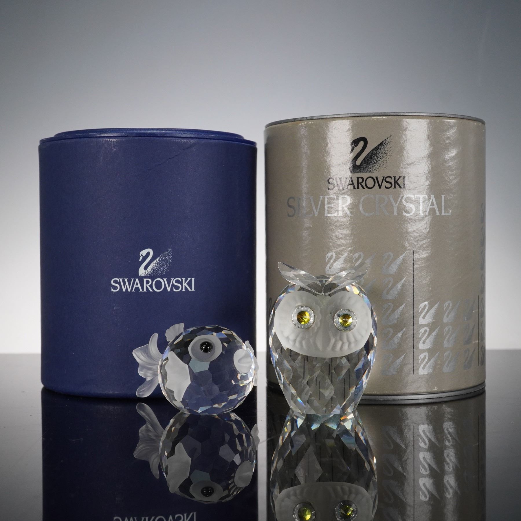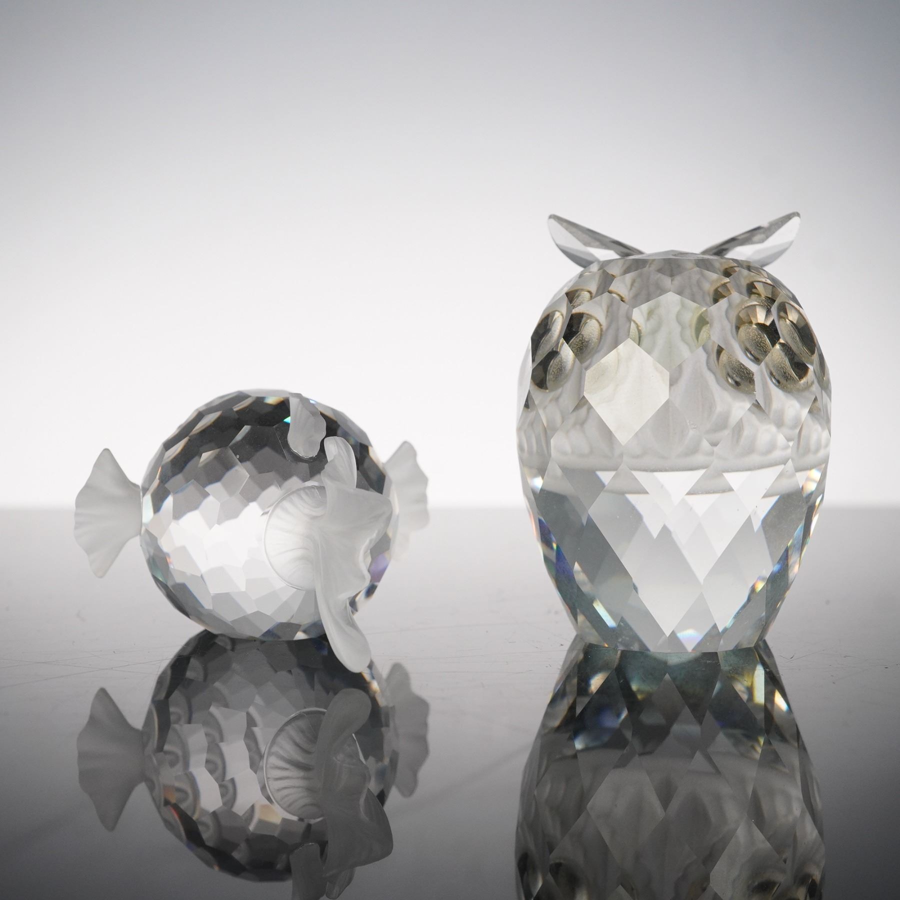 Two clear crystal figurines include Owl 010022 and Blowfish 012724. The owl was part of the Woodland Friends collection and is made of clear crystal body with a frosted face and beak. The blowfish was part of the South Sea theme group. The body of the blowfish consists of clear facetted crystal with frosted crystal used for the tail, fins, mouth. Swarovski backstamp. These item have its original boxes.
