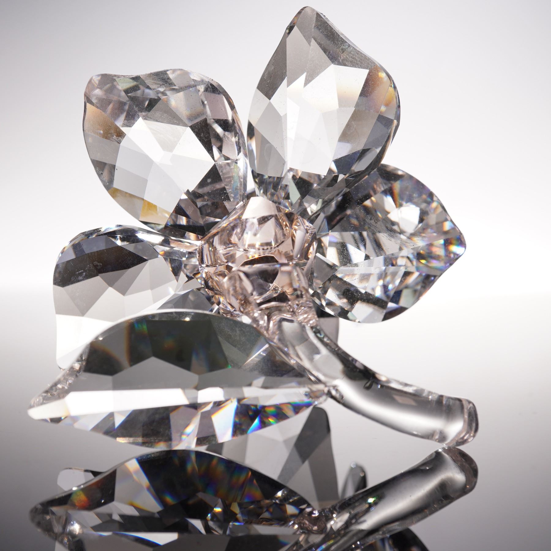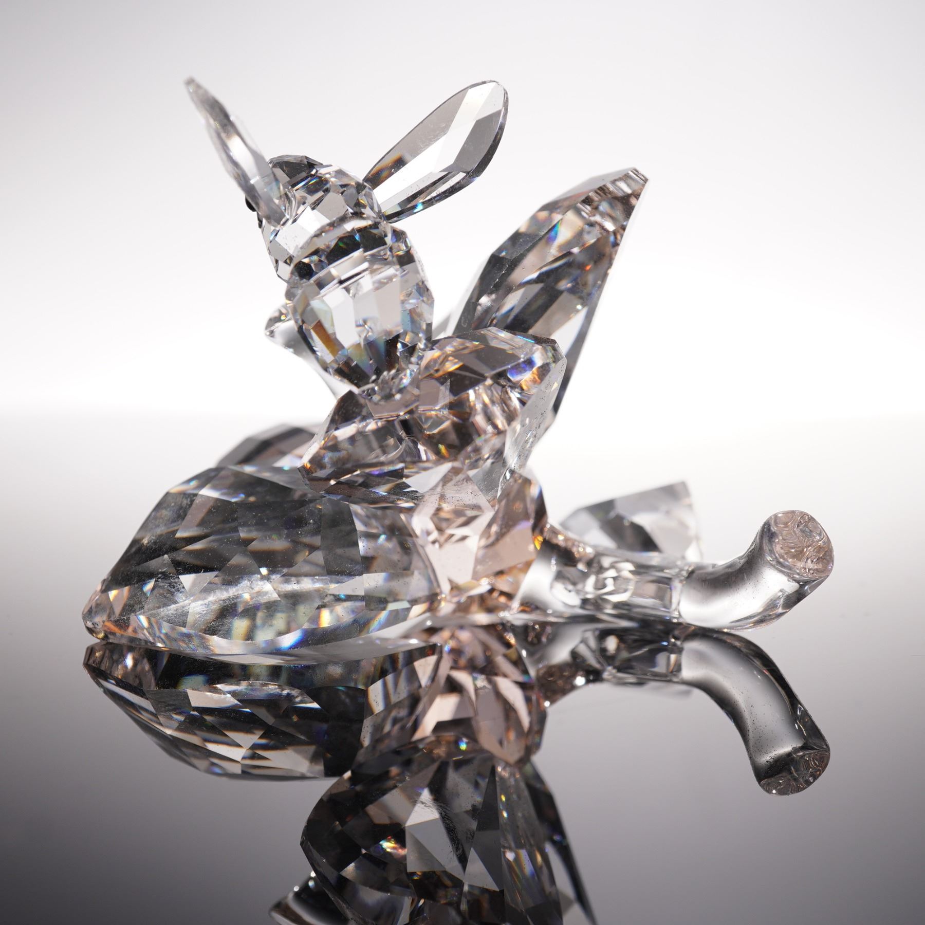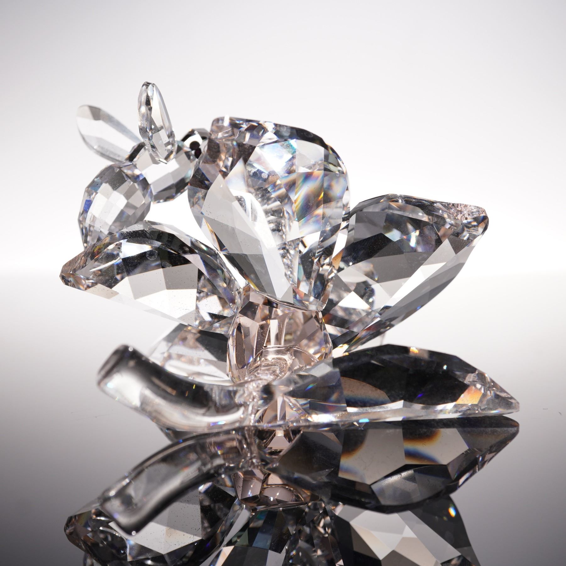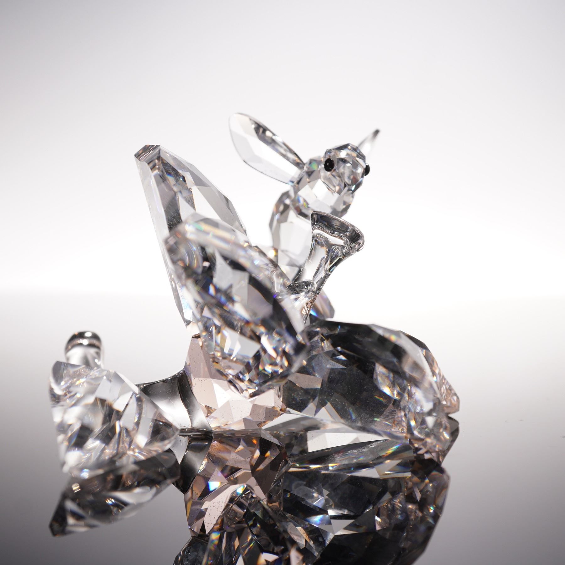 This elegant duo celebrates the 20th anniversary of the Swarovski Crystal Society, showcasing exquisite craftsmanship in precision-cut clear crystal. The Bee figurine rests delicately atop a faceted crystal flower, while the multifaceted crystal paperweight is engraved with "SCS 20 Years" and adorned with an etched image of the bee and flower motif. Both pieces display the Swarovski swan logo and signature etching. A remarkable collectible set symbolizing two decades of artistry and excellence in crystal design. The model number is 871895.