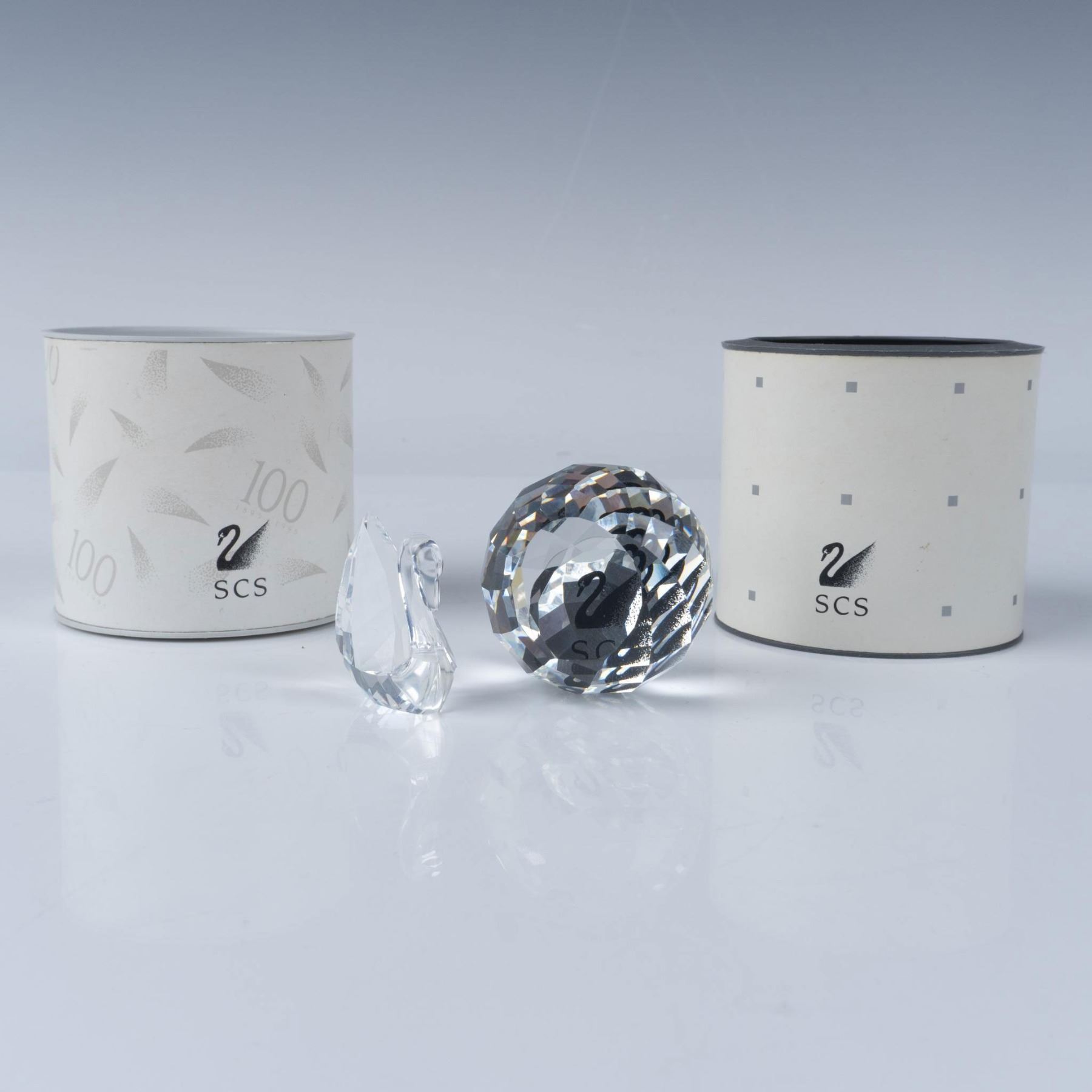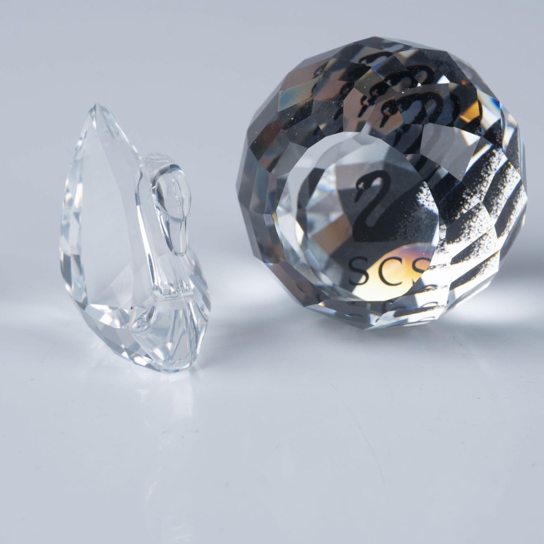 This lot includes two collectible Swarovski crystal pieces, both part of the Swarovski Crystal Society (SCS) collection: Swarovski Crystal Swan Figurine: The swan, an iconic Swarovski symbol, features precision-cut crystal with a highly faceted body and gracefully curved neck. It sits atop its original cylindrical box, which is marked with the Swarovski logo and "100" insignia, commemorating a significant anniversary or edition. Swarovski Crystal Paperweight: A multi-faceted, round-cut crystal paperweight with exceptional brilliance, housed in its original cylindrical packaging. The Swarovski swan logo is etched into the crystal, showcasing the brand's craftsmanship and attention to detail. Both items are accompanied by their respective SCS-branded packaging, which enhances their presentation and collectability. Swarovski's SCS editions are particularly sought after due to their limited releases and high quality. Dimensions: 1.5"W x 1.5"H