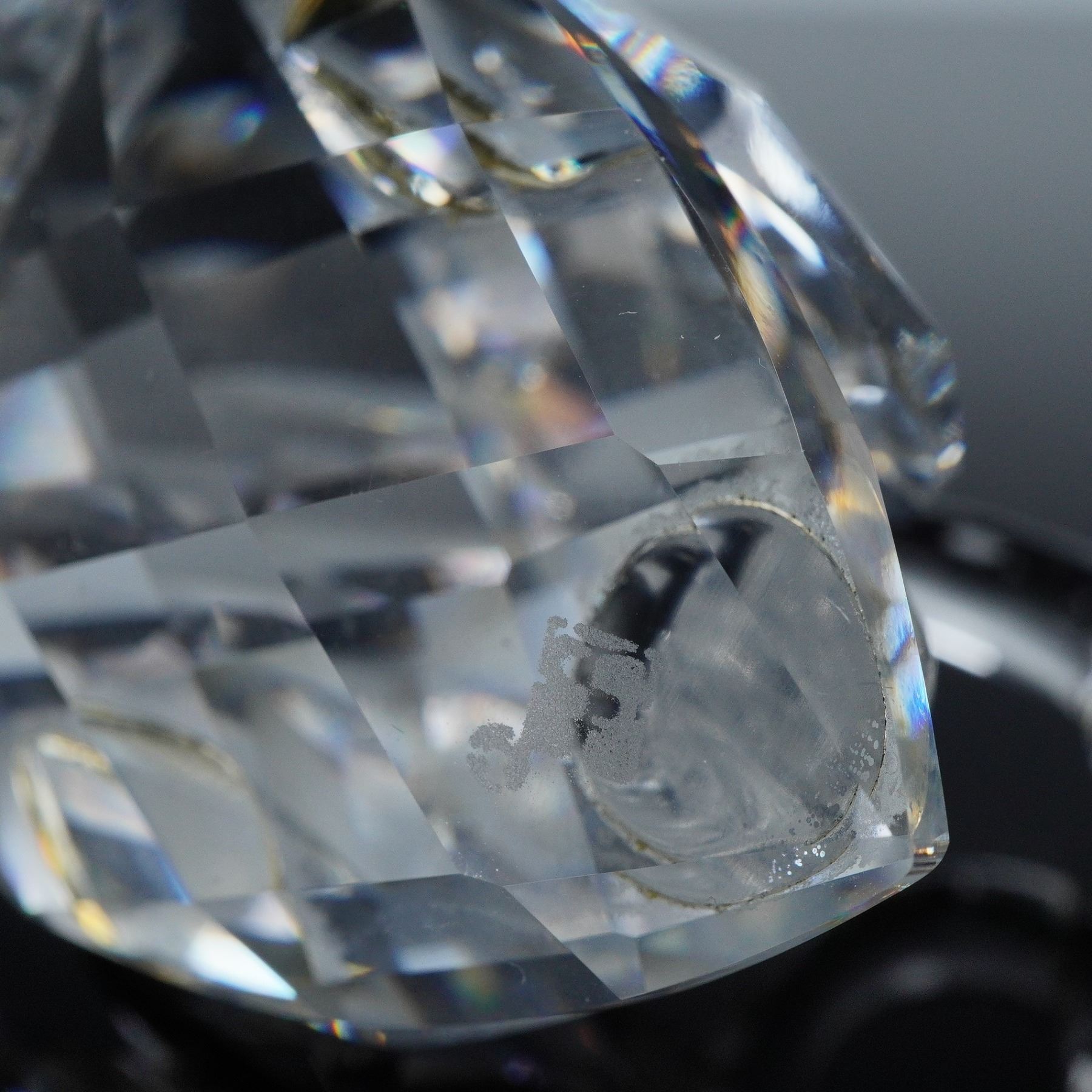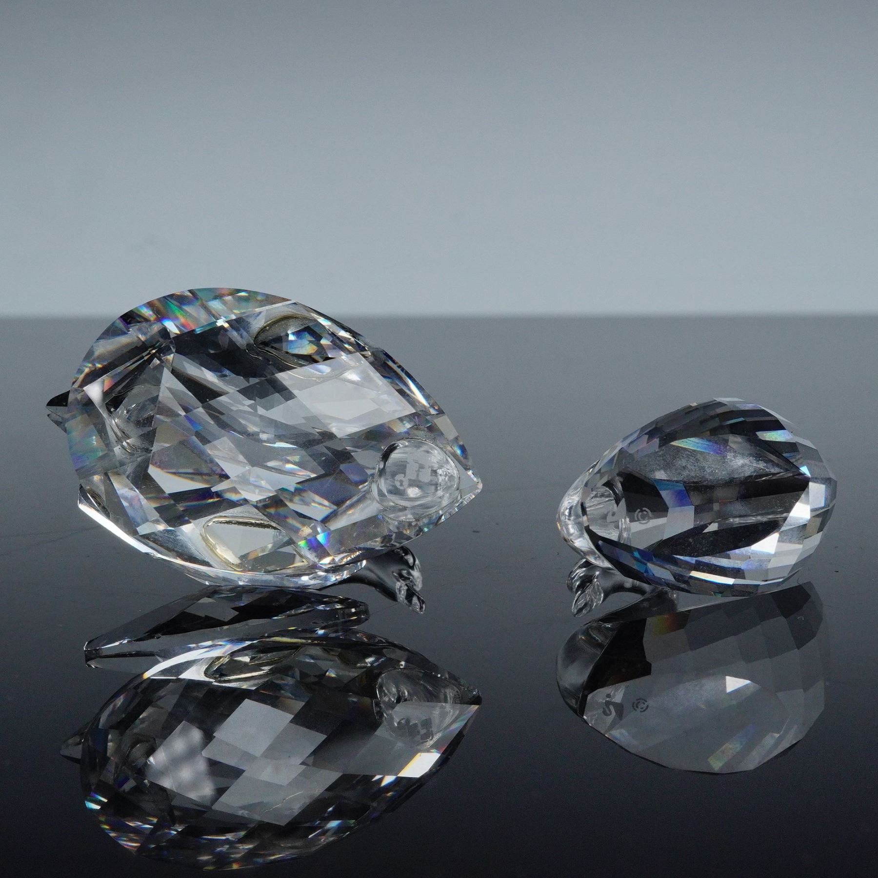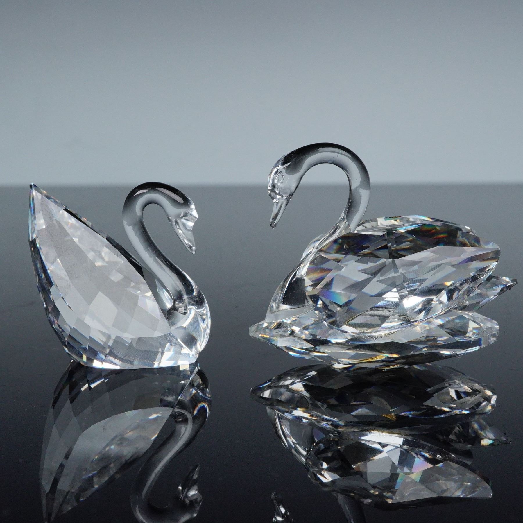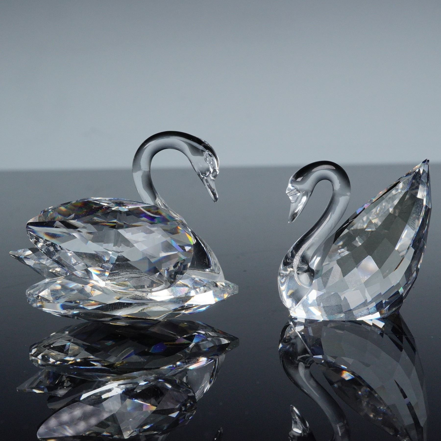A stunning pair of Swarovski Silver Crystal swans, designed by Anton Hirzinger and Max Schreck, representing elegance and serenity in sparkling form. Each swan is crafted from precision-cut clear crystal with graceful curves and a polished surface that reflects light in a mesmerizing spectrum. The set features one swan with a sleek, elongated neck and the other slightly smaller, creating a balanced and harmonious display when paired together. Both figurines showcase Swarovski's signature artistry and attention to natural detail, with faceted bodies that mimic the gentle movement of water ripples beneath their forms. Each piece bears the etched Swarovski swan logo for authenticity and comes housed in its original presentation box with deep blue velvet interior. A timeless addition to any Swarovski collection, symbolizing beauty, peace, and refinement. 010006.