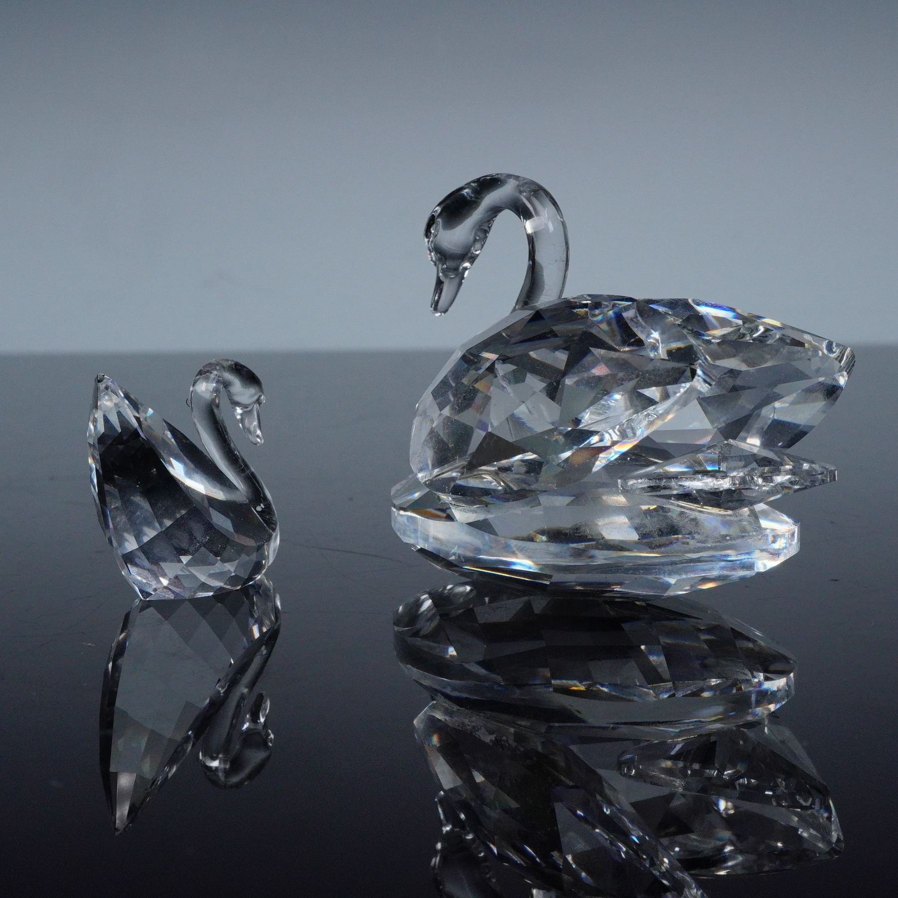 This elegant pair features two clear crystal swans, each beautifully faceted to reflect light with a dazzling brilliance. The larger swan rests gracefully with wings partially folded, while the smaller companion mirrors its elegant posture, creating a harmonious display of form and sparkle. Both pieces bear the Swarovski swan logo etched on the base, signifying their authenticity and craftsmanship. An exquisite example of Swarovski's artistry in precision-cut crystal design. The model numbers are 5215947 and 5400172. The small swan has its original box.