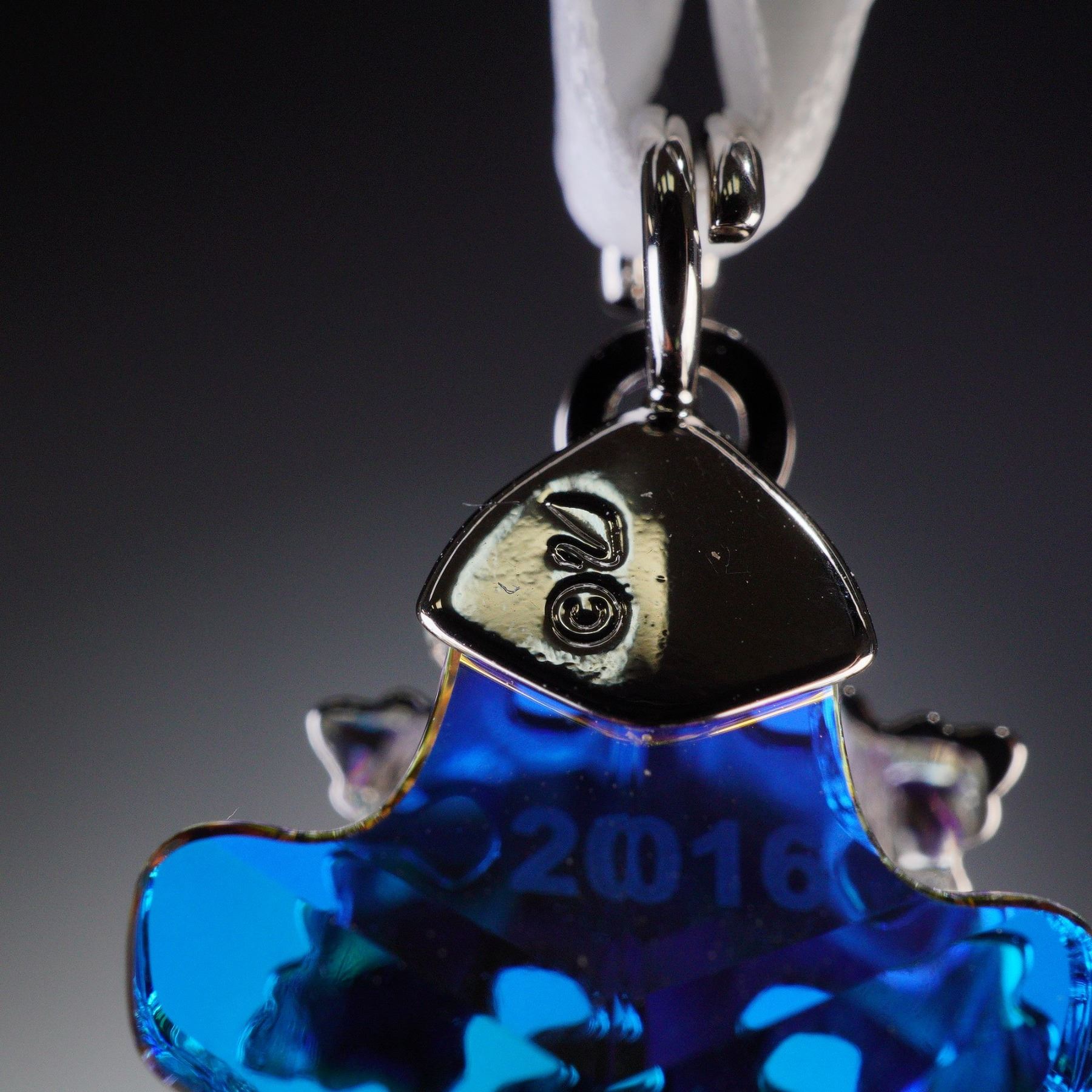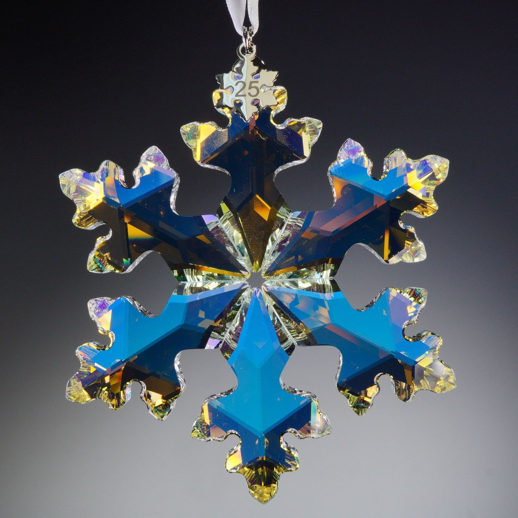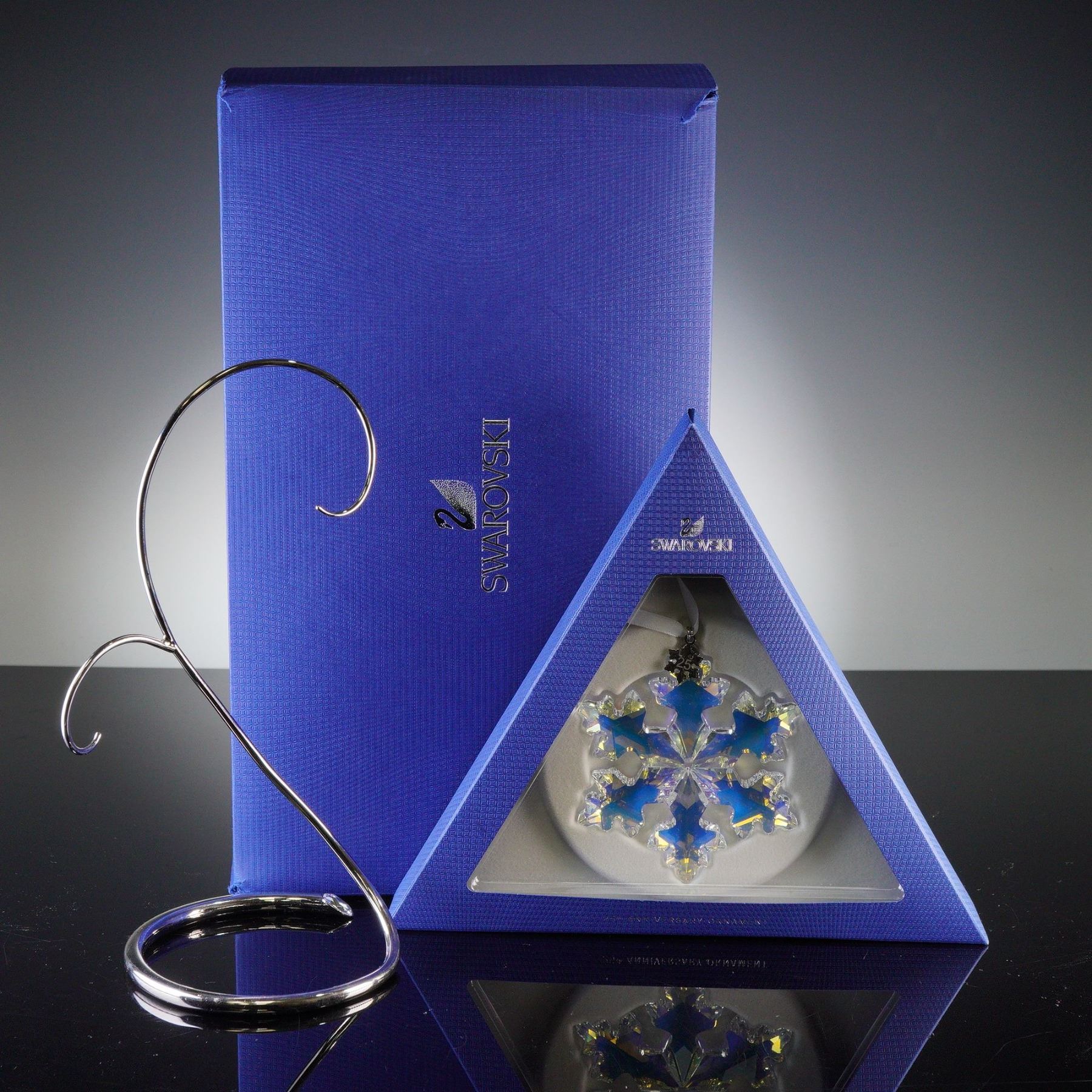 This Swarovski set includes the 2016 Annual Edition 25th Anniversary snowflake ornament and a polished metal display stand. The ornament features a radiant crystal snowflake in shimmering shades of blue and gold with a metal tag engraved 25 and the year 2016. It hangs from a white satin ribbon and comes in the signature blue triangular box. The sculptural stand offers an elegant way to showcase the piece year round. Swarovski backstamp. These items have their original box.