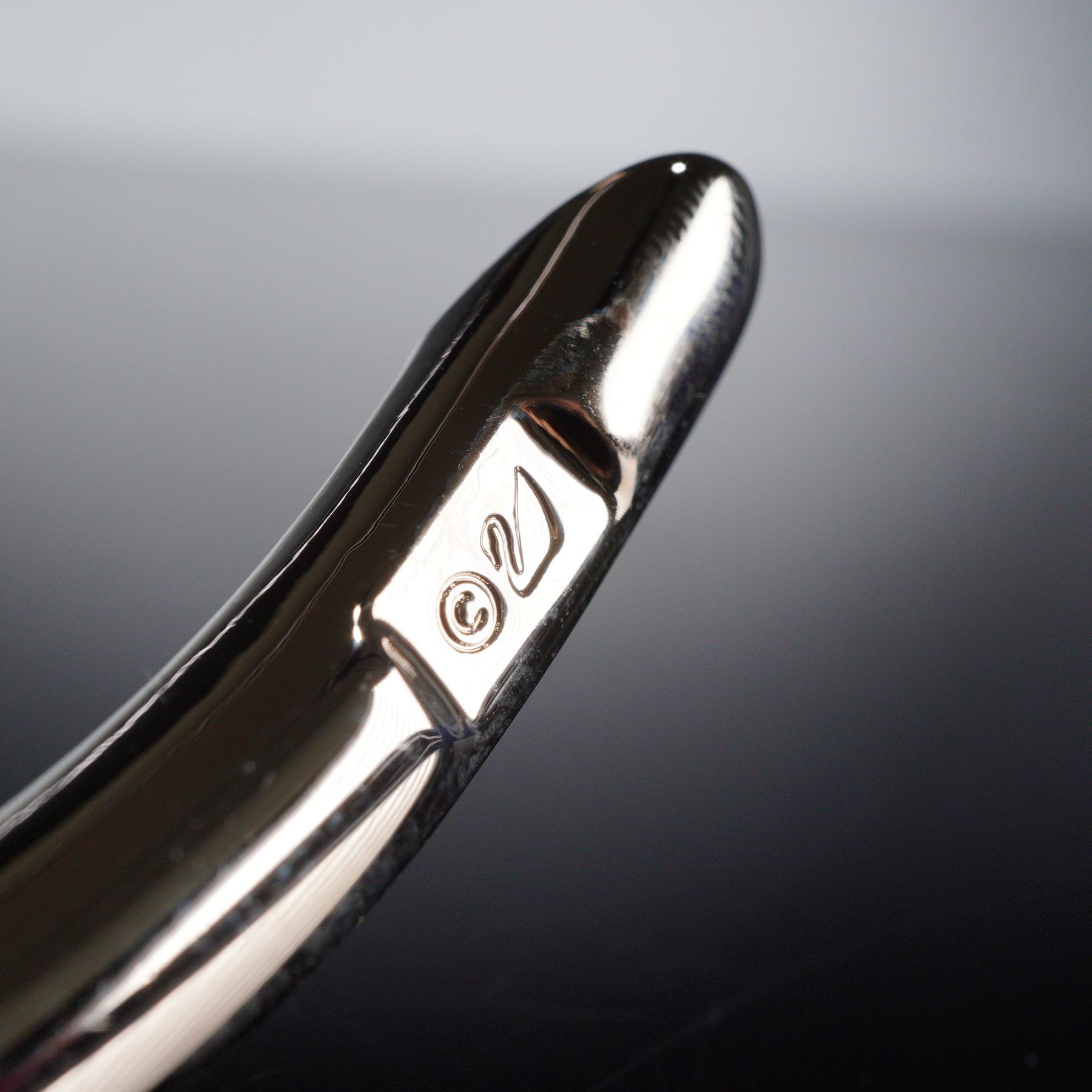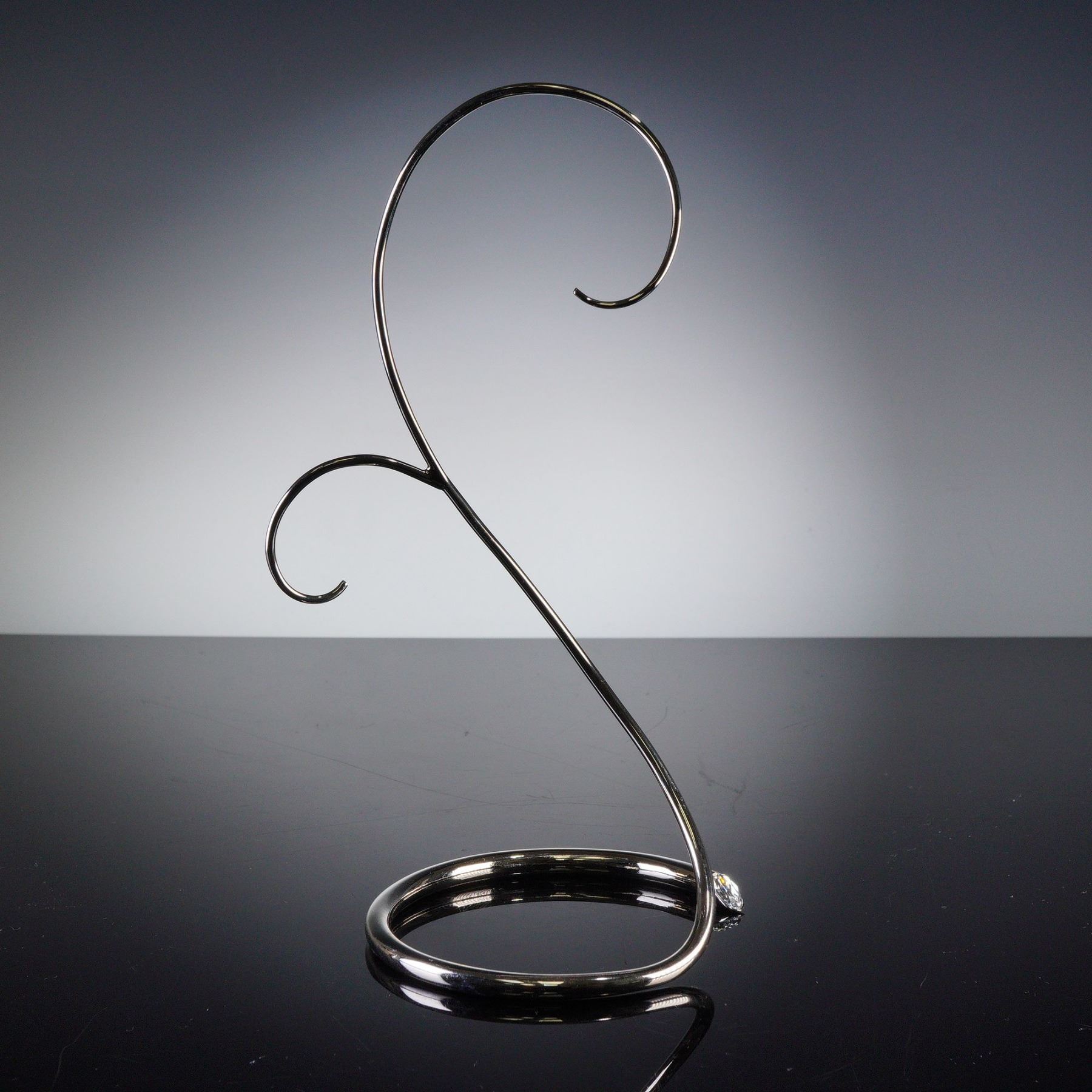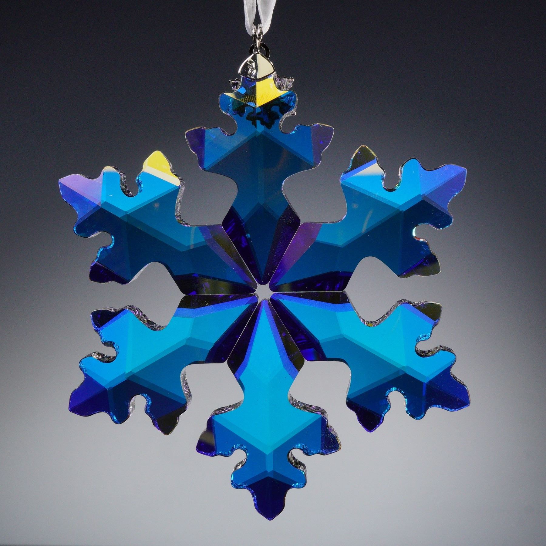 This Swarovski set includes the 2016 Annual Edition 25th Anniversary snowflake ornament and a polished metal display stand. The ornament features a radiant crystal snowflake in shimmering shades of blue and gold with a metal tag engraved 25 and the year 2016. It hangs from a white satin ribbon and comes in the signature blue triangular box. The sculptural stand offers an elegant way to showcase the piece year round. Swarovski backstamp. These items have their original box.
