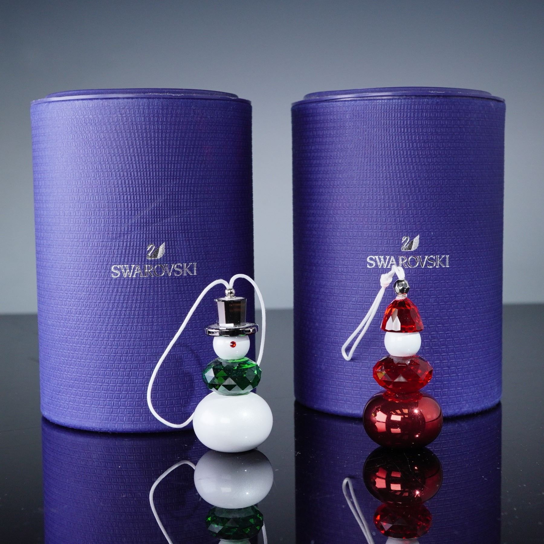 Swarovski crystal Christmas ornaments designed by Michele Blasilli, featuring Santa Claus and Snowman figures. Both are finely crafted in clear and colored crystal, accented with festive details that capture the holiday spirit. Each piece bears the Swarovski swan hallmark and comes with ribbon hangers for display and original boxes. 5596389 & 5596388.