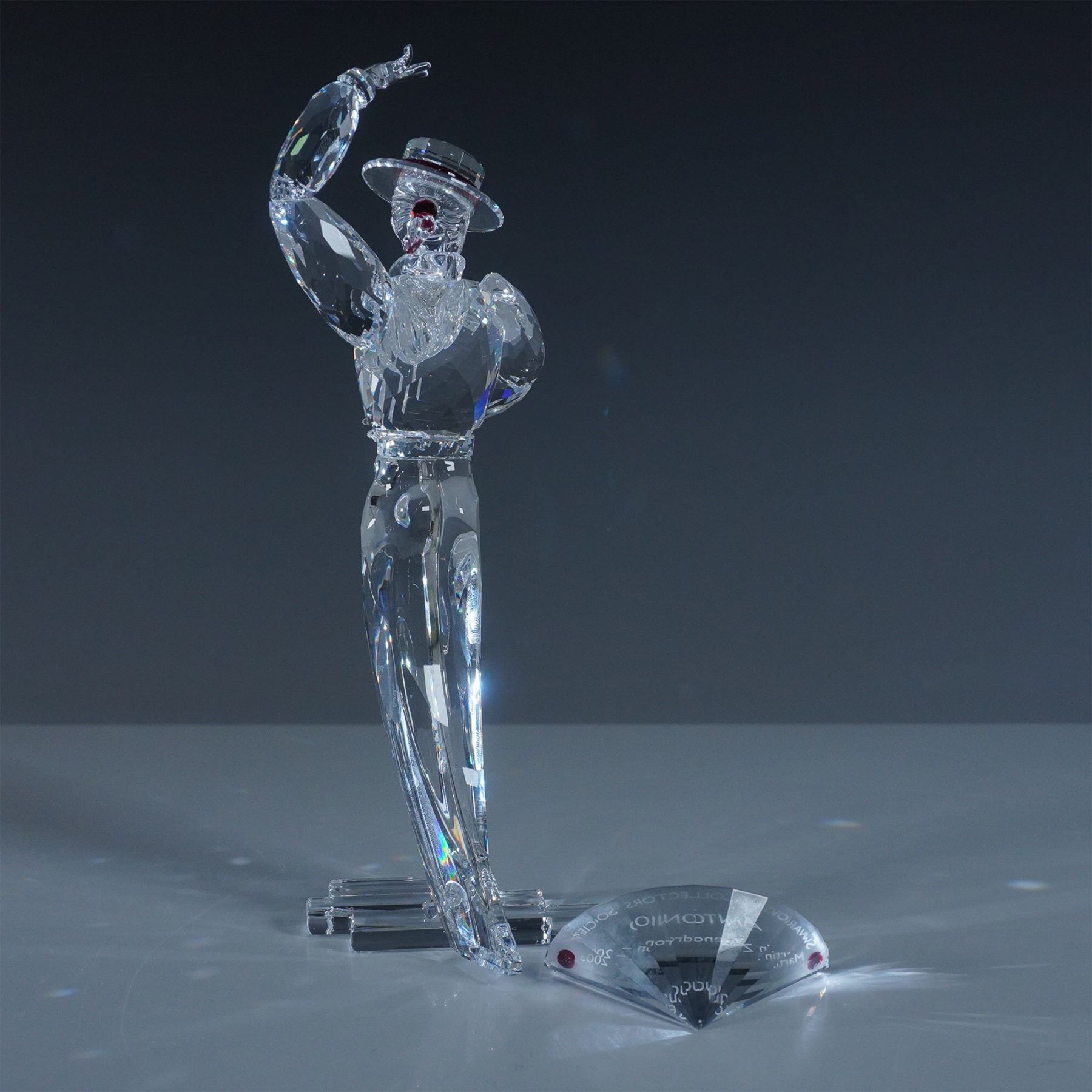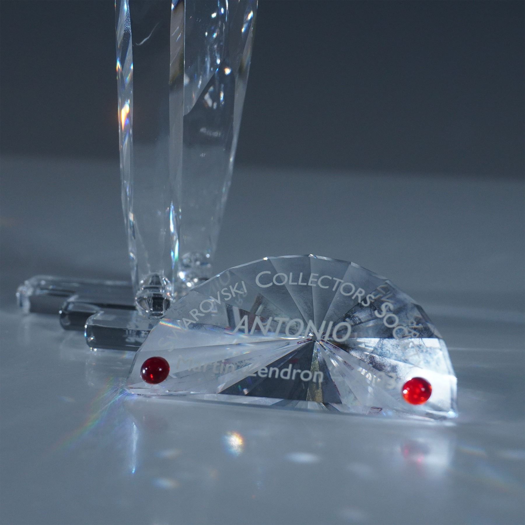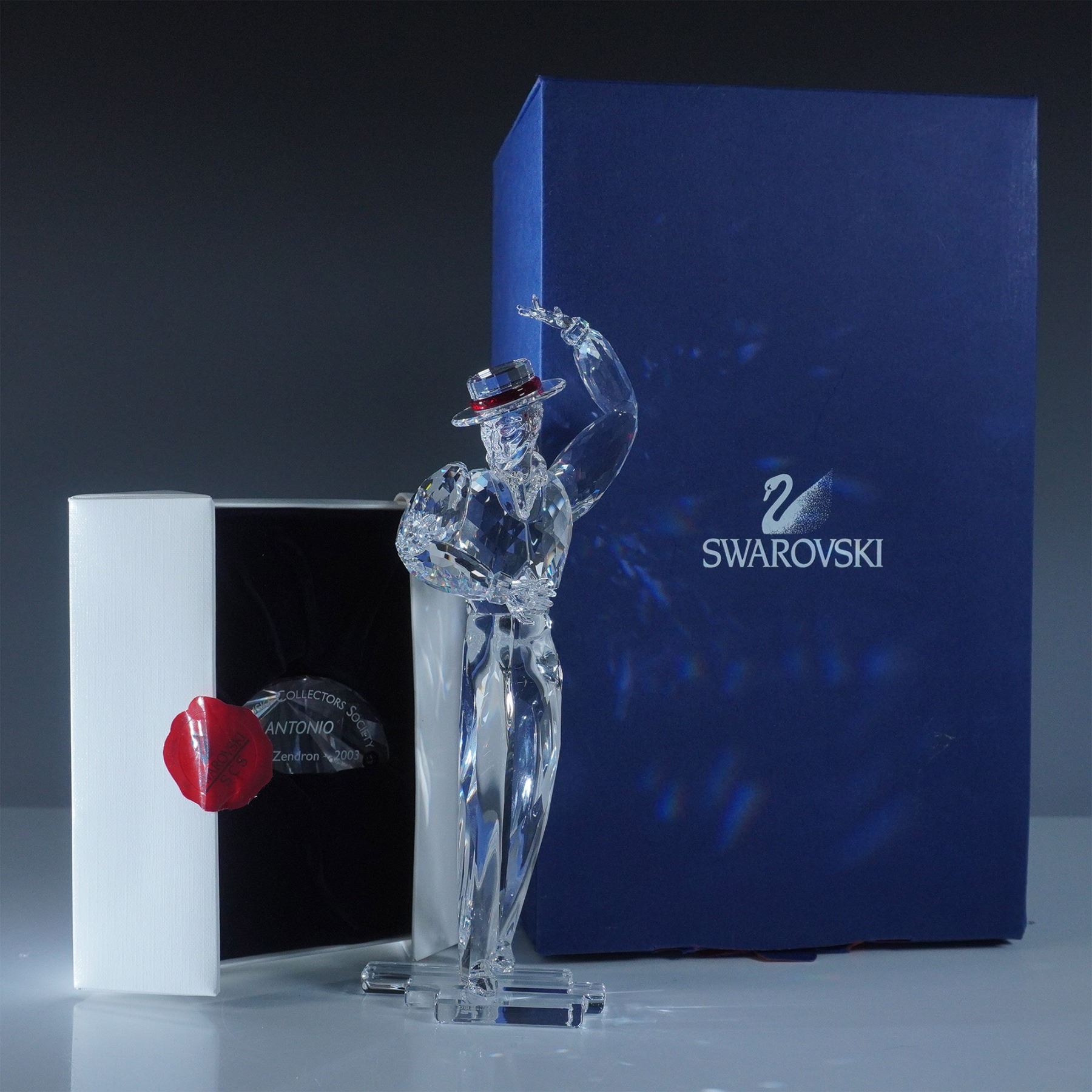 Swarovski SCS Antonio, model number 606441, designed by Martin Zendron. Released in 2003 as the second piece in the Magic of Dance trilogy, this striking figurine captures the passion and elegance of the Flamenco dancer Antonio. Crafted in clear faceted crystal, he wears a red crystal-accented hat and gracefully holds a fan in one hand. This limited-edition piece was available exclusively to Swarovski Crystal Society (SCS) members. Included in this lot are the original box, certificate, and matching title plaque.