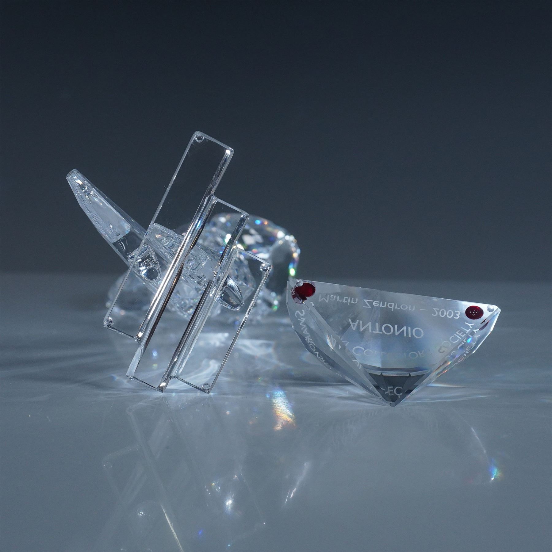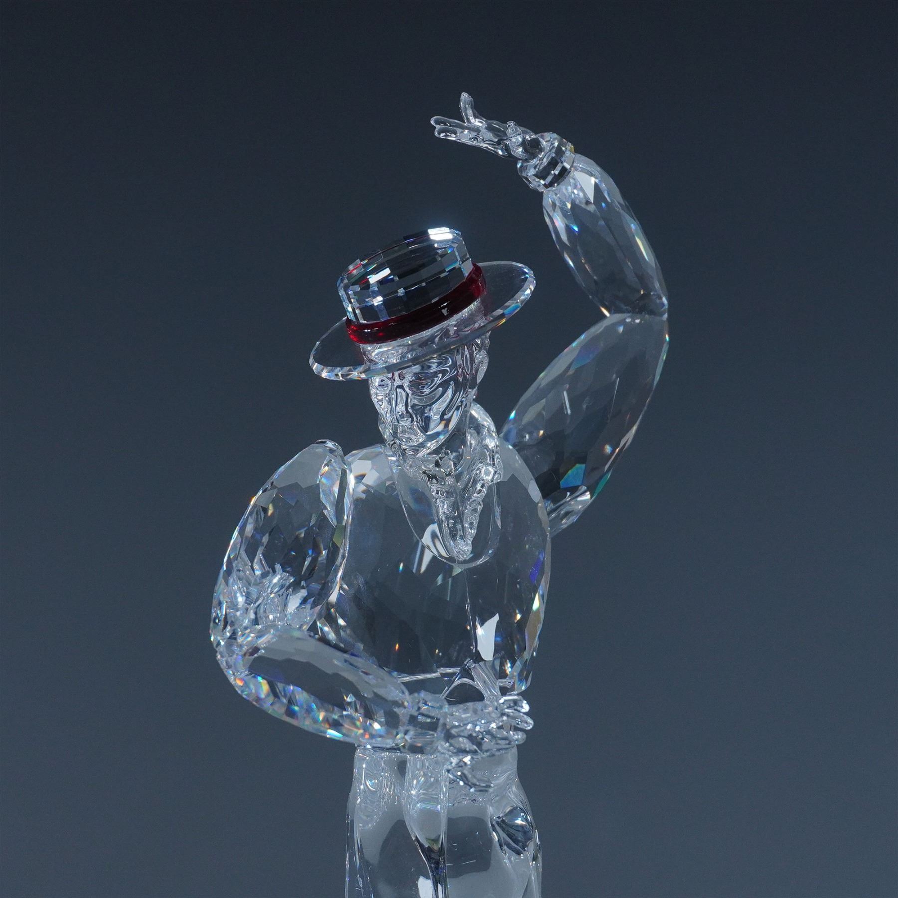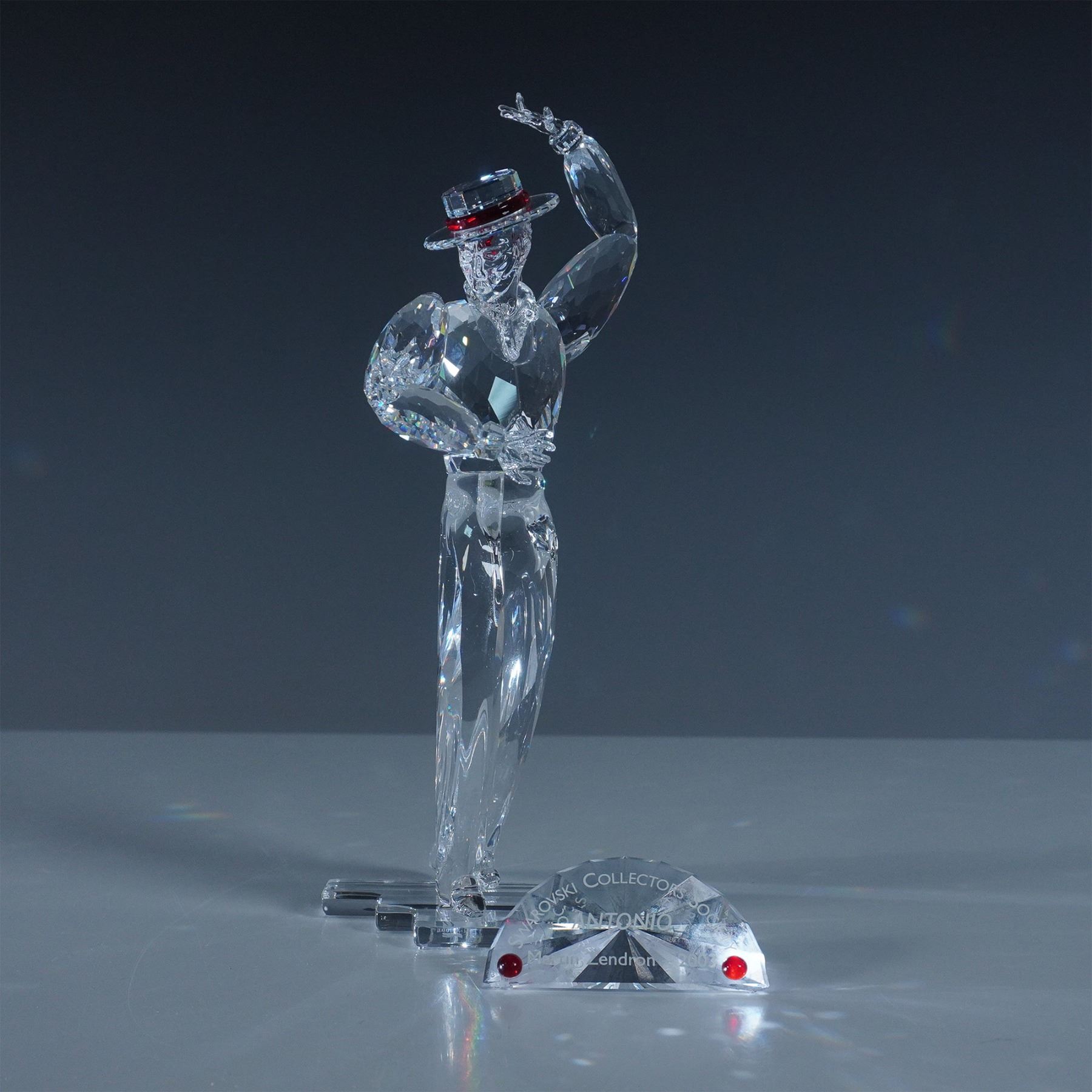 Swarovski SCS Antonio, model number 606441, designed by Martin Zendron. Released in 2003 as the second piece in the Magic of Dance trilogy, this striking figurine captures the passion and elegance of the Flamenco dancer Antonio. Crafted in clear faceted crystal, he wears a red crystal-accented hat and gracefully holds a fan in one hand. This limited-edition piece was available exclusively to Swarovski Crystal Society (SCS) members. Included in this lot are the original box, certificate, and matching title plaque.