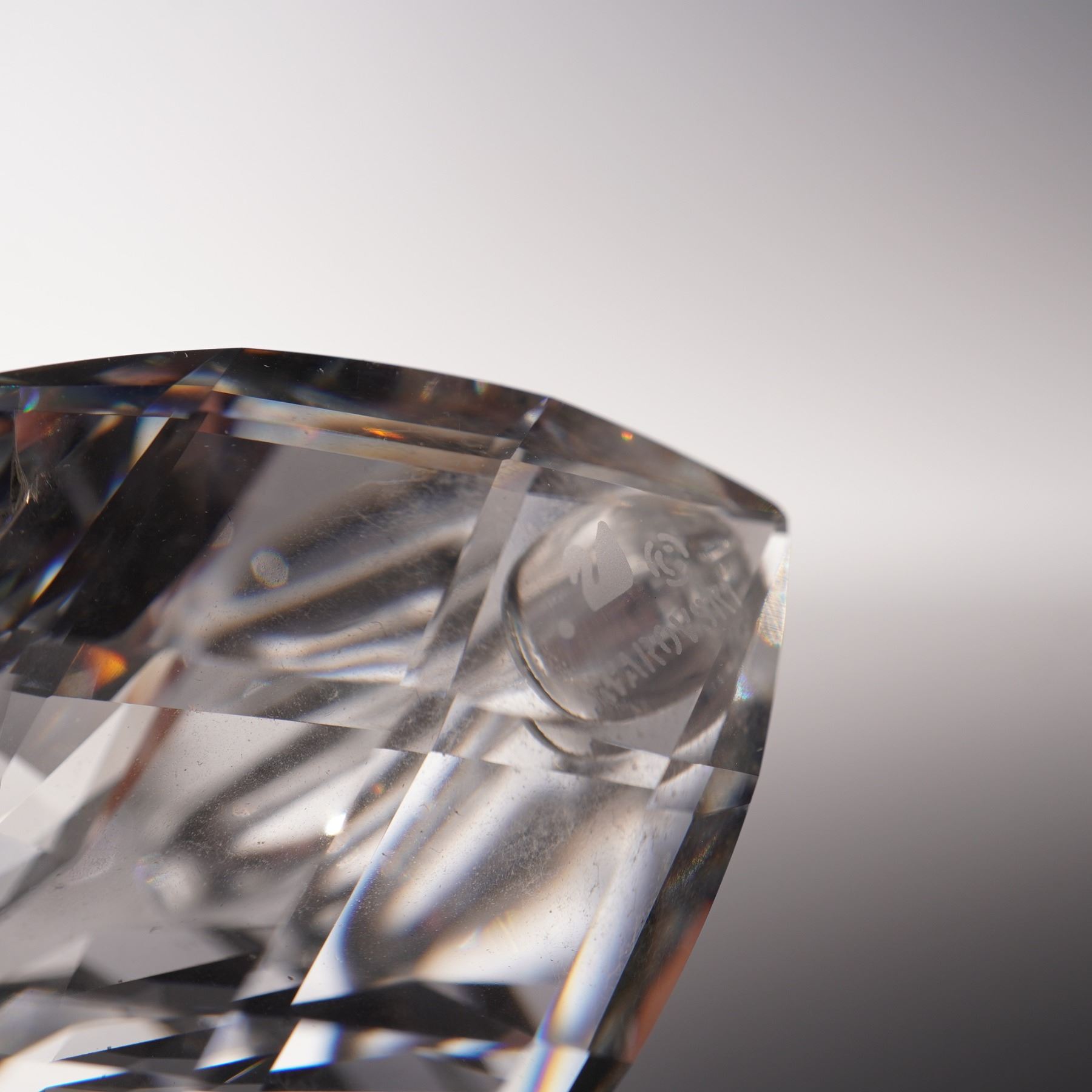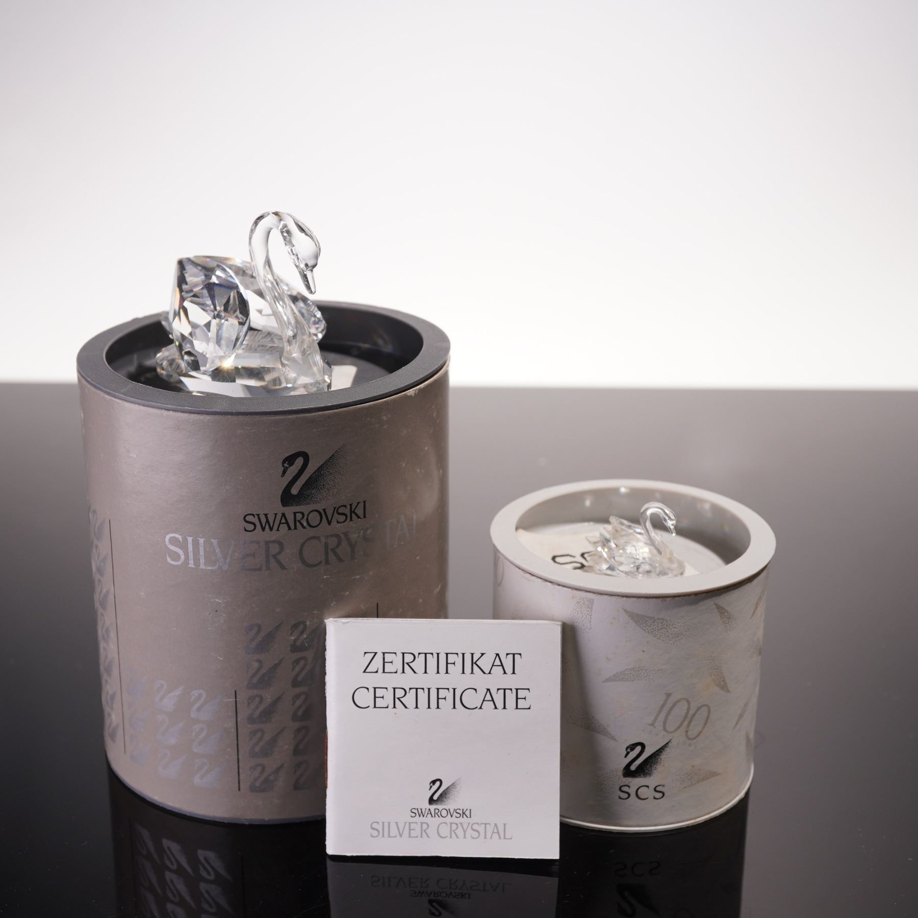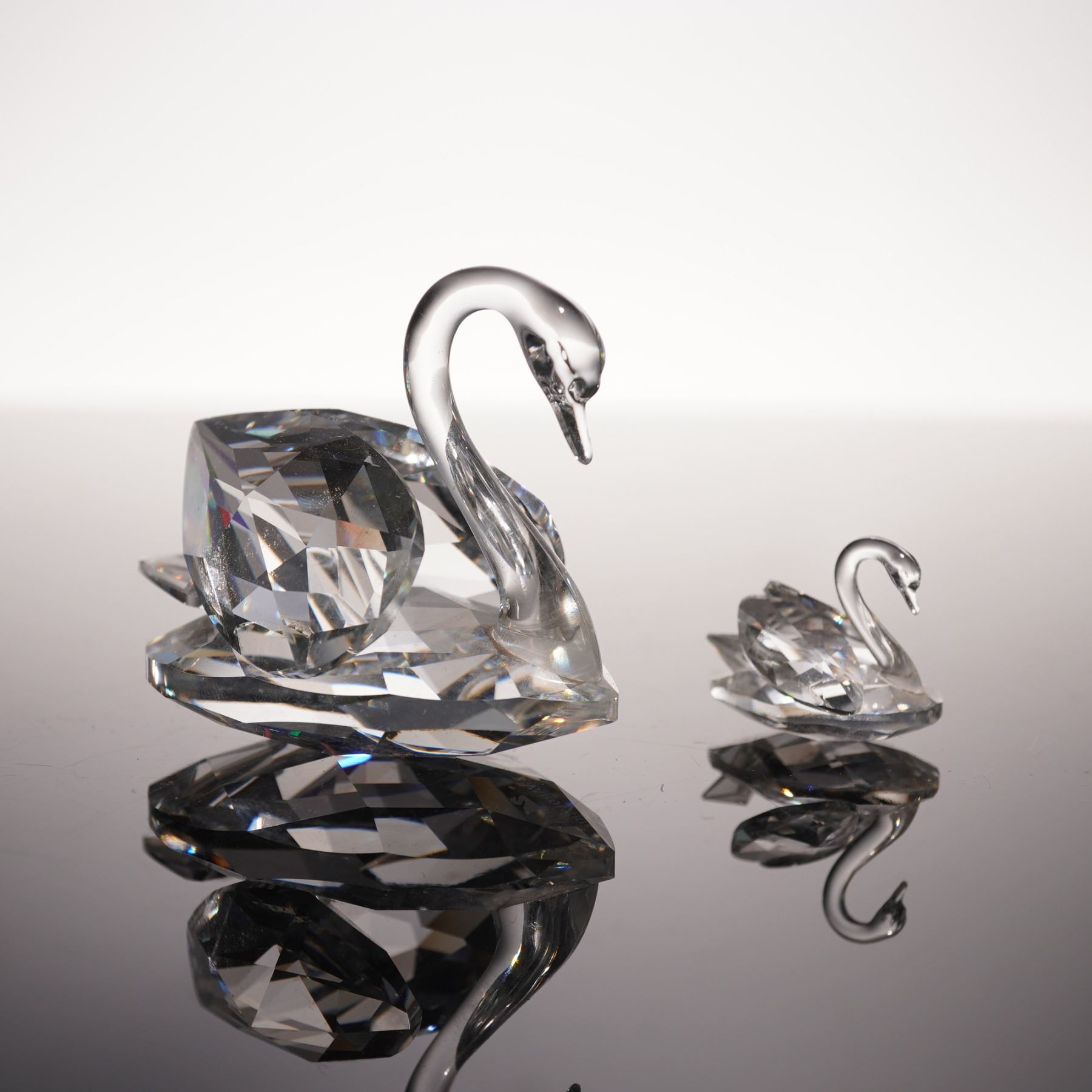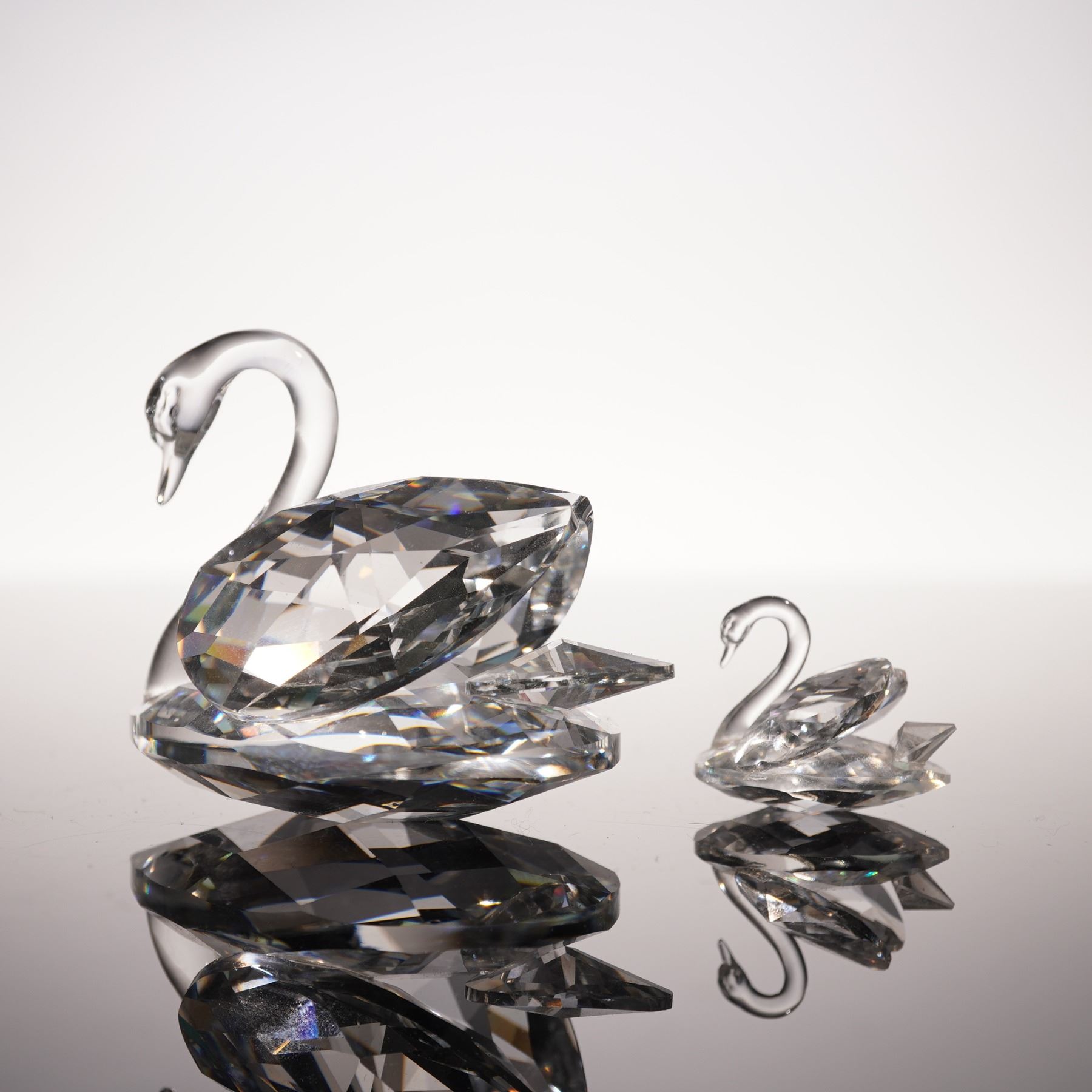 Two silver crystal swan figurines, rendered in faceted crystal, the larger swan displaying broad, multi-angled planes that refract light into prismatic brilliance, while the smaller counterpart mirrors the form in more delicate proportion. Swarovski backstamp. This item has its original boxes.