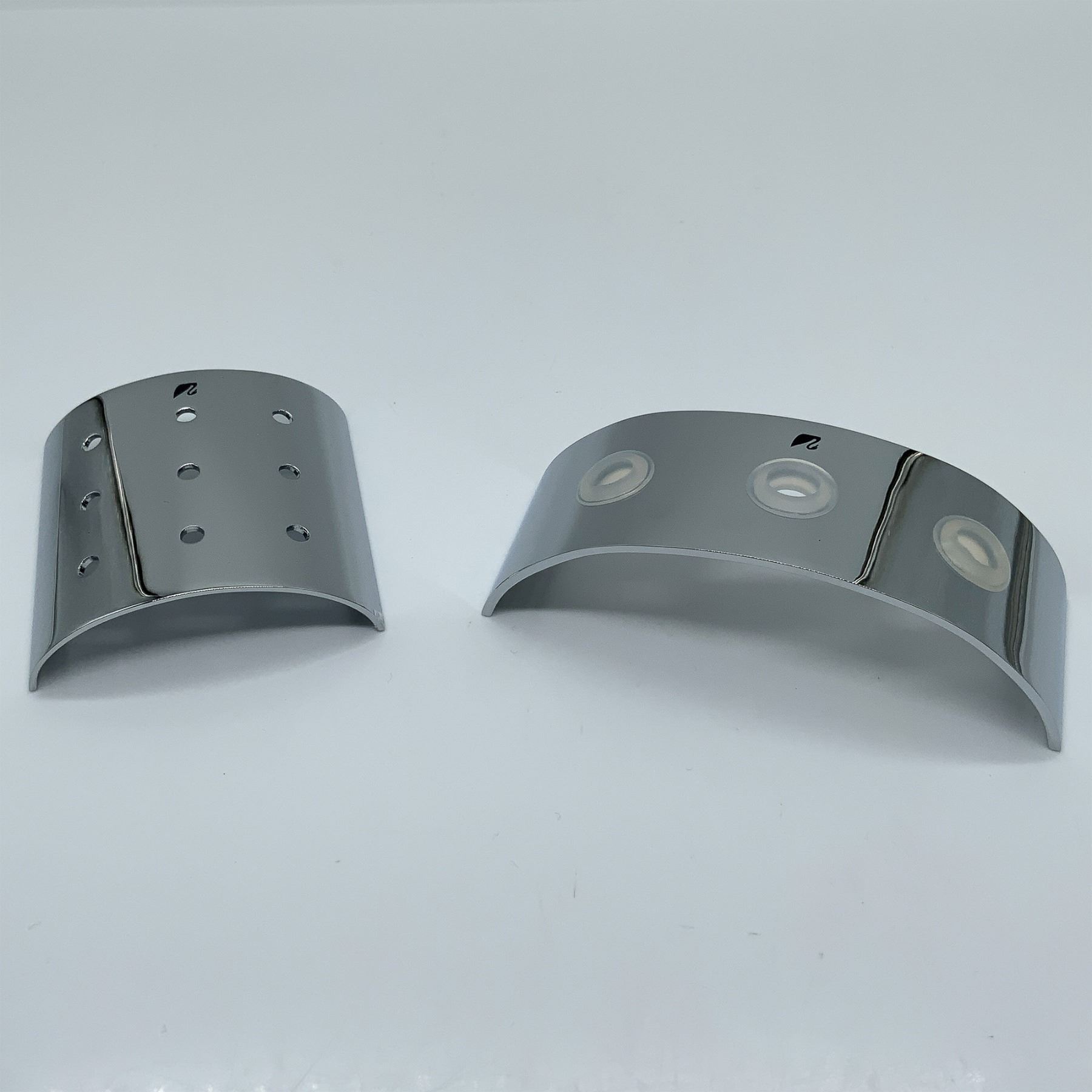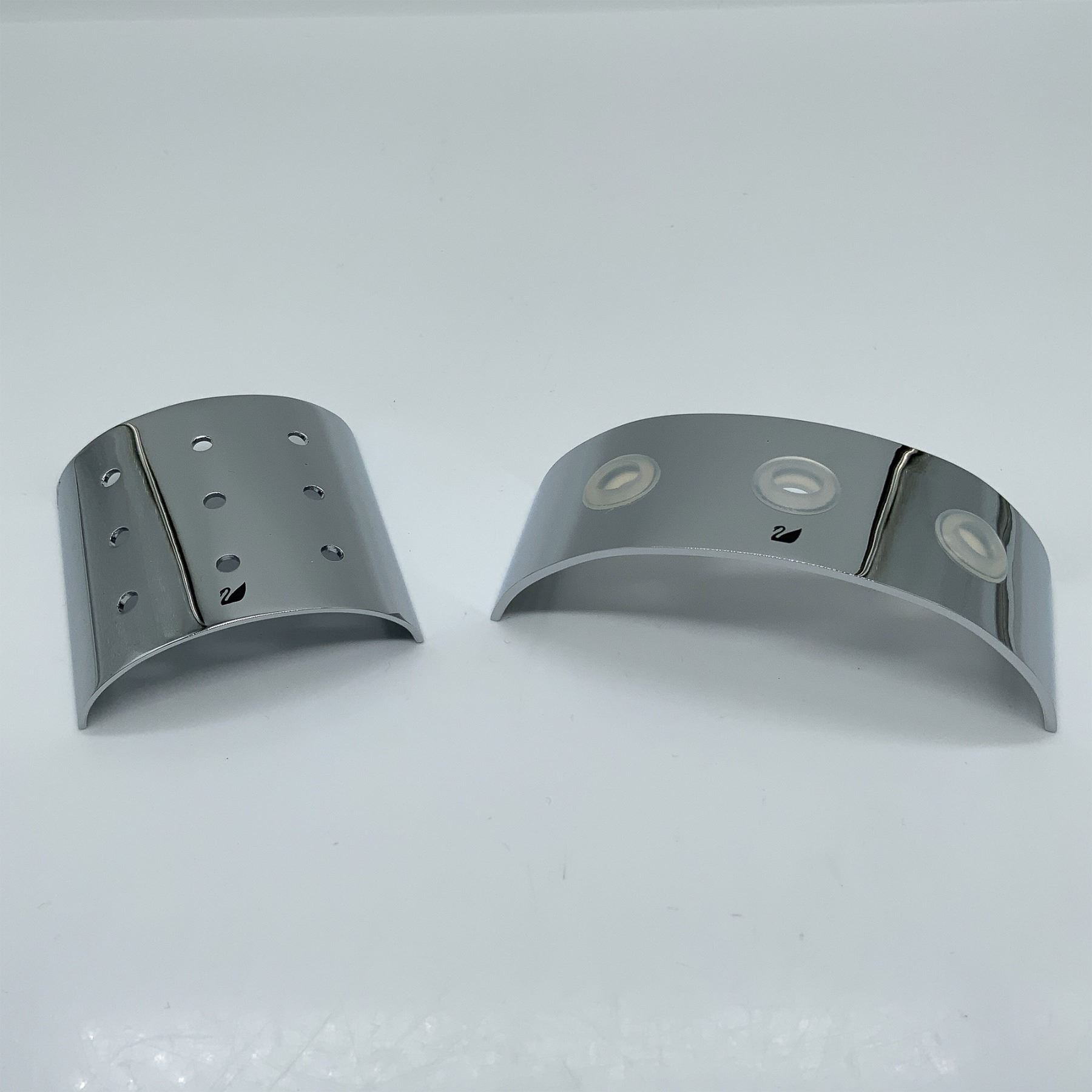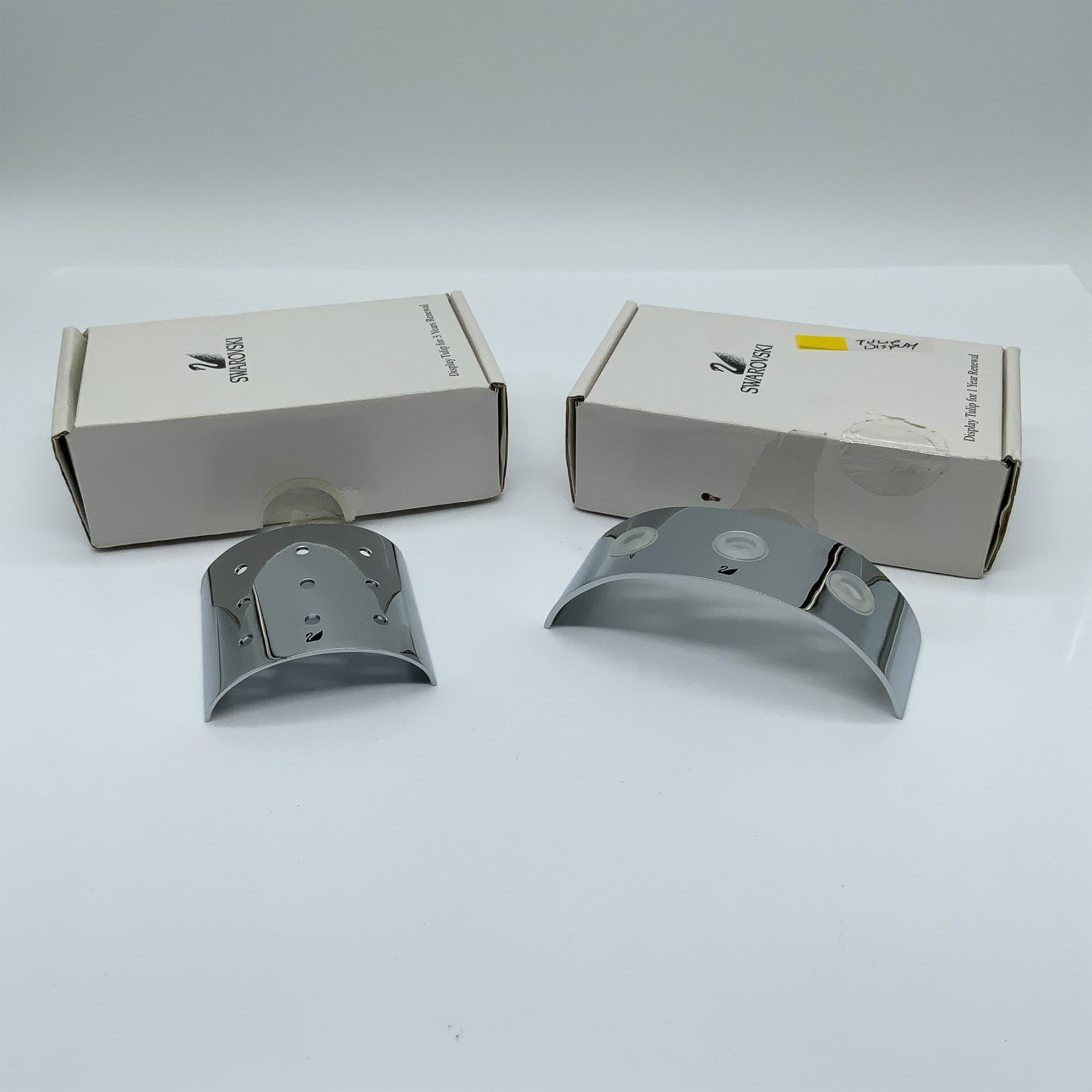 This lot features a pair of Swarovski display stands designed specifically for tulip renewal promotions. The set includes one stand for a 1-year renewal and another for a 3-year renewal, both crafted with a polished chrome finish. Each display incorporates a sleek and modern design, with the 1-year renewal stand featuring perforated holes and the 3-year renewal stand adorned with integrated ring details. These pieces are excellent for showcasing Swarovski tulip-themed promotional items or as collectibles. The largest display measures 1.25 inches in height and both are presented in their original Swarovski packaging. This item has its original box.